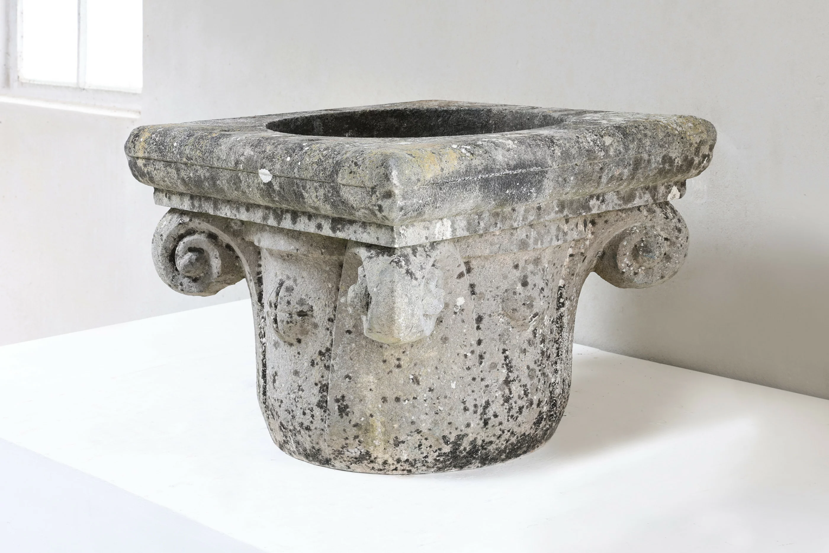 Kompakte Brunneneinfassung in Form eines Kapitells mit Voluten, aus einem einzigen Block harten Kalksteins von Hand gehauen. Mit einer Außenmaß von 56 × 56 cm und einer Höhe von ca. 44 cm eignet sich das Stück ideal als Brunnenbasis, Pflanzgefäß oder skulpturaler Blickfang in Hof und Garten.