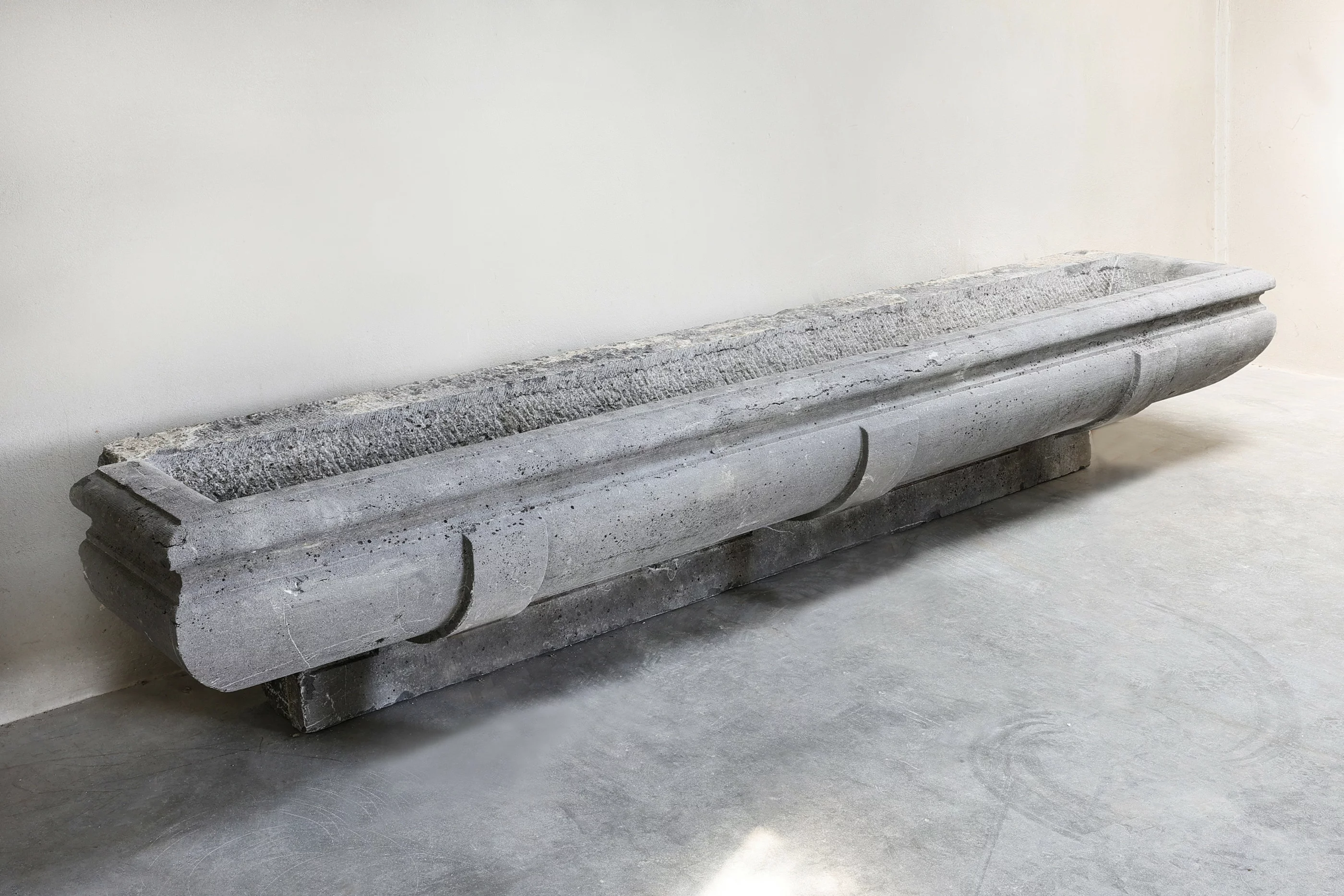 Dieser antike Steintrog wurde zwischen 1860 und 1880 aus hochwertigem belgischem Blaustein gefertigt. Er misst 305 cm in der Länge, 54 cm in der Breite und 54 cm in der Höhe und wiegt etwa 1000 kg. Der Trog befindet sich in perfektem Zustand und besticht durch sein schönes Design und seine langlebige Qualität.