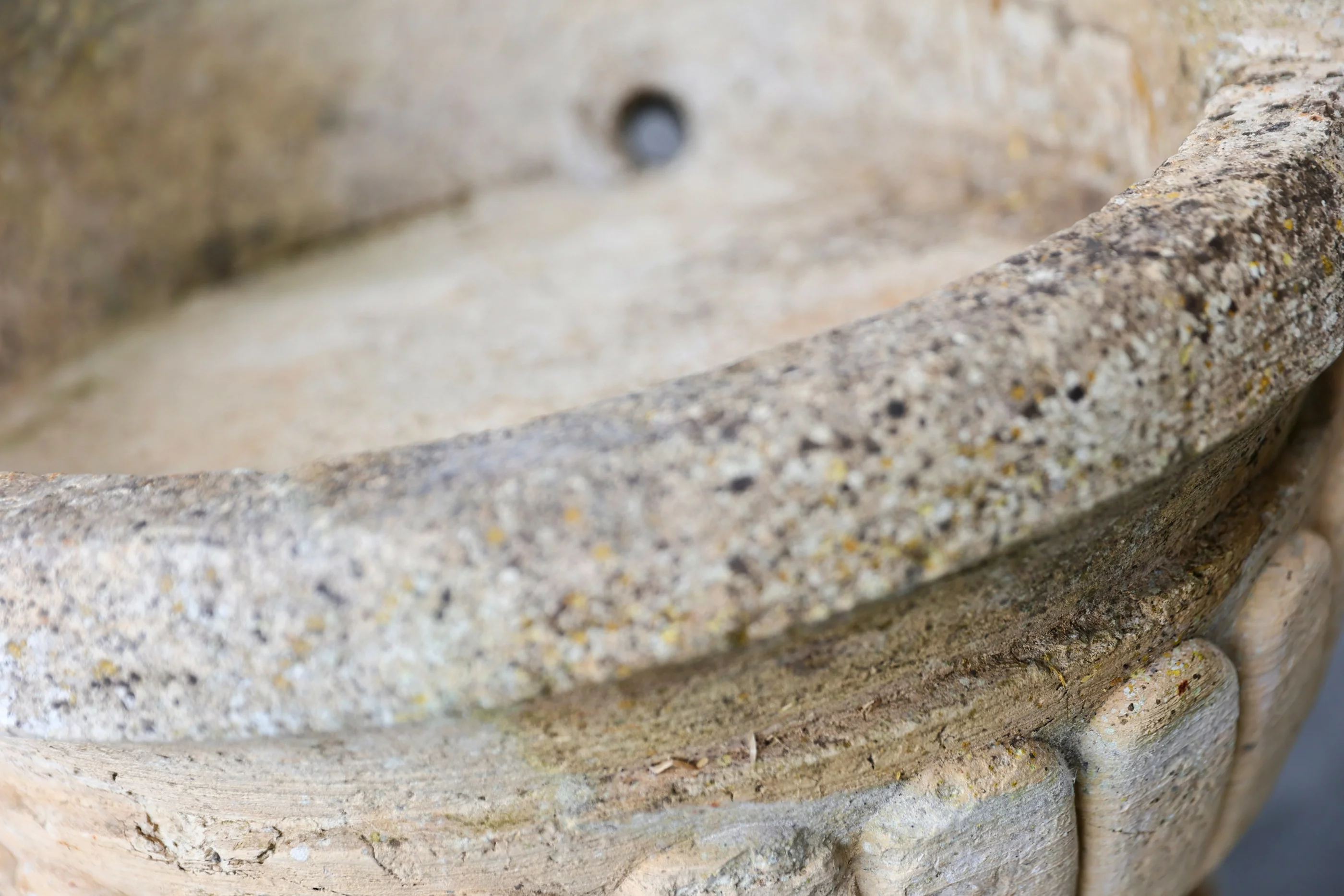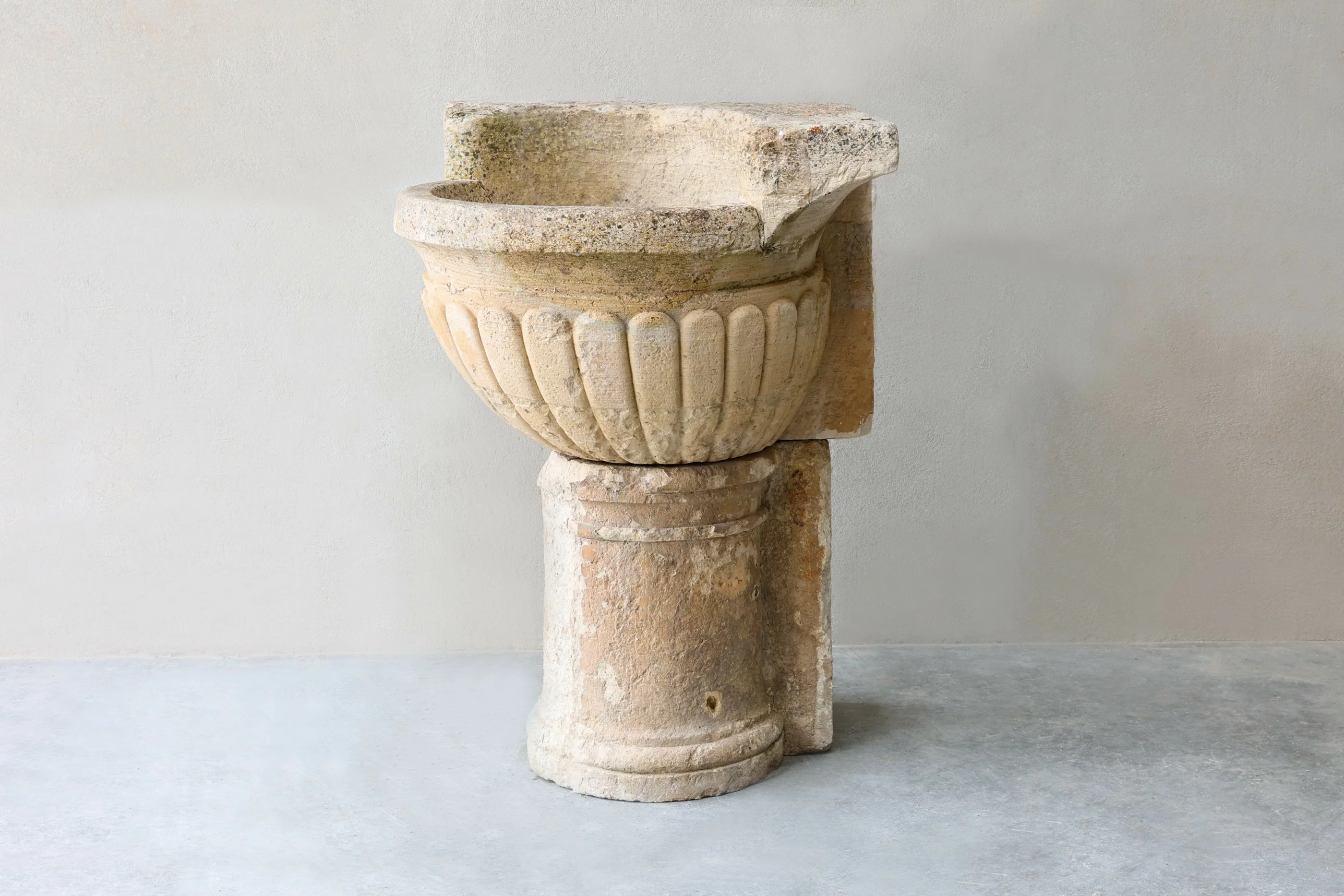 Verleihen Sie Ihrem Außenbereich oder Interieur zeitlose Eleganz mit diesem prachtvollen antiken Natursteinbrunnen. Dieses authentische Erbstück aus massivem Kalkstein strahlt den Charme und die Grandezza vergangener Jahrhunderte aus. Die handgehauene Schale mit Relief und der robuste Sockel machen dieses Stück zu einem wahren Blickfang für alle, die Exklusivität und Authentizität schätzen.