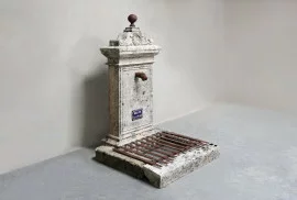 Der massive Sockel mit integriertem Rost verleiht dem Objekt eine stabile Wirkung. Der Brunnen kann auf Wunsch funktionstüchtig gemacht werden – etwa mit einem geschlossenen Wasserkreislauf oder einer verdeckten Pumpe.