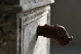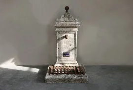 Dieser frei stehende Wandbrunnen stammt aus einem südfranzösischen Dorf und wurde um 1930 als öffentliche Wasserstelle genutzt. Aus massivem Kalkstein gearbeitet, mit originalem Bronzetülle, Eisenrost und emailliertem Metallschild ("Eau de la Ville"), trägt er deutliche Spuren von Zeit, Nutzung und Witterung.