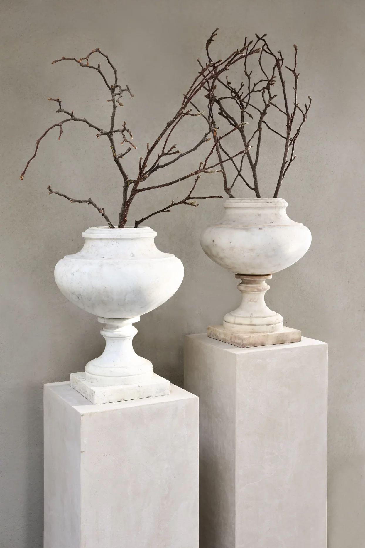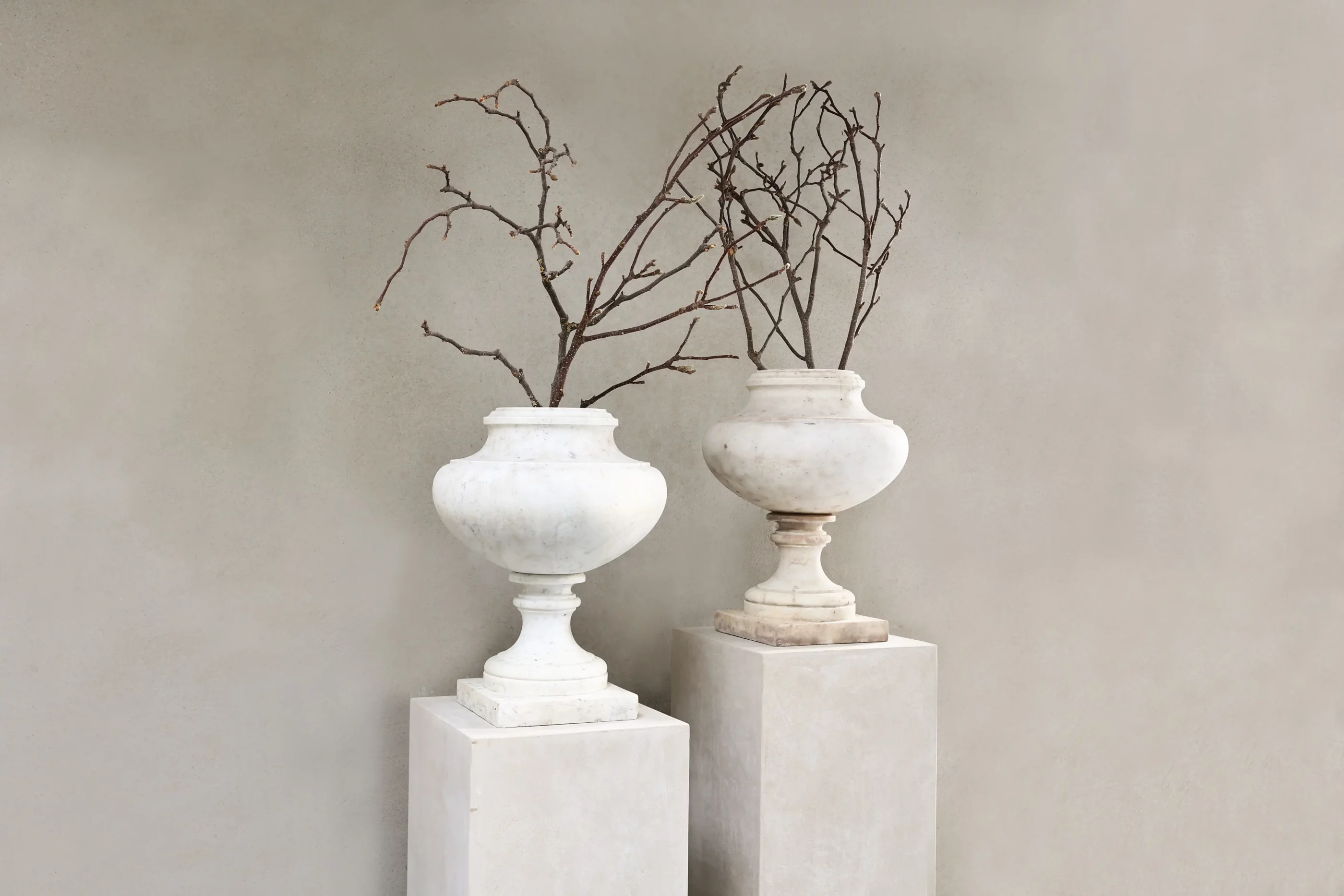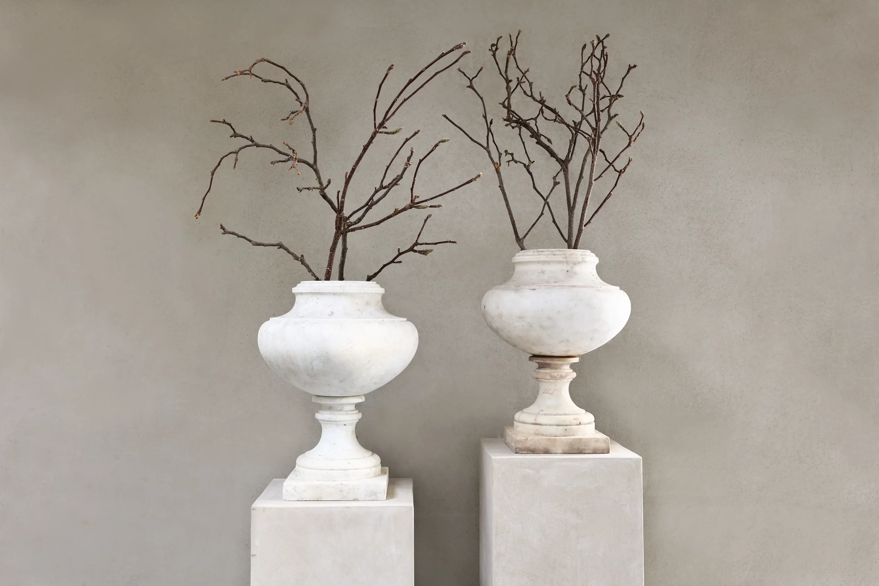 Gefertigt aus weißem Marmor, folgt dieses Paar einer zurückhaltenden, architektonischen Formensprache, wie sie um 1900 im Umfeld klassizistischer Wiederaufnahmen verbreitet war. Die klaren Profile und ruhigen Proportionen unterstützen eine saubere Integration in Planung und Styling.