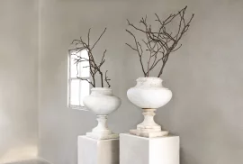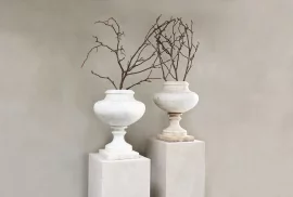 Gefertigt aus weißem Marmor, folgt dieses Paar einer zurückhaltenden, architektonischen Formensprache, wie sie um 1900 im Umfeld klassizistischer Wiederaufnahmen verbreitet war. Die klaren Profile und ruhigen Proportionen unterstützen eine saubere Integration in Planung und Styling.