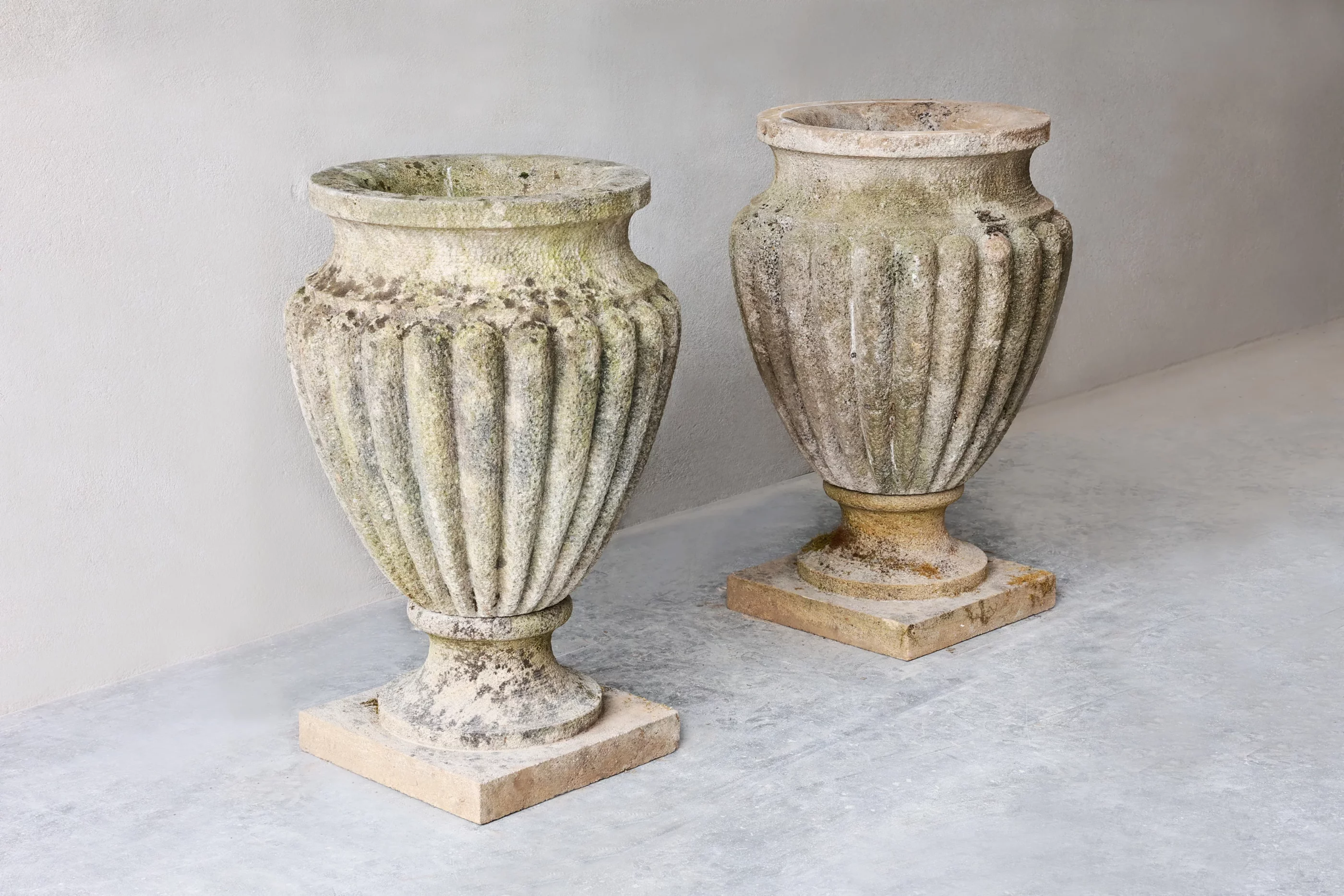Diese massiven Kalksteinvasen stammen aus der Zeit um 1950 und zeigen ein tief eingeschnittenes Rillenmuster. Die Oberfläche ist von Natur aus verwittert und mit Moosansätzen patiniert – ideal für historische Gartenanlagen, Innenhöfe oder elegante Eingangsbereiche.