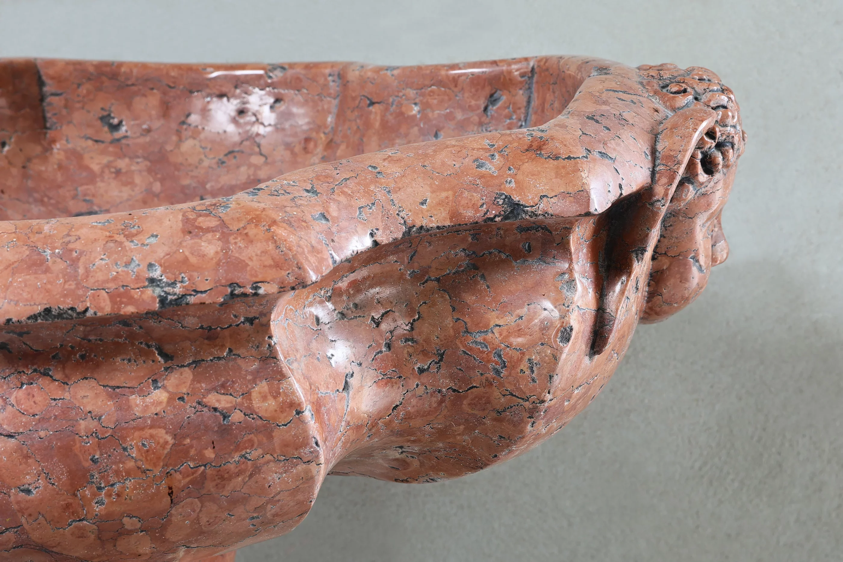 Dieses seltene antike Taufbecken aus dem 18. Jahrhundert ist handgehauen aus Rosso Verona, dem klassischen roten Marmor Norditaliens, der seit der Antike für seinen warmen Farbton und die feine Aderung geschätzt wird. Die gelappte Schale ruht auf einem balusterförmigen Schaft und einer profilierten, mehrkantigen Basis. Maskarons an der Außenseite der Schale unterstreichen die barocke Formensprache und die hohe Steinmetzkunst der Epoche.