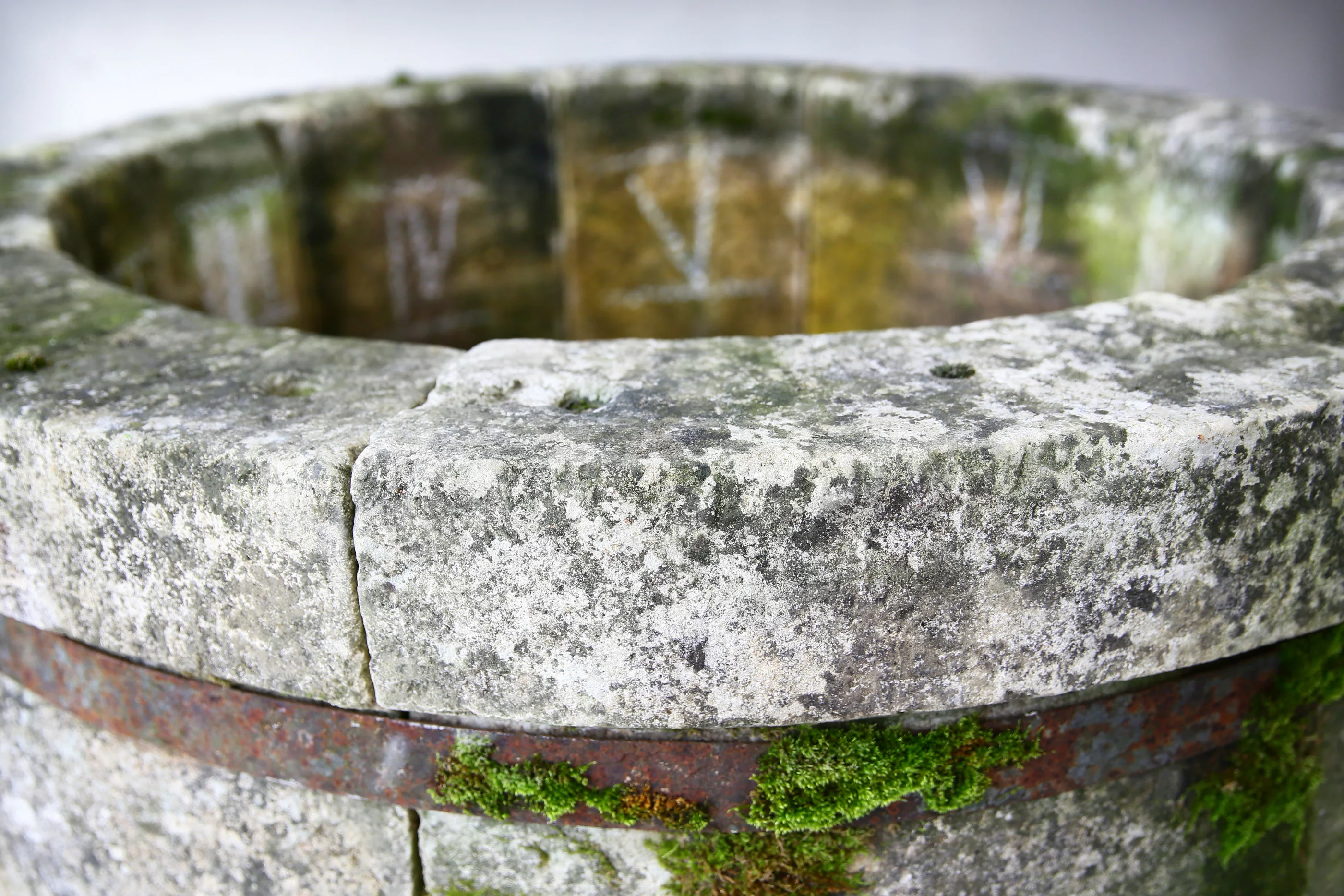 Monumentaler französischer Kalksteinbrunnen aus dem 18. Jahrhundert. Dieser antike Brunnen wurde perfekt von Hand geschnitzt und zeichnet sich durch typische Kurven im Louis XIV-Stil aus. Beachten Sie den Zustand und die schöne Patina, die mit Moos und Flechten verwittert ist. Dies ändert sich mit den Jahreszeiten.
