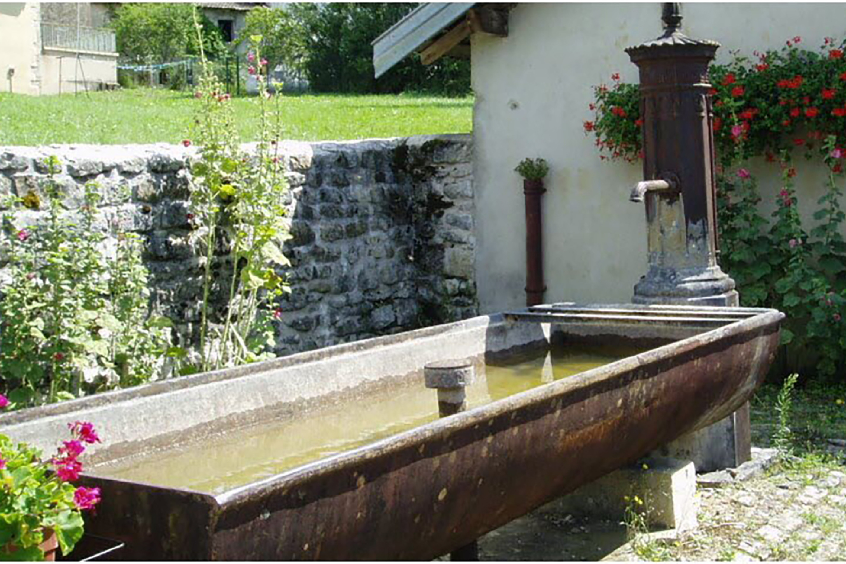 Schöne antike Trinkschale aus Gusseisen von 1885. Dieser alte französische Gusseisentrog stammt aus der Gießerei (Fonterie) von Varigney Haute Saone und wurde früher als Trinkschale am Dorfeingang verwendet, um Leute willkommen zu heißen, die das Dorf besuchten.