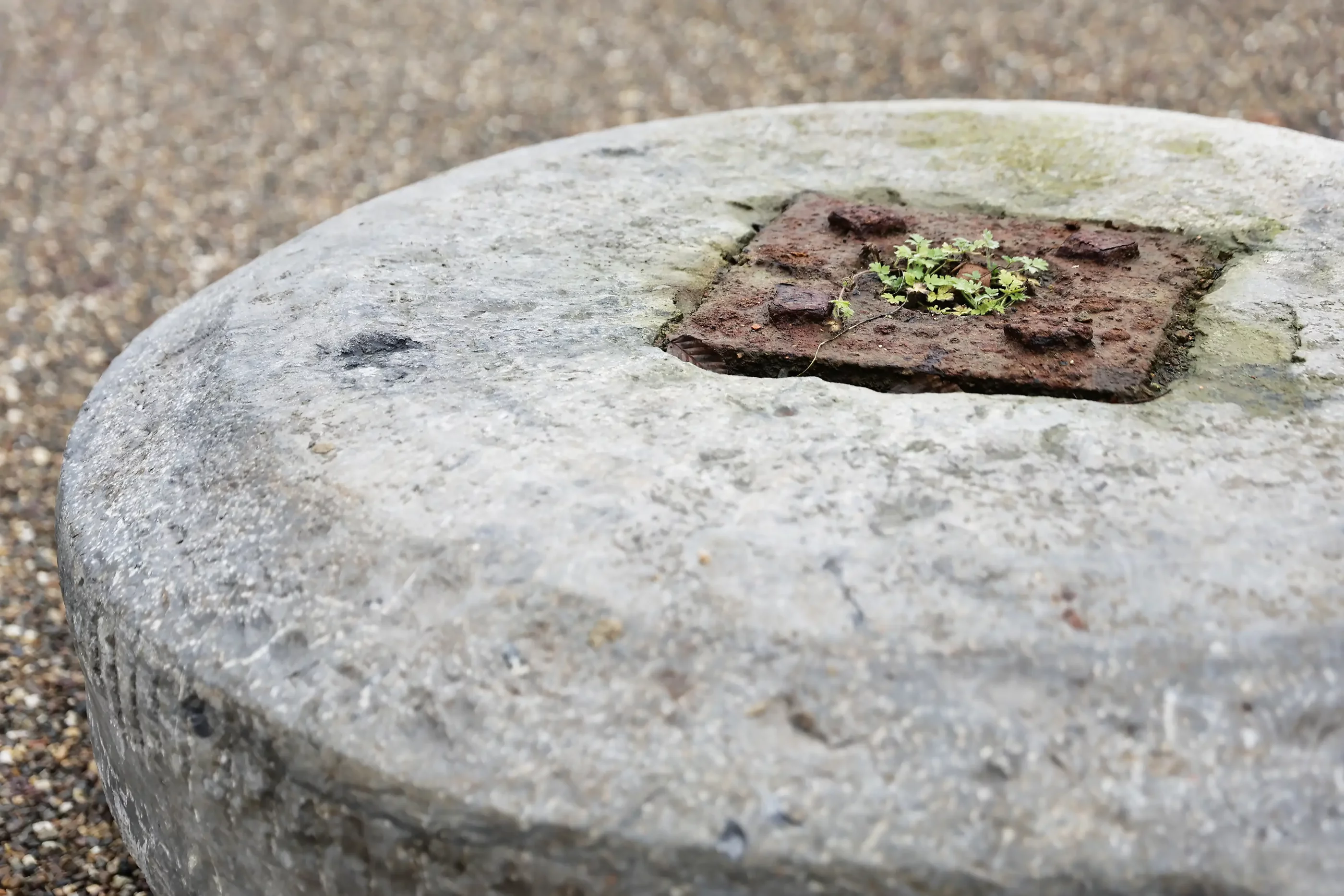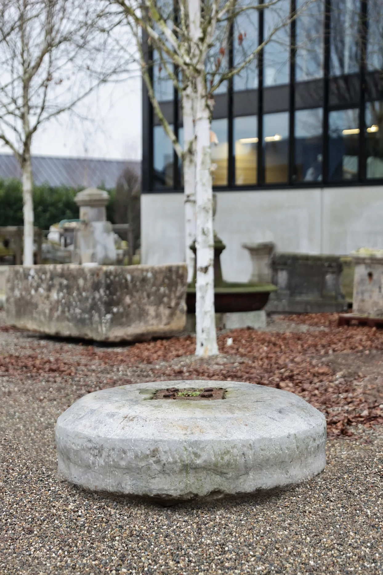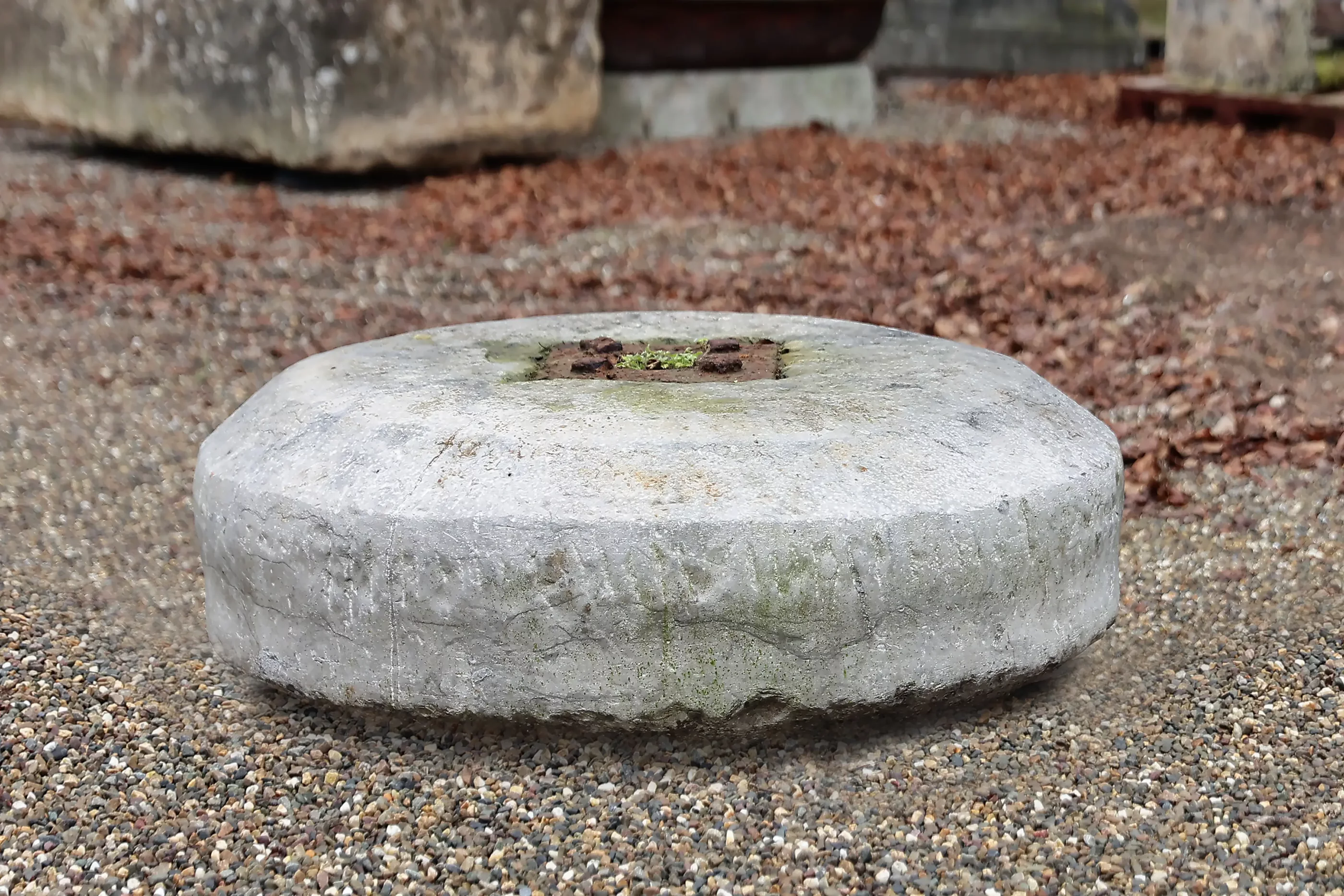 Dank seiner kompakten, runden Form lässt sich der Mühlstein leicht platzieren und vielseitig einsetzen: als dekoratives Element, niedriger Tisch, Sockel für ein Objekt oder sogar als robuste Sitzgelegenheit. Die zentrale Öffnung und die sichtbaren Gebrauchsspuren unterstreichen die Authentizität und verleihen Charakter, ohne dominant zu wirken.