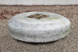 Dank seiner kompakten, runden Form lässt sich der Mühlstein leicht platzieren und vielseitig einsetzen: als dekoratives Element, niedriger Tisch, Sockel für ein Objekt oder sogar als robuste Sitzgelegenheit. Die zentrale Öffnung und die sichtbaren Gebrauchsspuren unterstreichen die Authentizität und verleihen Charakter, ohne dominant zu wirken.
