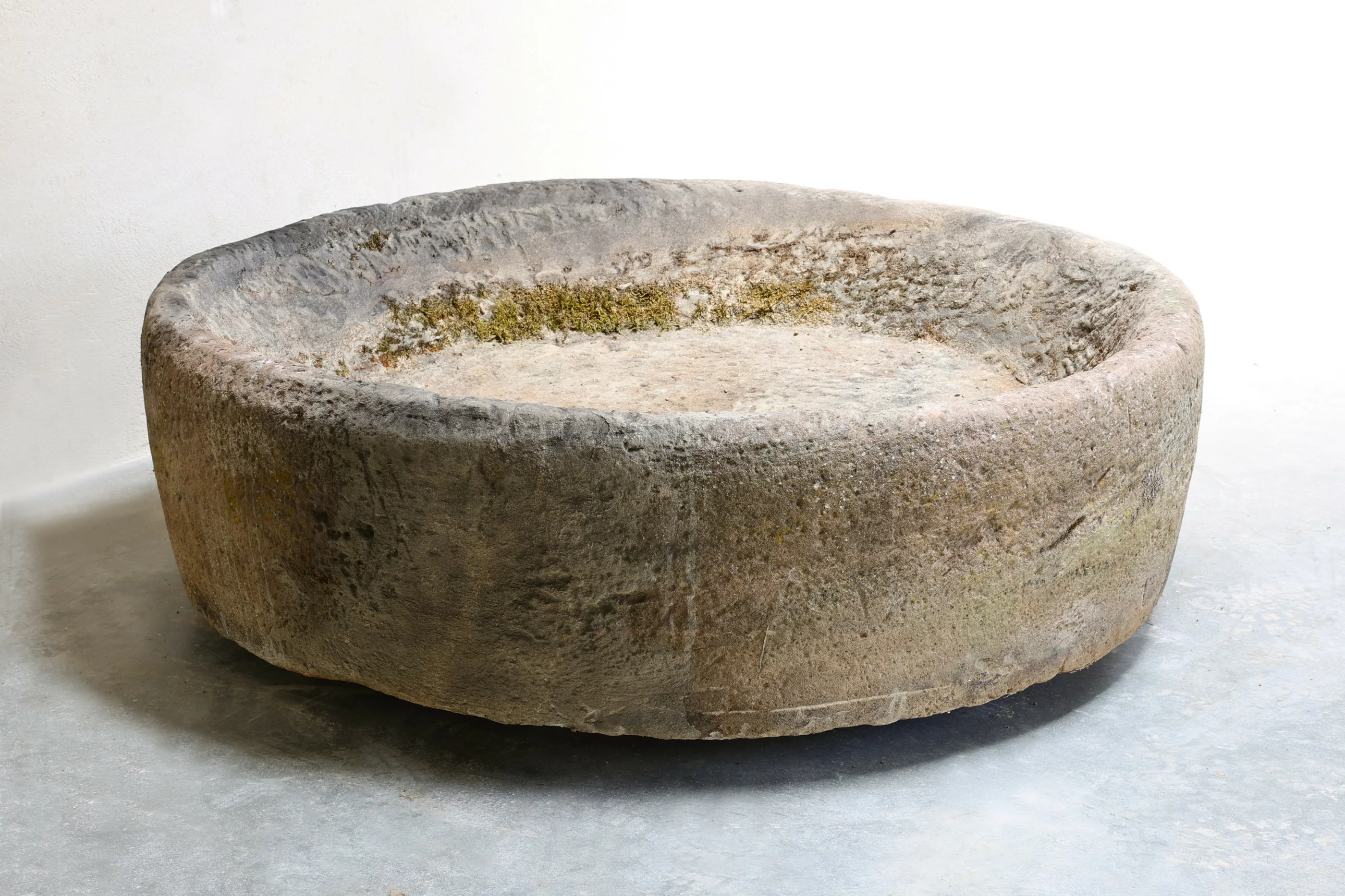 Dieses Objekt war ursprünglich ein antiker runder Wasser- oder Futtertrog, handgehauen aus einem massiven Steinblock. Durch seine markante runde Form und die relativ tiefe Aushöhlung unterscheidet er sich deutlich von den häufigeren rechteckigen Modellen. Solche Becken wurden traditionell als Abreuvoirs (Tränken für Vieh oder Pferde) oder gelegentlich als Pierre à eau in Klöstern oder Bauernhöfen genutzt. Möglicherweise diente dieses Exemplar auch als Trauben- oder Olivenpresse.