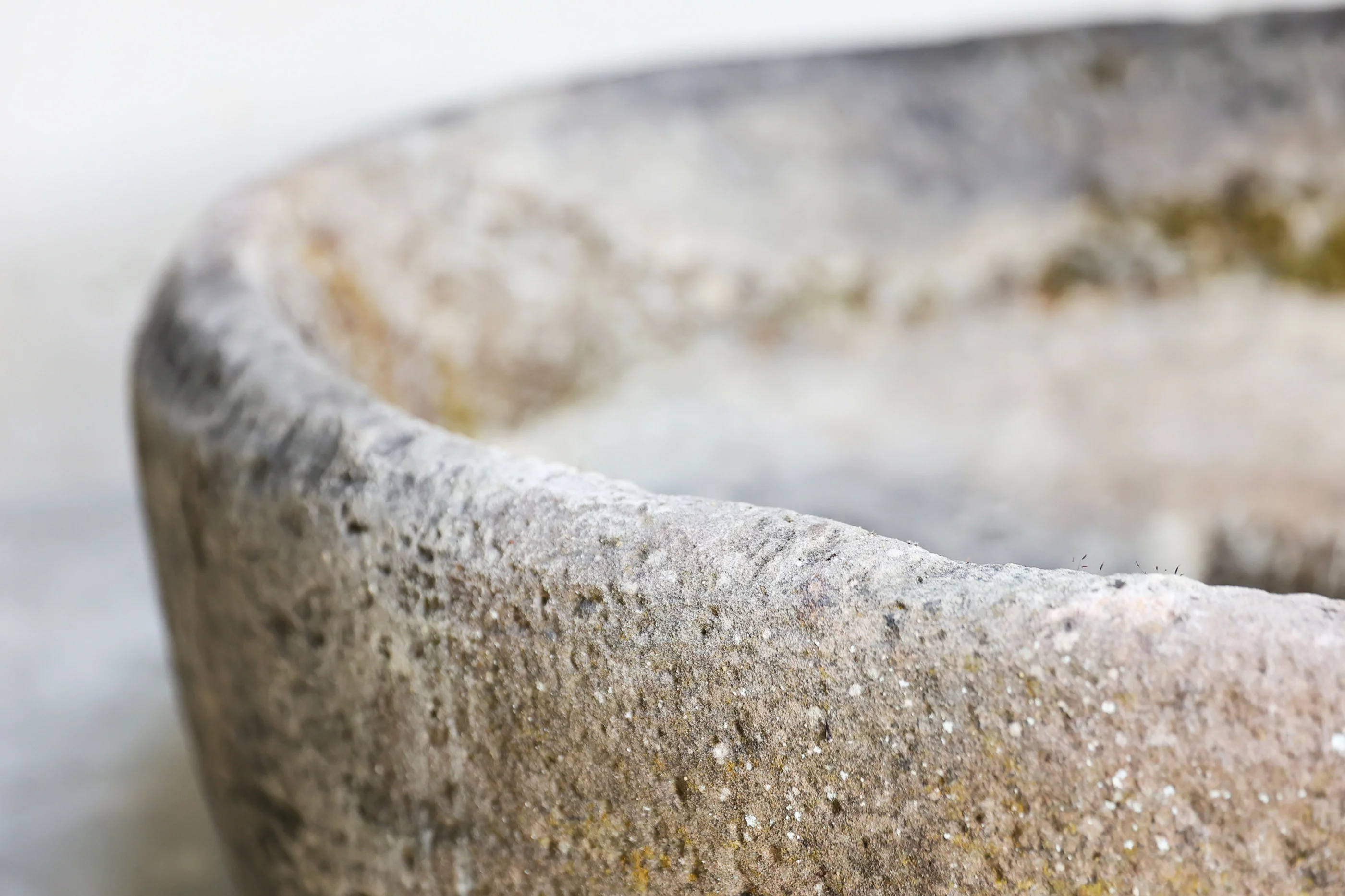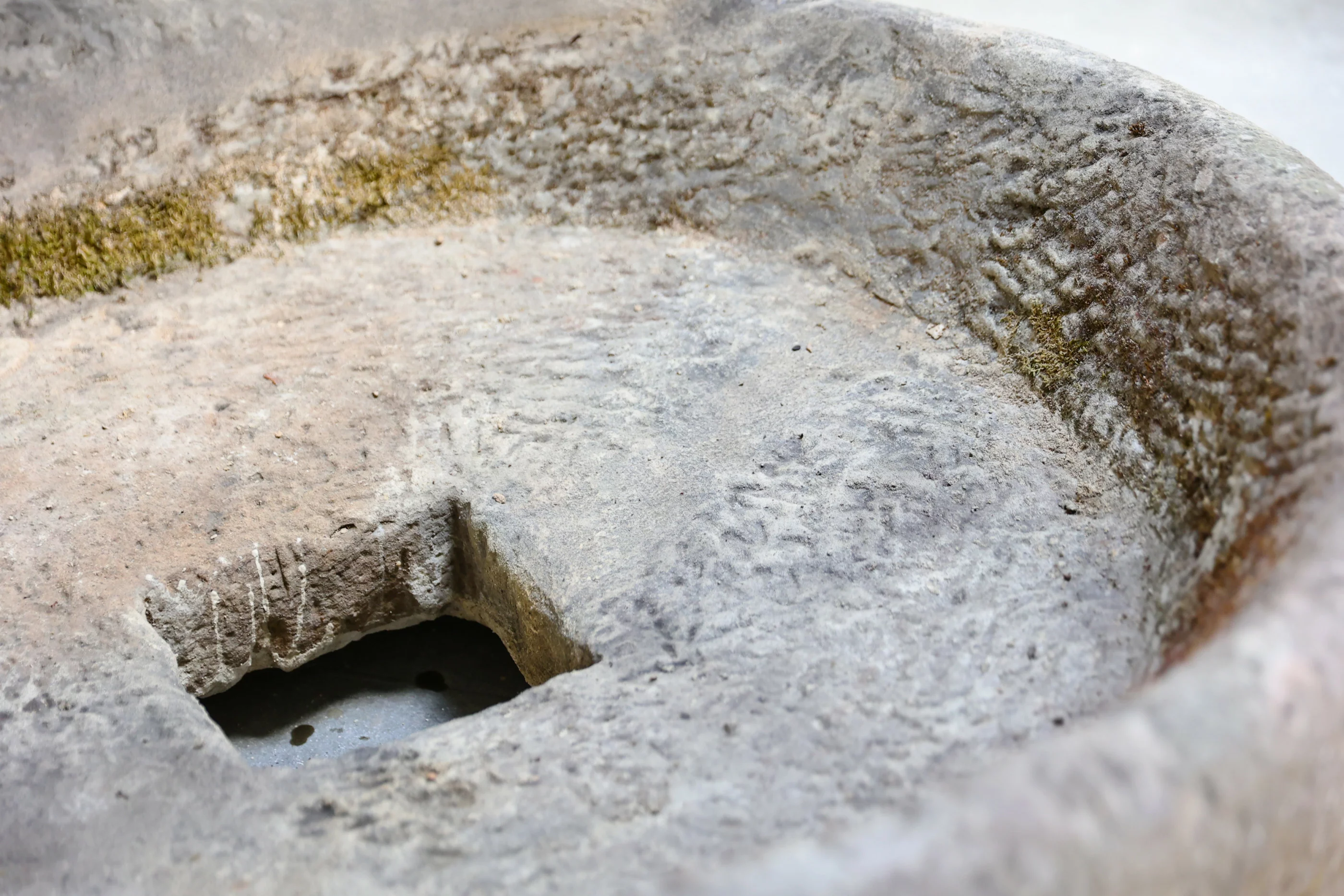 - Poröse Kalk- oder Sandsteinstruktur — mit natürlichen Spuren von Moos und Flechten.