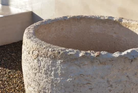Als runder Steintrog funktioniert es als Solitär auf Kies, in einer Parterre-Anlage oder als architektonisches Element am Eingang oder im Innenhof. Der große Durchmesser schafft Präsenz, ohne dekorativ zu wirken.