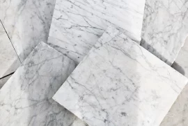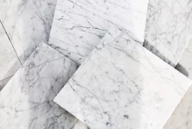 - Carrara‑Marmor (Italien, Toskana); feinkörnig, kühles Weiß‑Grau.