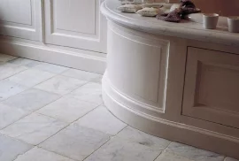 Post vereint Carrara Narmor mit ruhigem Weiß und feiner grauer Aderung. Die Oberfläche zeigt authentische Nutzungsspuren und Patina; die Kanten bewahren traditionelle Handbearbeitung, was nach der Verlegung ein dezentes Fugenschatten‑Bild ergibt. Der Bestand wurde fachgerecht entkalkt, vorsortiert und als zusammenhängender Posten mit stimmigem Farbspiel kuratiert — ideal, wenn echter historischer Naturstein gefragt ist.