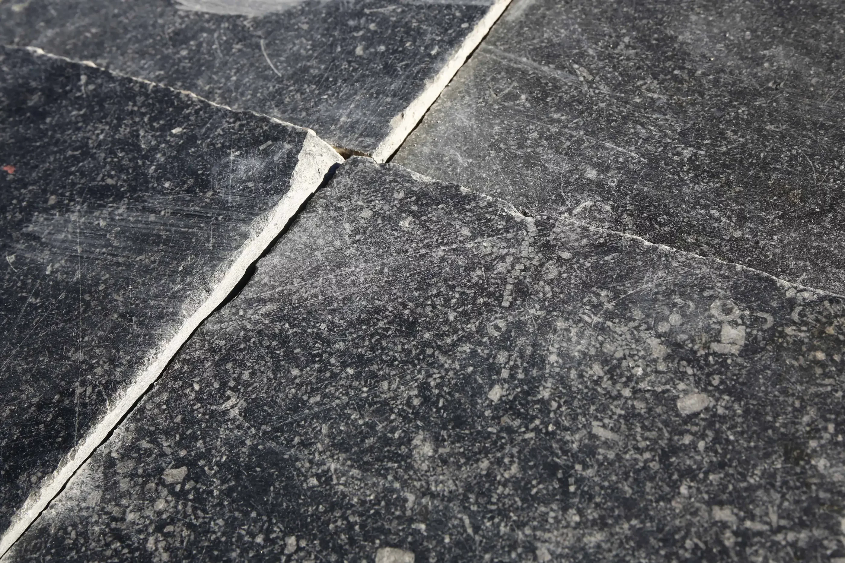 Es handelt sich um einen dunklen Naamse Kalkstein (Noir de Mazy / Basecles-Typ) mit ruhigem, dunkelgrau bis nahezu schwarz wirkendem Farbspiel. Die Oberflächen zeigen eine authentische Patina und leicht abgenutzte Kanten – sichtbare Gebrauchsspuren, die diesen originalen Kirchenboden lebendig wirken lassen, ohne ihn zu grob oder rustikal erscheinen zu lassen.