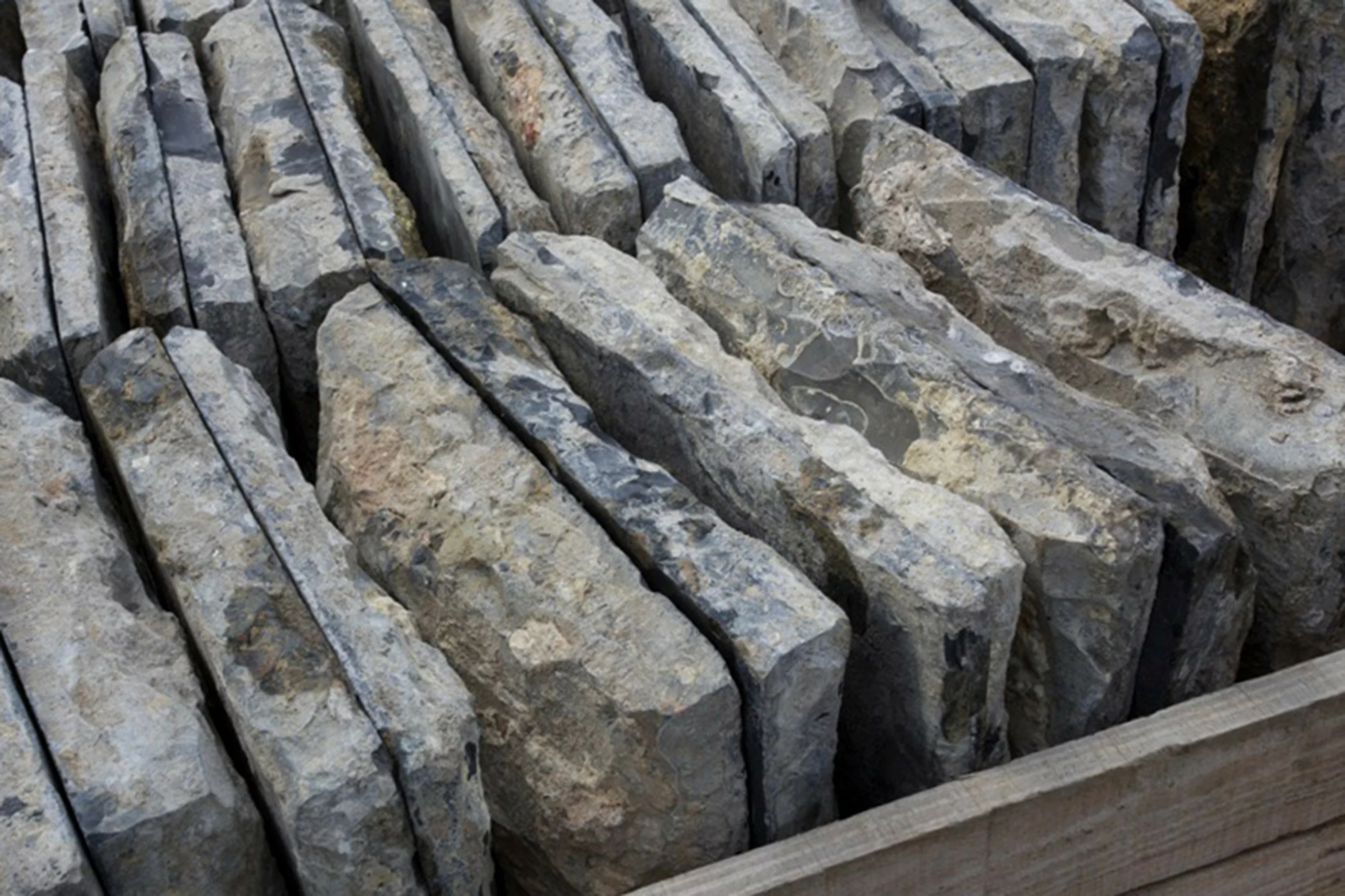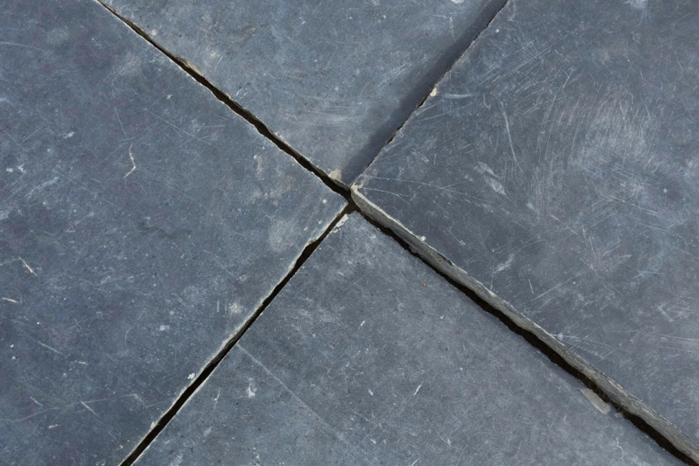 Jede Platte ist handbehauen und zeigt eine authentische Patina mit leicht abgenutzten Kanten und einer natürlich satinierten Oberfläche. Im Gegensatz zu klassischem belgischem Blaustein mit sichtbaren Fossilien wirkt dieser schwarze Kalkstein ruhiger und gleichmäßiger, mit dezent dunkelgrauen Nuancen – ideal für zurückhaltende, hochwertige Innenausbauten.