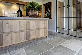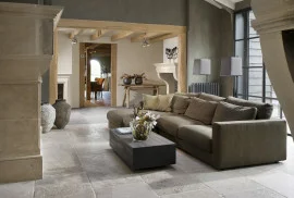 Dieser hochwertige Natursteinboden wird aus französischem Kalkstein gefertigt und in unserer Werkstatt traditionell von Hand gealtert. Die Platten erinnern in Optik und Haptik an die historischen Schlossböden der Bourgogne. Die Farbpalette reicht von warmem Beige bis zu dezenten Grautönen – edel, ruhig und zeitlos.