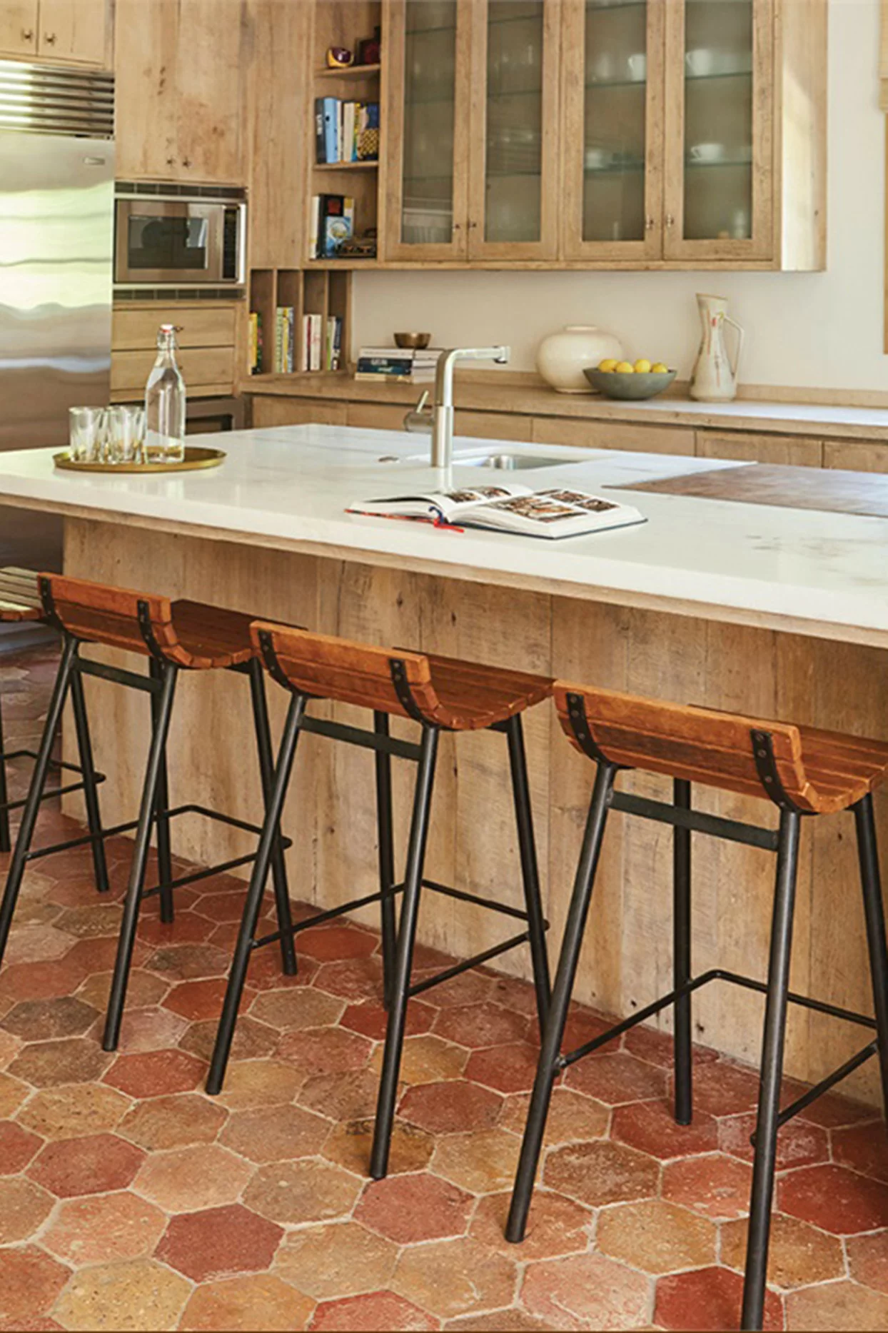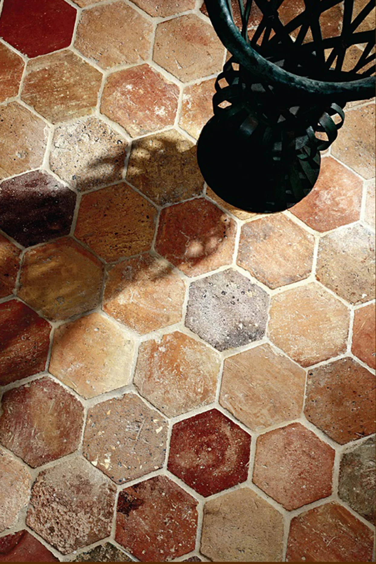 Sehr schöne sechseckige Fliesen in einem rot/braunen Farbschema. Die Form der Bodenfliese lässt diesen Boden leicht anders aussehen.