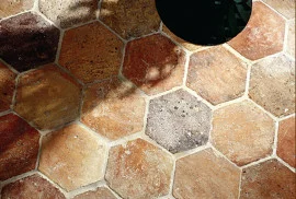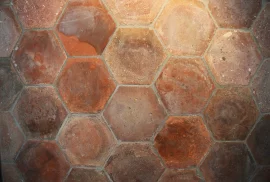 Sehr schöne sechseckige Fliesen in einem rot/braunen Farbschema. Die Form der Bodenfliese lässt diesen Boden leicht anders aussehen.