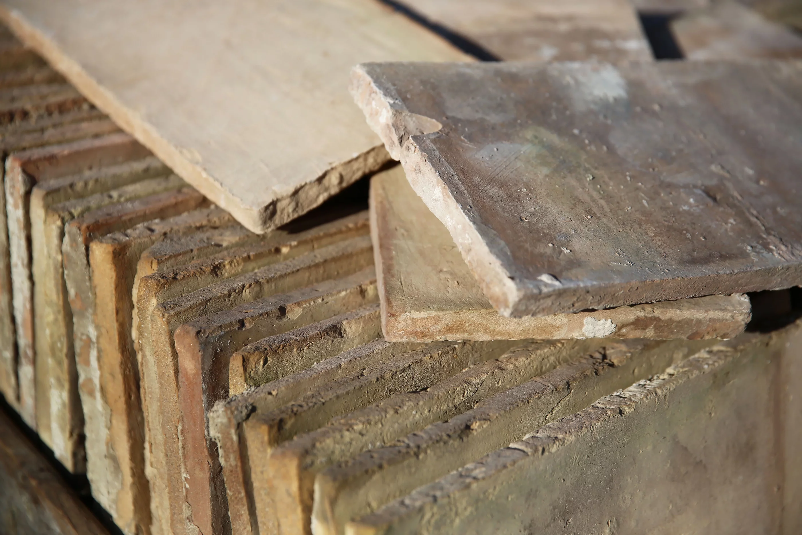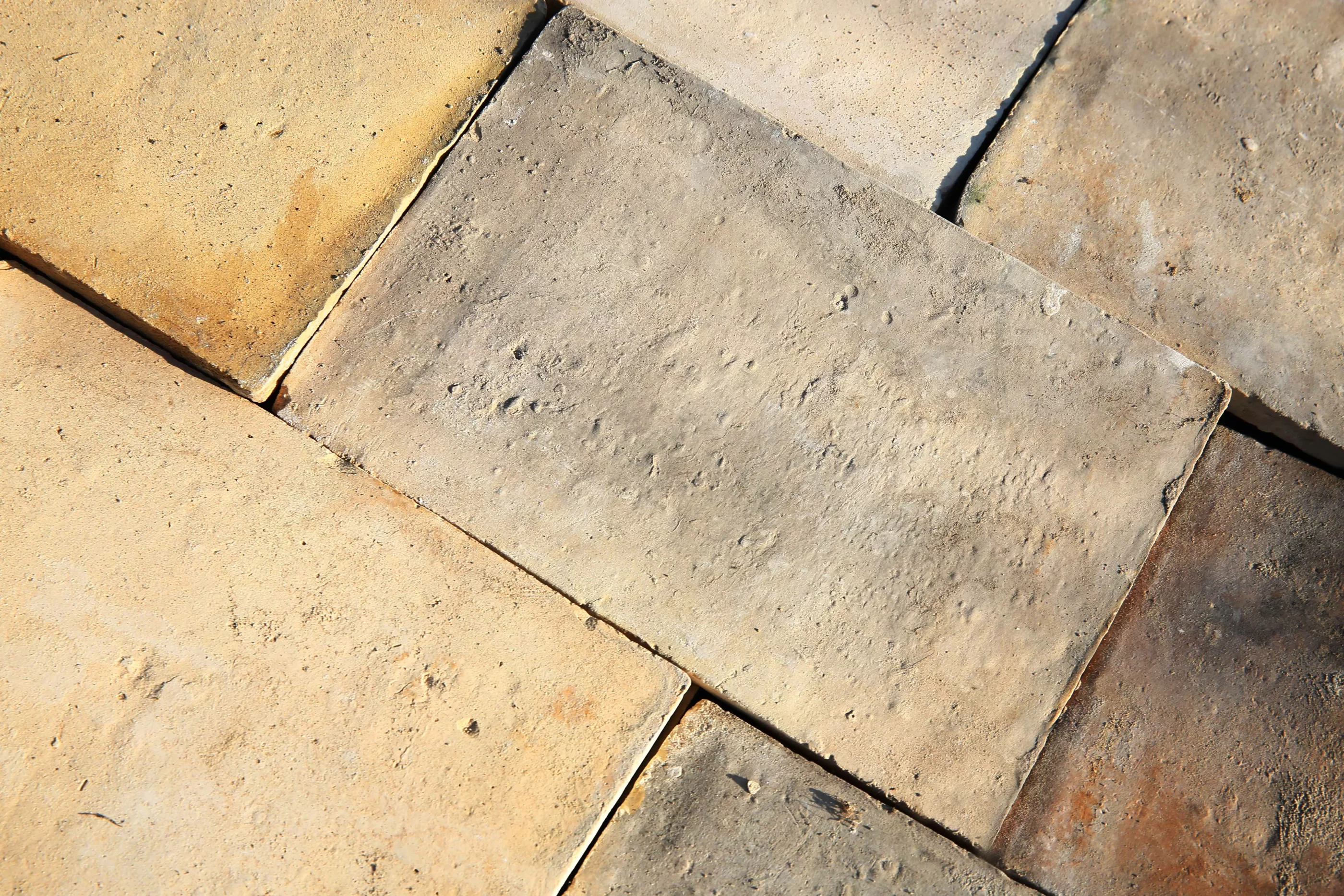 Parfeuilles sind antike französische Terrakotta fliesen. Die alten Fliesen wurden früher von Hand aus lokalem Lehm geformt und dann in traditionellen Ringöfen gebacken. Terrakotta fliesen sind in verschiedenen Größen erhältlich, einschließlich im rechteckigen Format. Eine Parfeuille ist der richtige Name für eine rechteckige Terrakottafliese. Parfeuilles sind in verschiedenen Farben und Größen erhältlich.