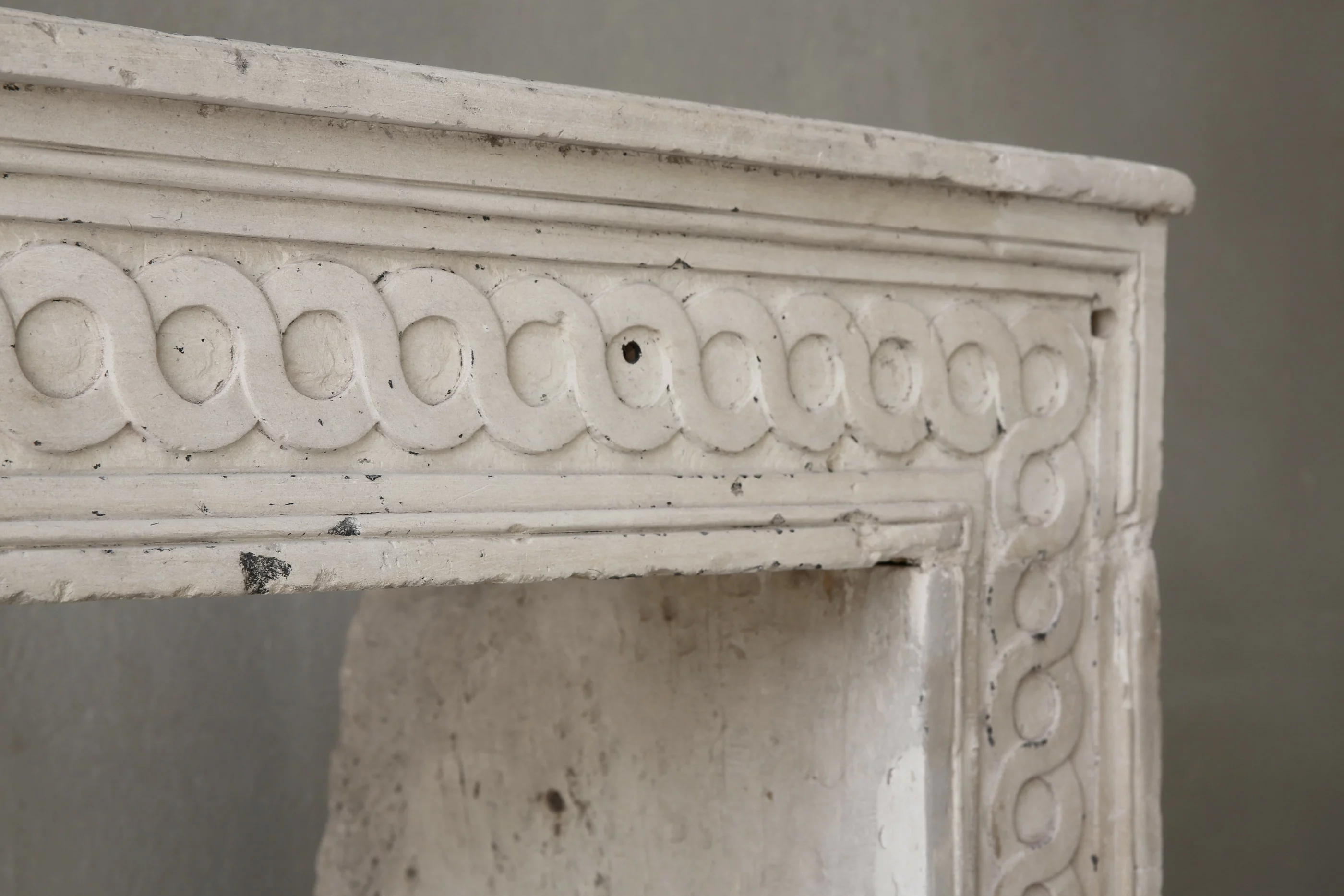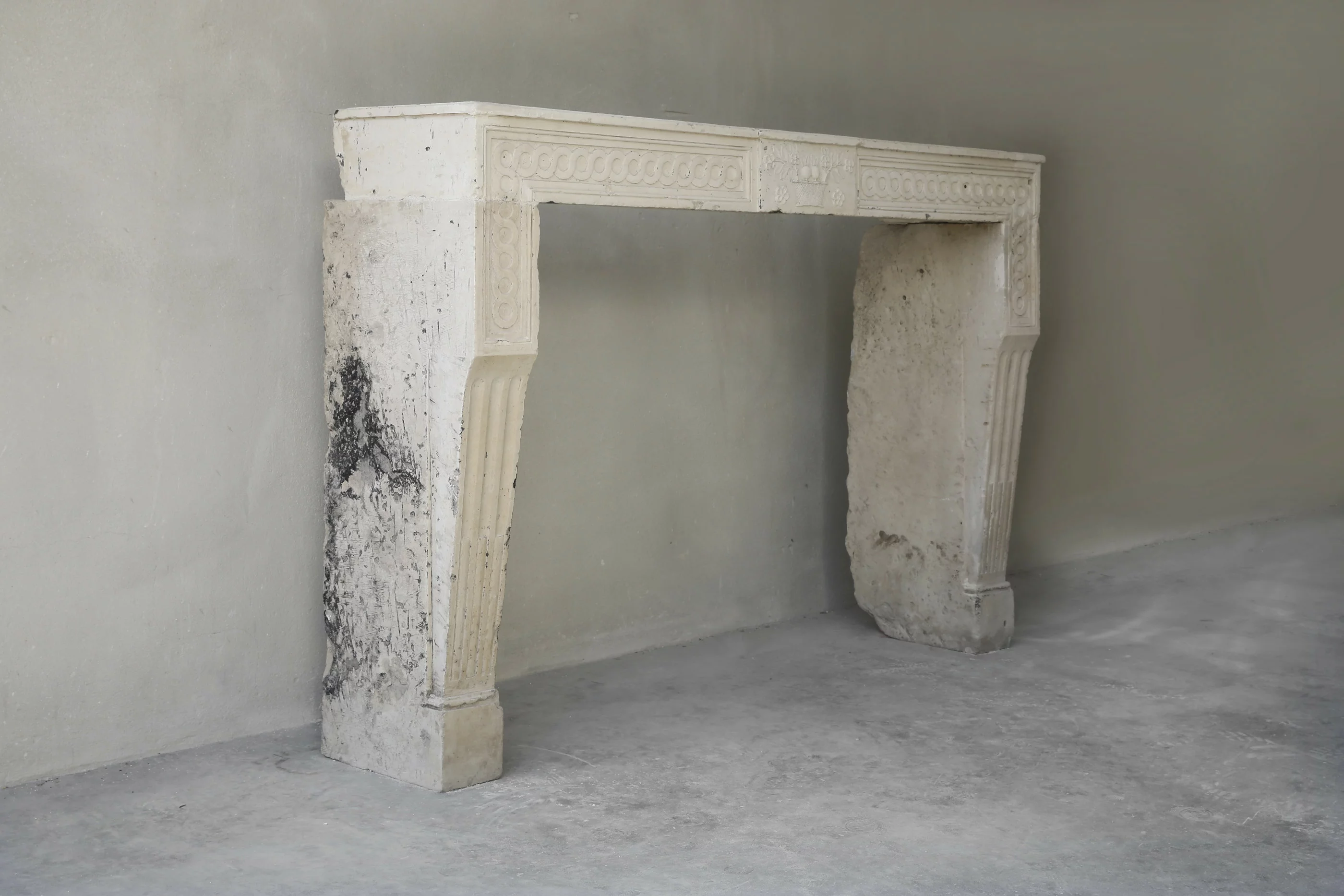 Schöner geschnitzter antiker französischer Kalkstein Kamin. Der Kamin ist im Stil Louis XVI und stammt aus dem 19. Jahrhundert. Auf der Vorderseite ist ein schönes Ornament und auch die Beine sind mit Cannellures verziert. Die Verzierungen im vorderen Bereich laufen ebenfalls auf den Beinen. Ein schöner gerader Kamin, der sowohl zu einem rustikalen als auch zu einem klassischen Interieur passt.