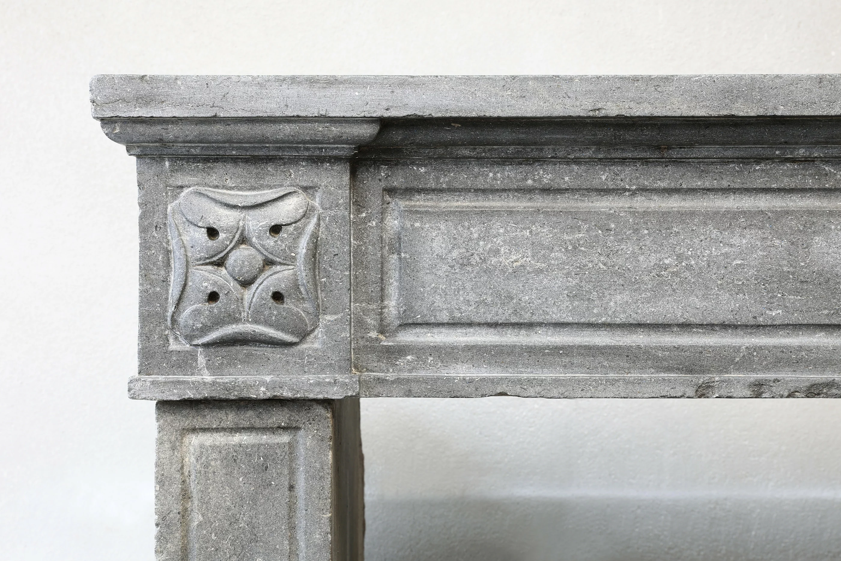 Schöner antiker Kamin aus grauem Marmorstein. Ein Kamin im Louis XVI-Stil mit eleganten Ornamenten oben und schönen Linien an den Beinen. Dieser Kamin stammt aus dem 19. Jahrhundert und sieht elegant aus!