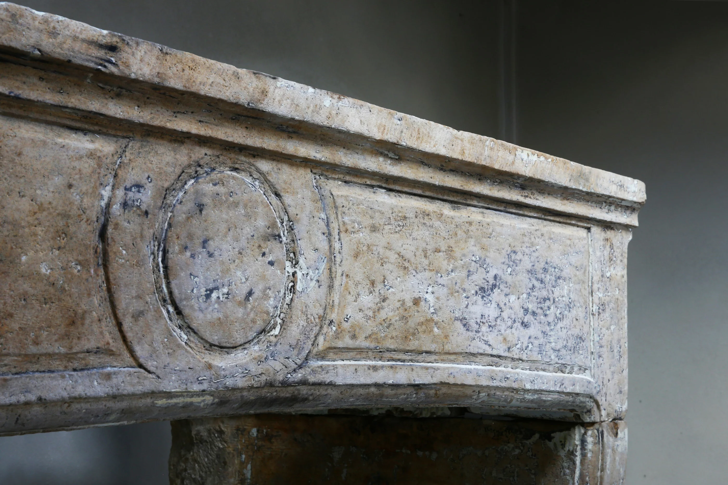 Schöner robuster antiker Kamin aus dem 19. Jahrhundert aus französischem Kalkstein. Ein Kamin mit Charakter und Aussehen aufgrund der Form und Linien. Dieser Kamin ist im Stil von Campagnarde und hat eine Verzierung im vorderen Teil. Die Beine sind leicht gebogen und haben schöne Linien.