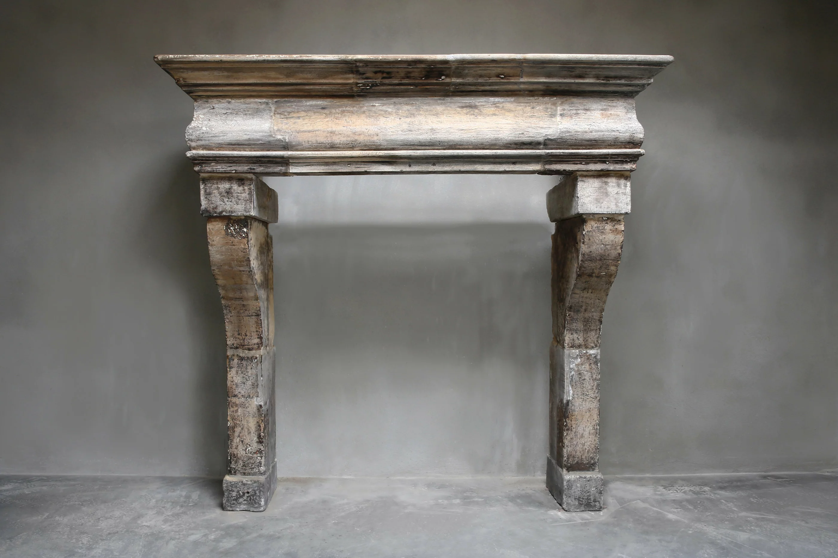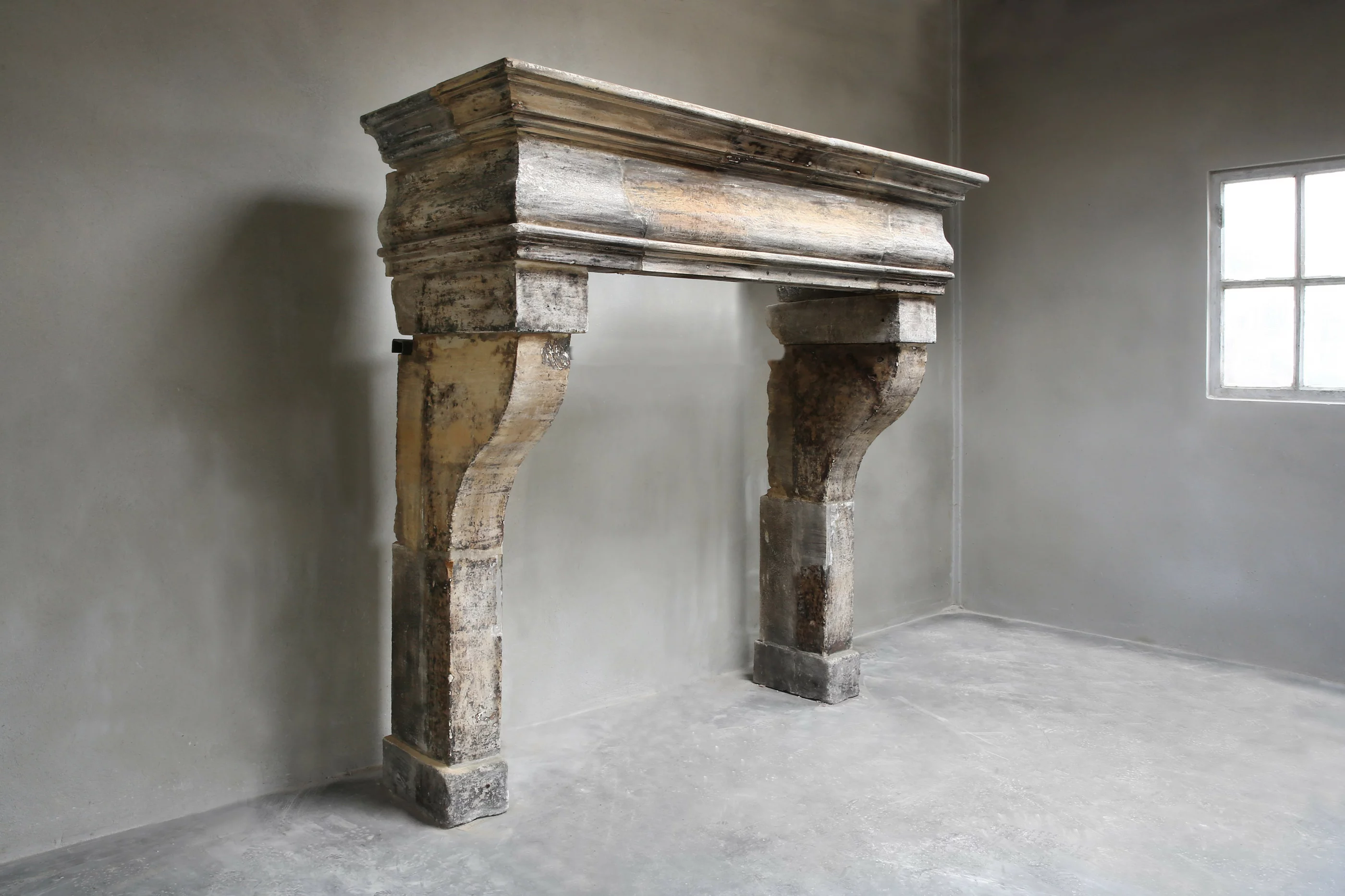 Ein sehr seltener und schöner antiker Kamin aus Französischem Kalkstein. Dieser antike Kamin stammt aus dem 18. Jahrhundert, im Stil von Ludwig XIII und zeichnet sich durch die ursprüngliche Patina und den "Galbé" im vorderen Teil der Kamin. Ein robuster und stattlicher Kamin, der in verschiedene Innenräume passt!
