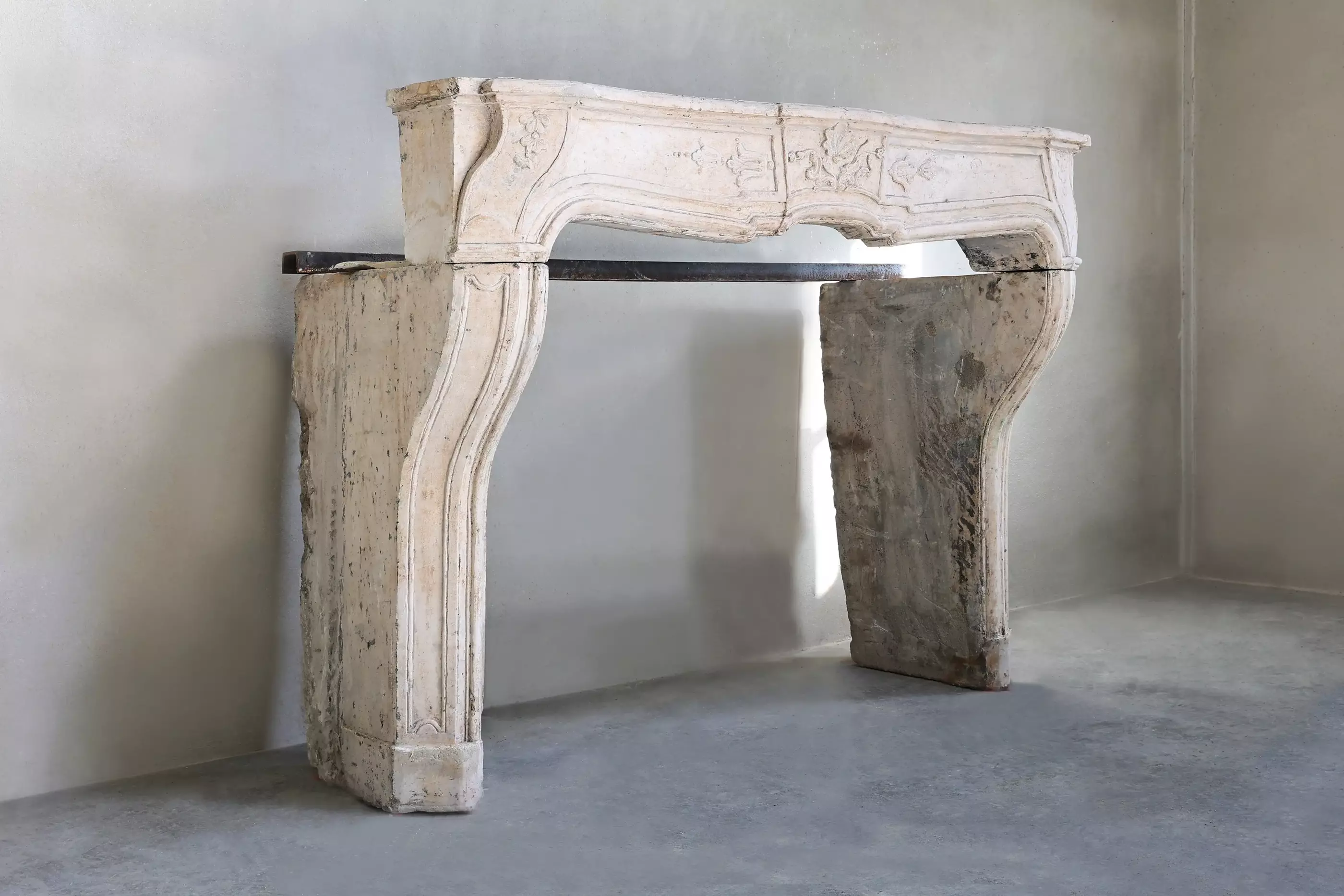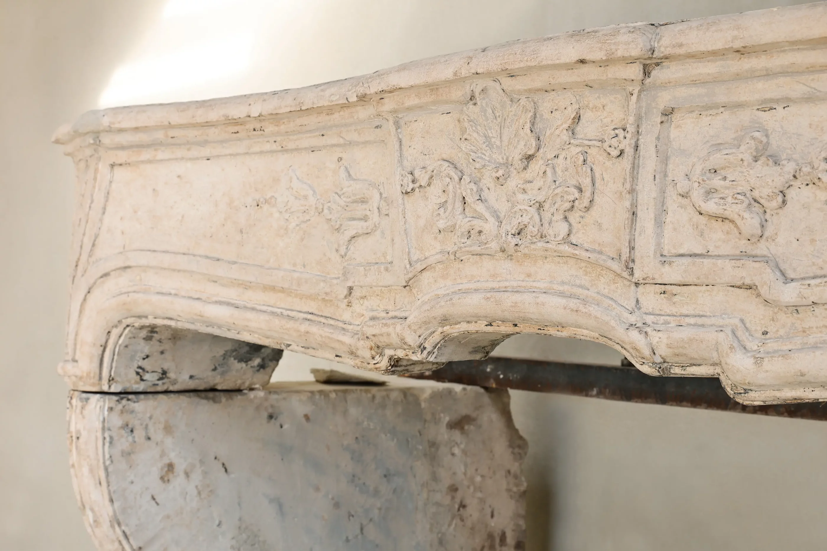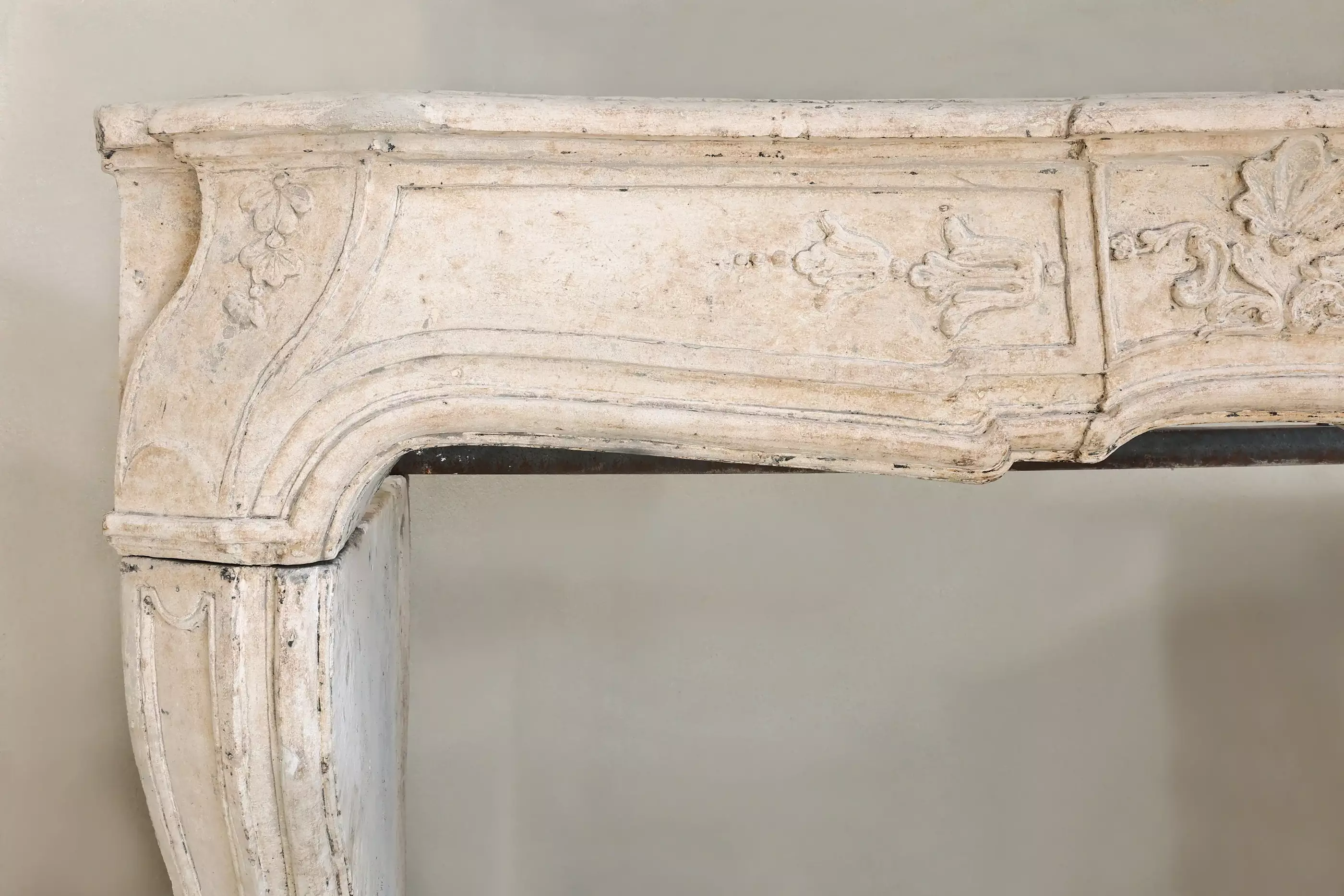 Ein original französisches Kaminstück aus hellem Kalkstein mit eleganten Louis XV-Linien, handgeschnitzten Ornamenten und einer sanft gealterten Patina – kuratiert von De Opkamer.