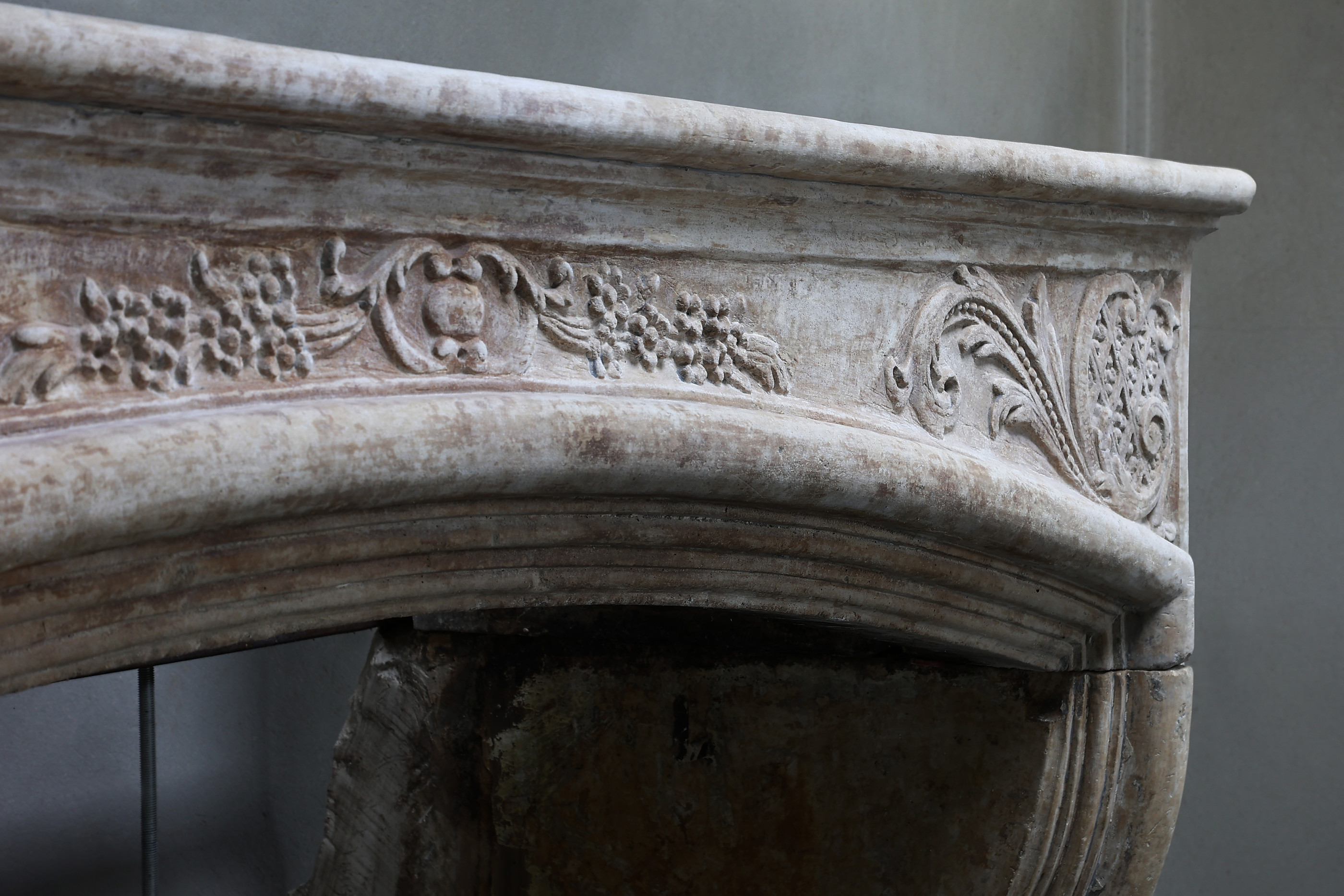Sehr schöner und dekorativer Kamin aus französischem Kalkstein. Dieser antike Mantel hat im Vorderteil verschiedene kunstvolle Ornamente. Der Kamin hat schöne Formen, Linien und ein warmes Aussehen! Das Format eignet sich auch für viele Innenräume. Dieser Kamin ist im Stil von Louis XIV.