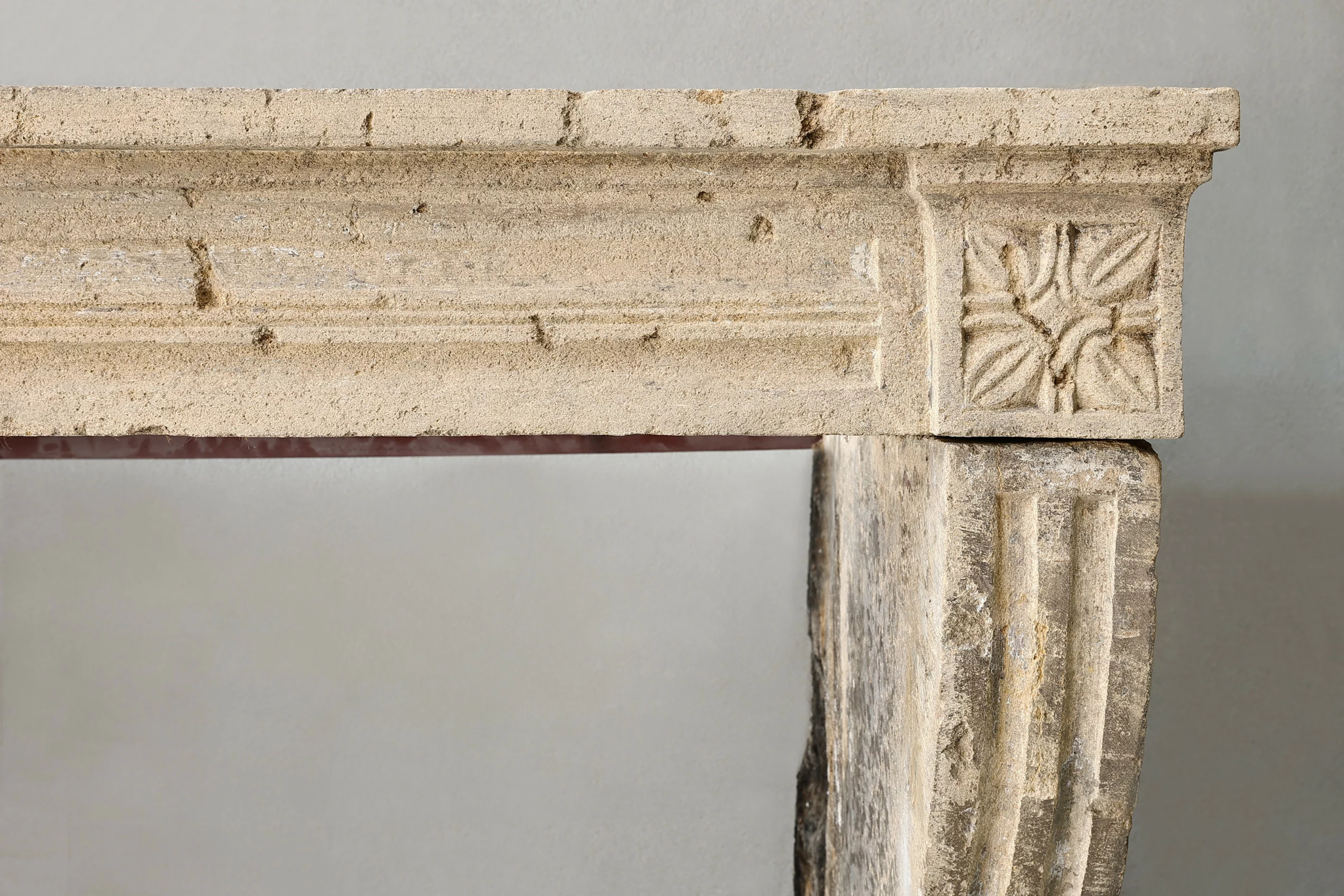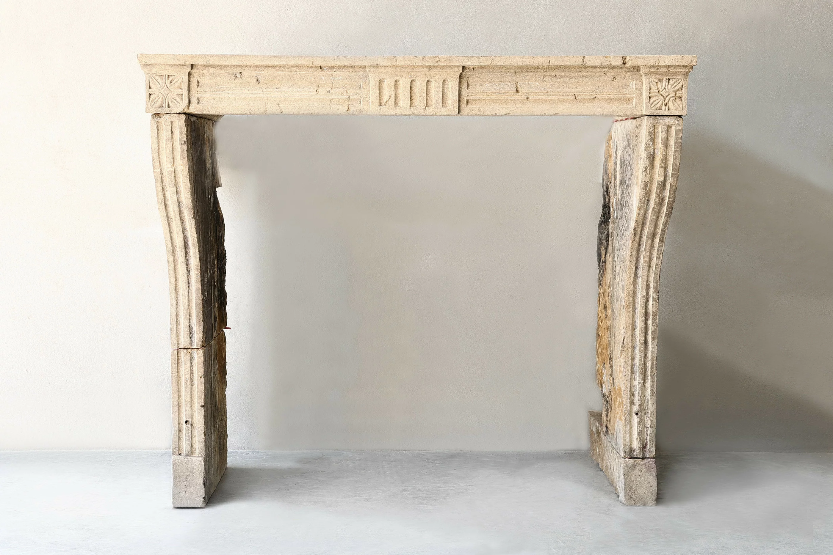 Antiker französischer Kalksteinkamin aus dem 19. Jahrhundert! Ein rustikaler, schlanker Kamin mit wenigen Verzierungen, aber schönen Linien. Der vordere Teil ist mit Rillen versehen, die sich auch an den Beinen fortsetzen. Die Beine sind leicht gebogen und die warmen Farben machen diesen Kamin zu einem einzigartigen Ganzen.
