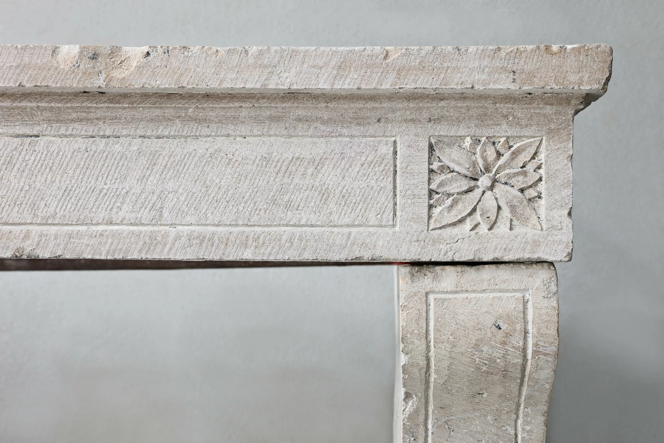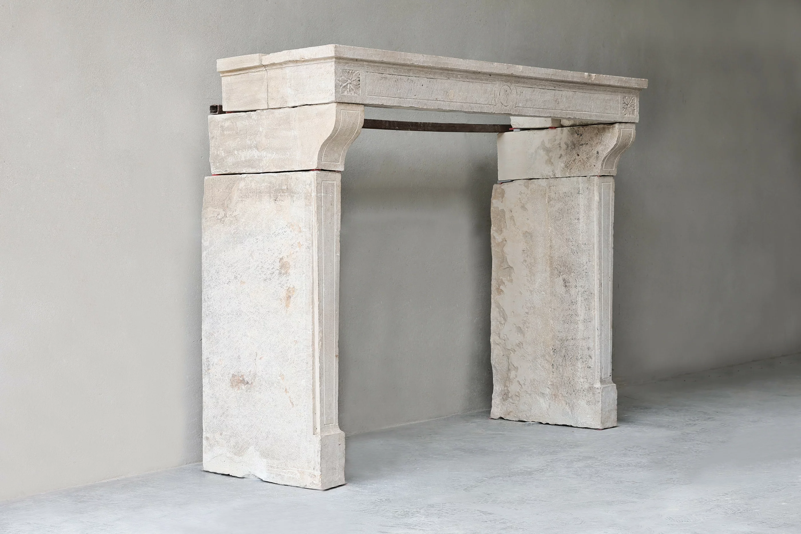 Wunderschöner antiker Kamin aus dem 19. Jahrhundert im Campagnarde-Stil. Dieser alte Kamin aus französischem Kalkstein hat eine warme Farbgebung und einige schöne Ornamente. Ein charmanter rustikaler Kamin mit Charakter.