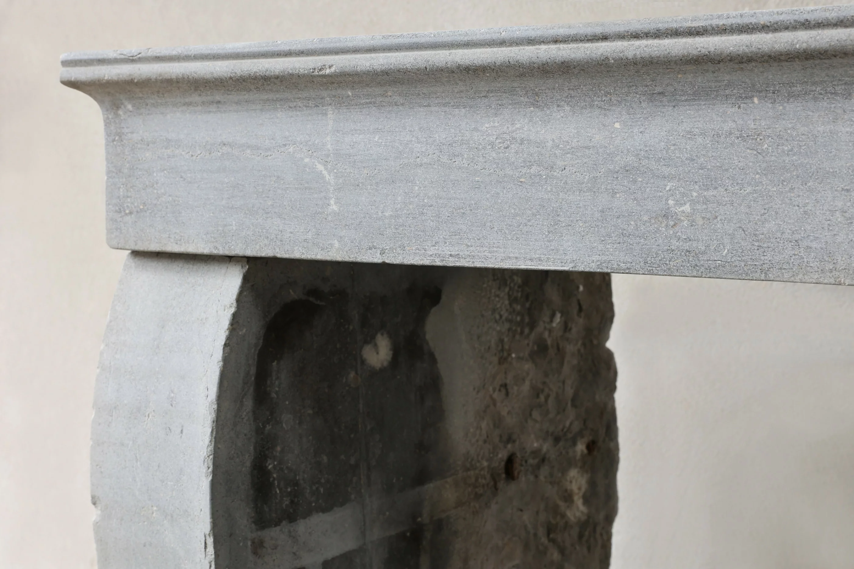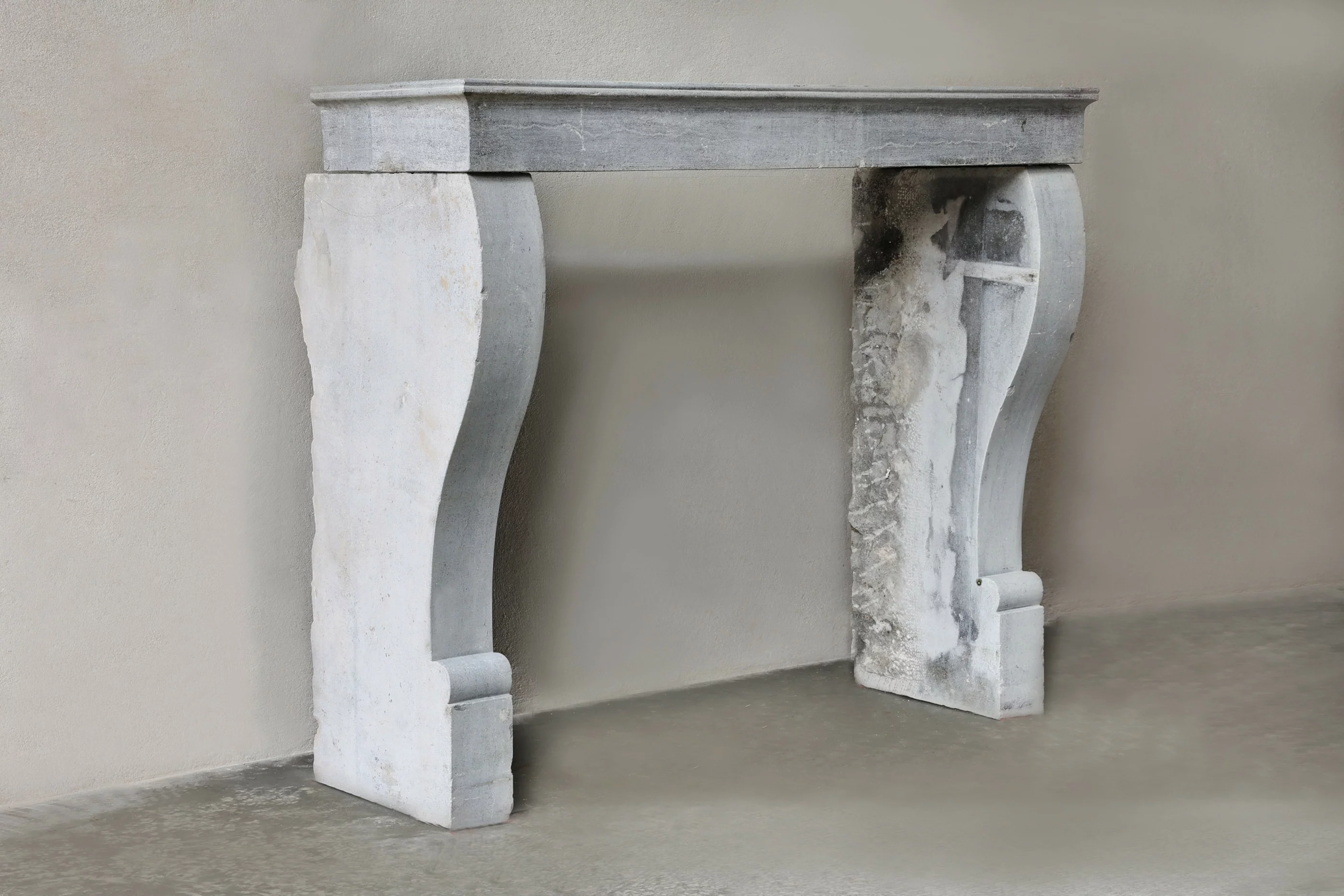 Sehr schöner rustikaler Kamin aus grauem Marmorstein. Ein Kaminsims mit wenigen Verzierungen, aber mit schönen Linien und leicht geschwungenen Beinen. Dieser Kamin im Campagnarde-Stil stammt aus dem 19. Jahrhundert und lässt sich hinsichtlich Farbe und Abmessungen in viele Innenräume integrieren.