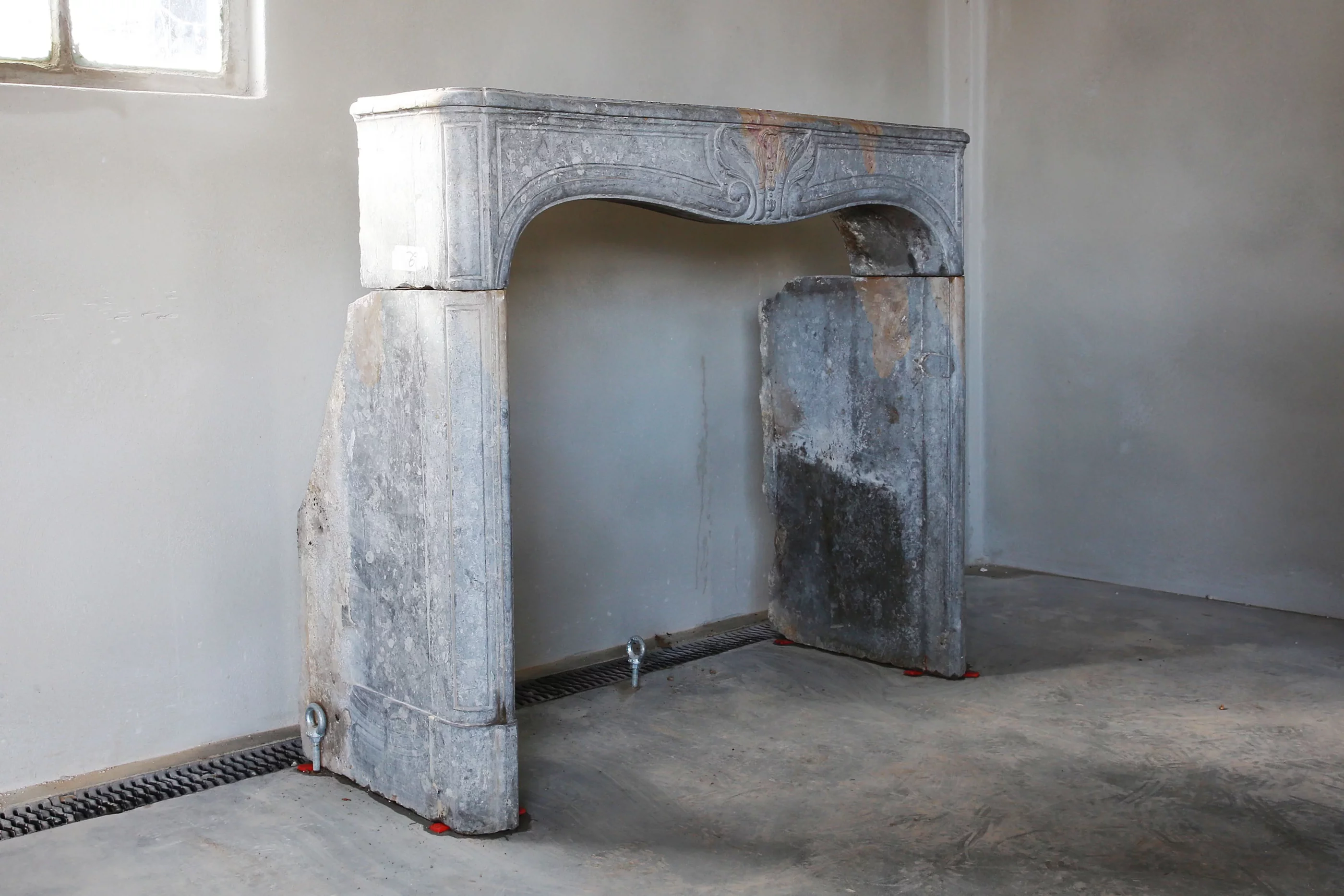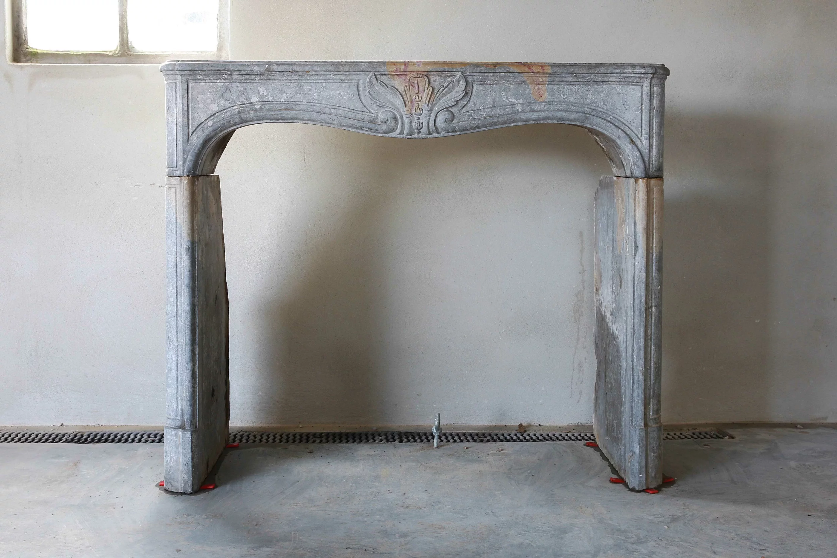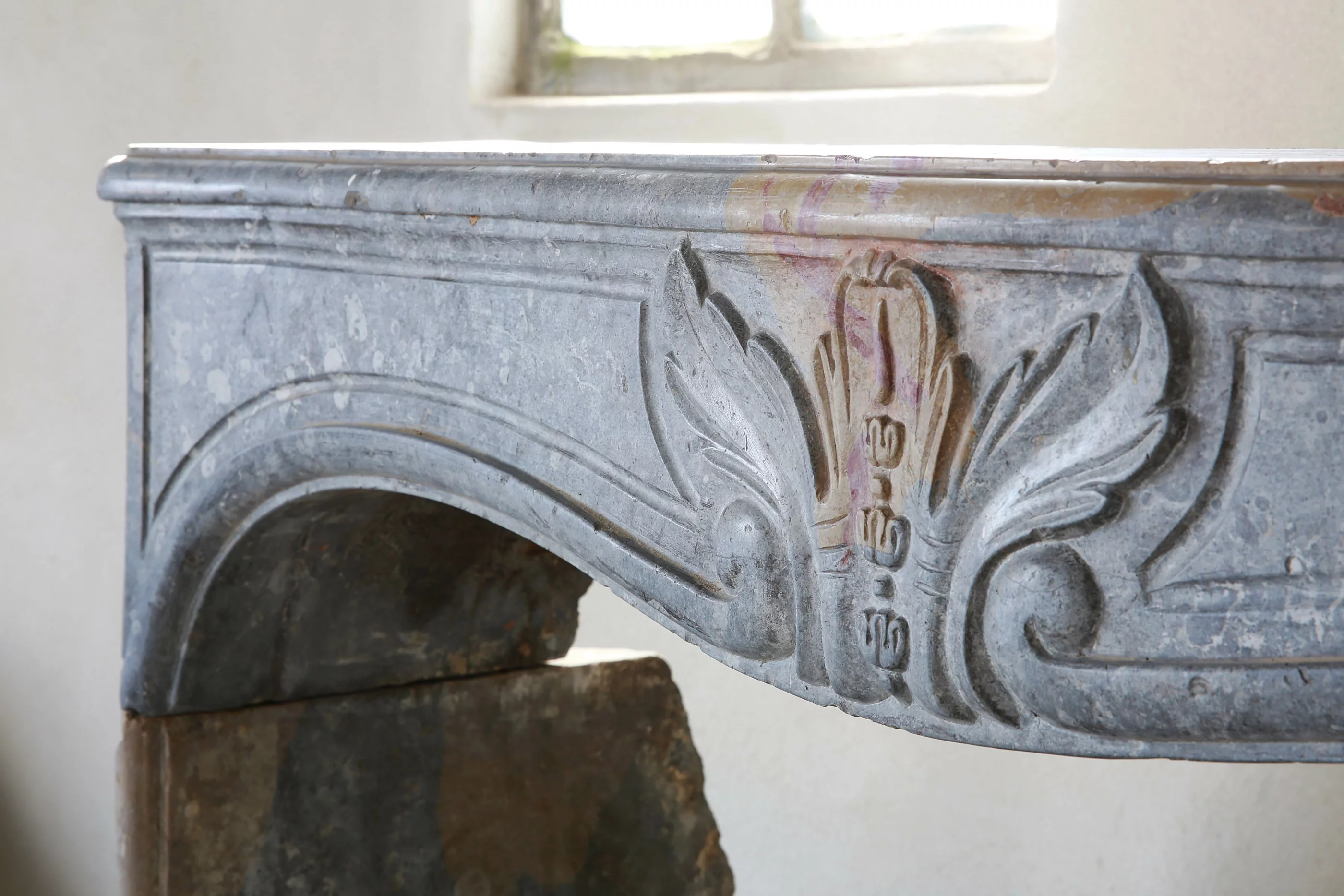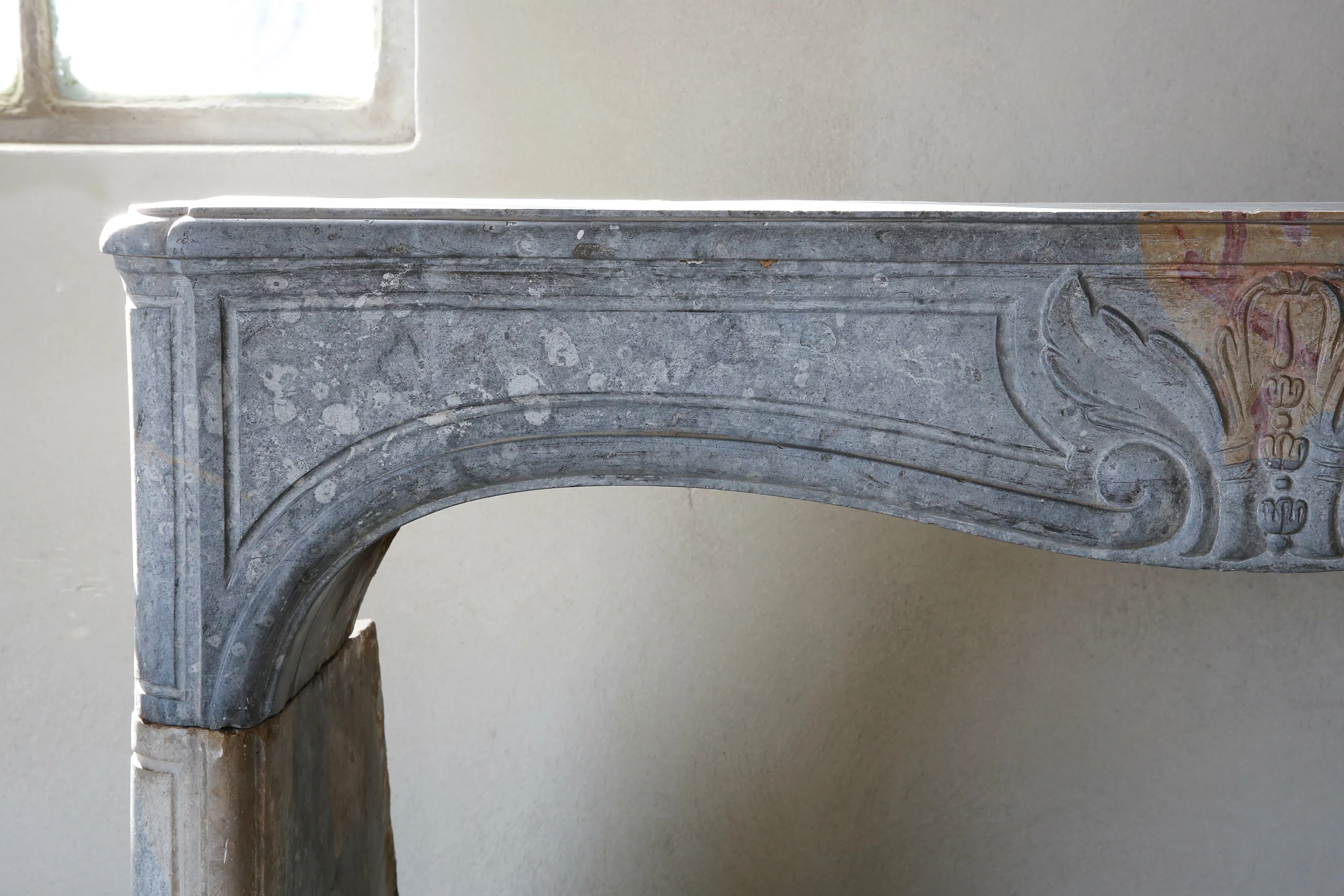 Dieser antike Kamin zeichnet sich einerseits durch feine Rahmen und andererseits durch die charakteristischen Merkmale unvollständiger Metamorphose aus, wobei sich die blaugraue Grundfarbe mit gelben und sogar roten Nuancen vermischt. Ein antiker Kamin mit diesem dreifarbigen Farbton ist einzigartig und nur sehr selten.