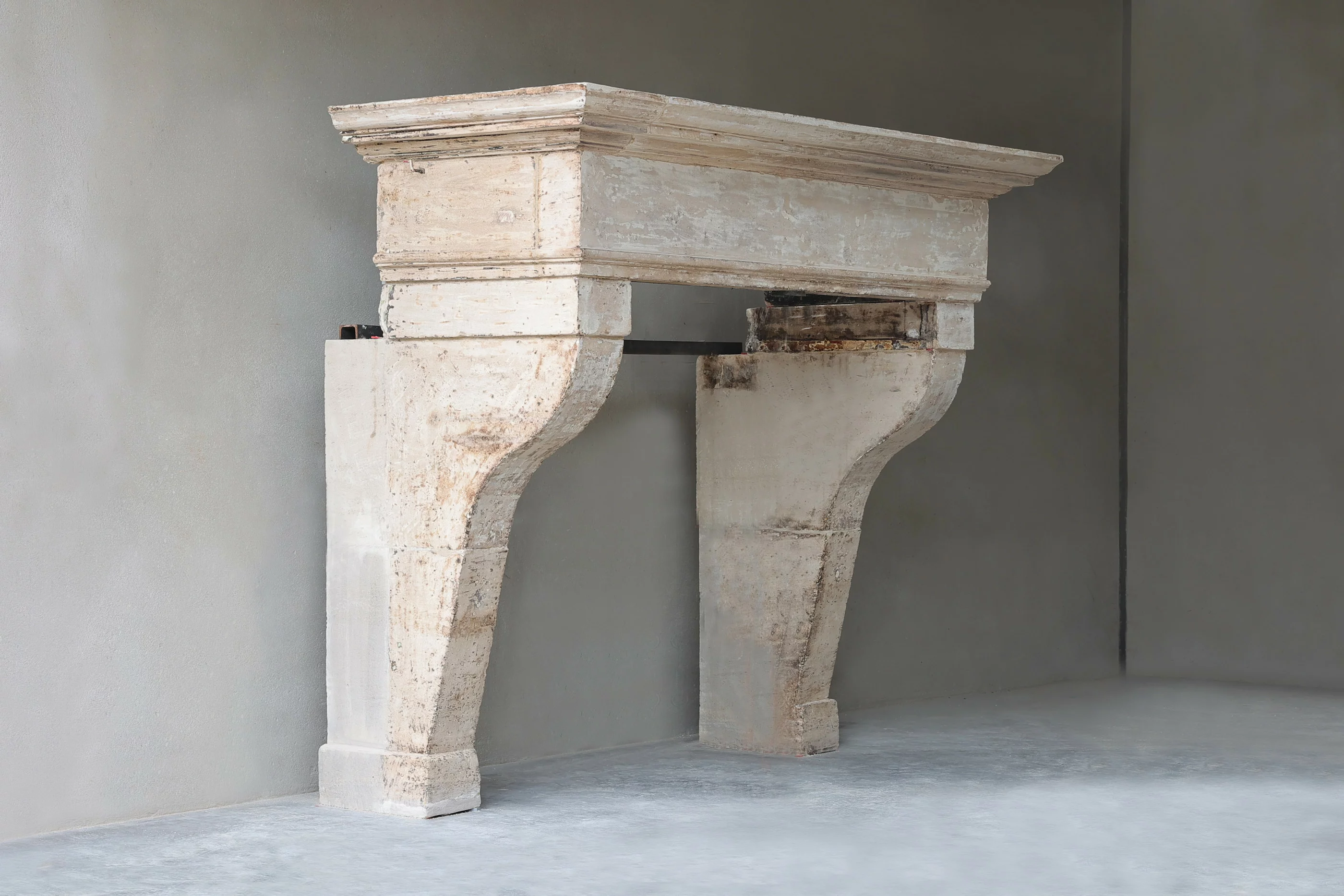 Dieser antike Schlosskamin aus französischem Kalkstein stammt aus dem 18. Jahrhundert und ist im Stil Ludwigs XIII. gehalten. Ein imposanter Kamin mit breitem Vorderteil und leicht geschwungenen Beinen und Zierleisten. Dieser Kamin wirkt aufgrund seiner Größe und warmen Farbgebung sehr stattlich und imposant und ist nicht weniger als 214 cm breit.