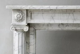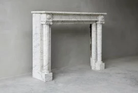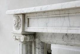 Schöner antiker Kamin von Carrara-Marmor aus dem 19. Jahrhundert! Dieser Kamin ist im Louis XVI-Stil und stammt aus Paris. Der Kaminsims hat charmante Ornamente und Dekorationen und die Beine sind geriffelt. Ein wunderschöner Modellkamin, der gut in ein modernes oder klassisches Interieur passt.