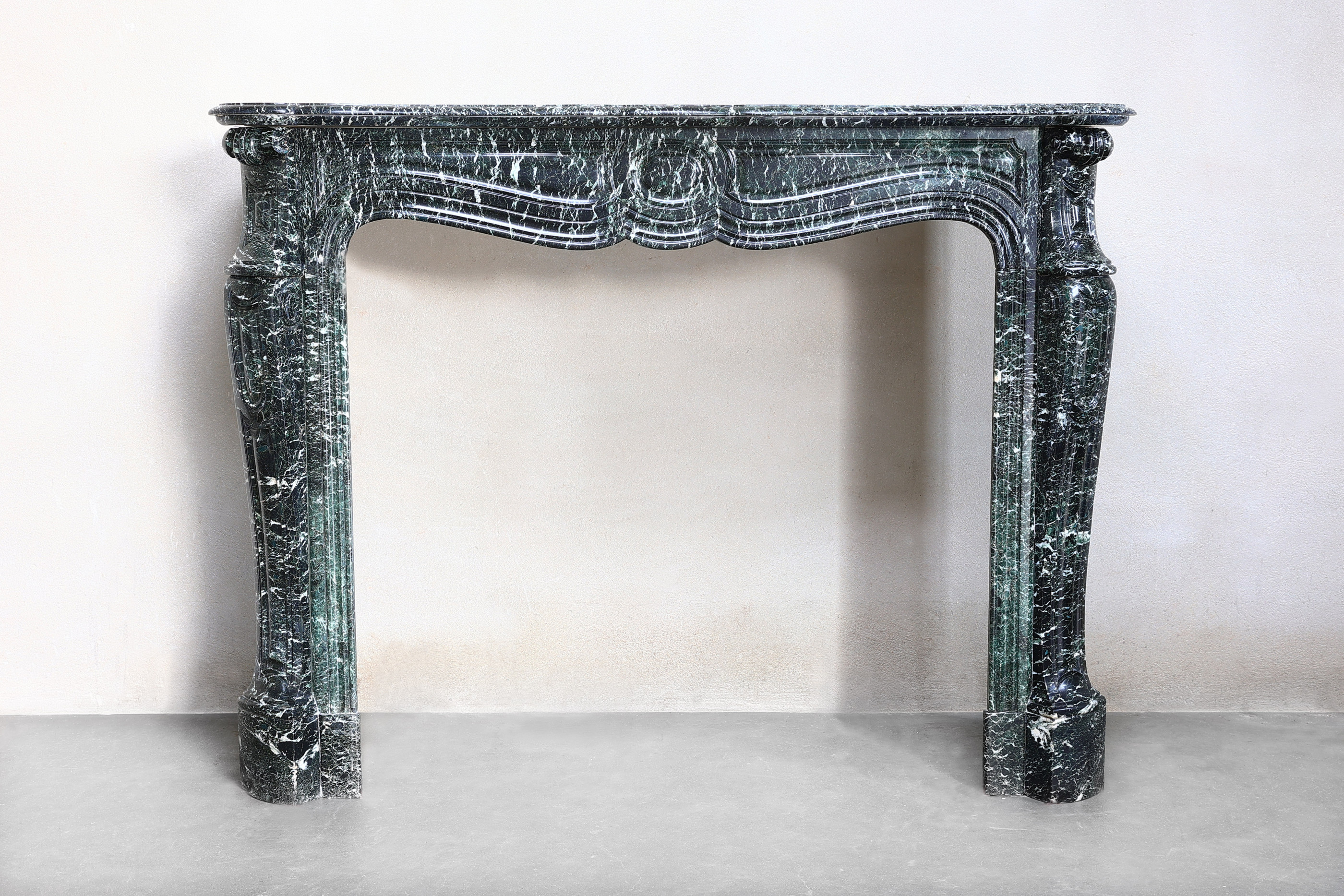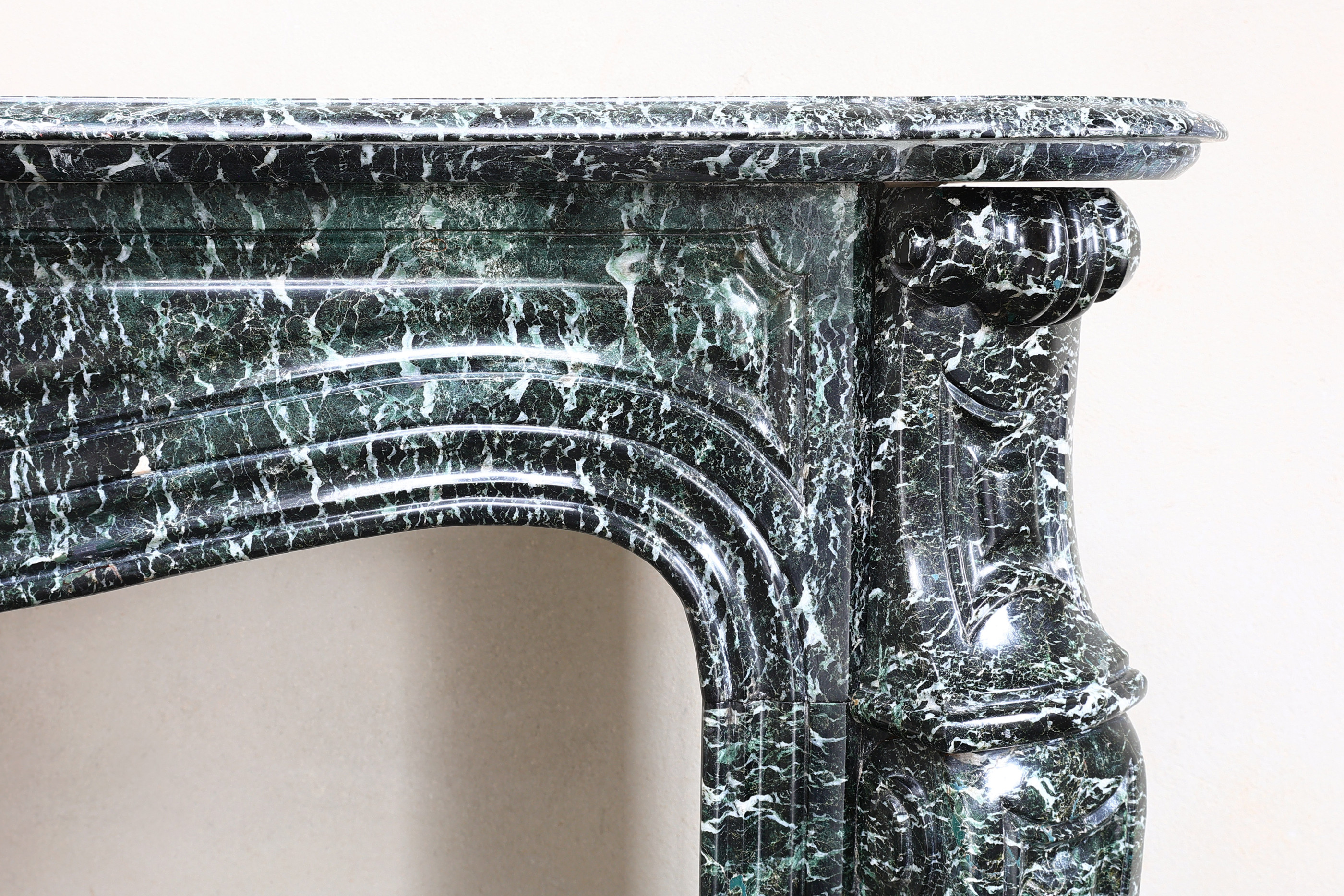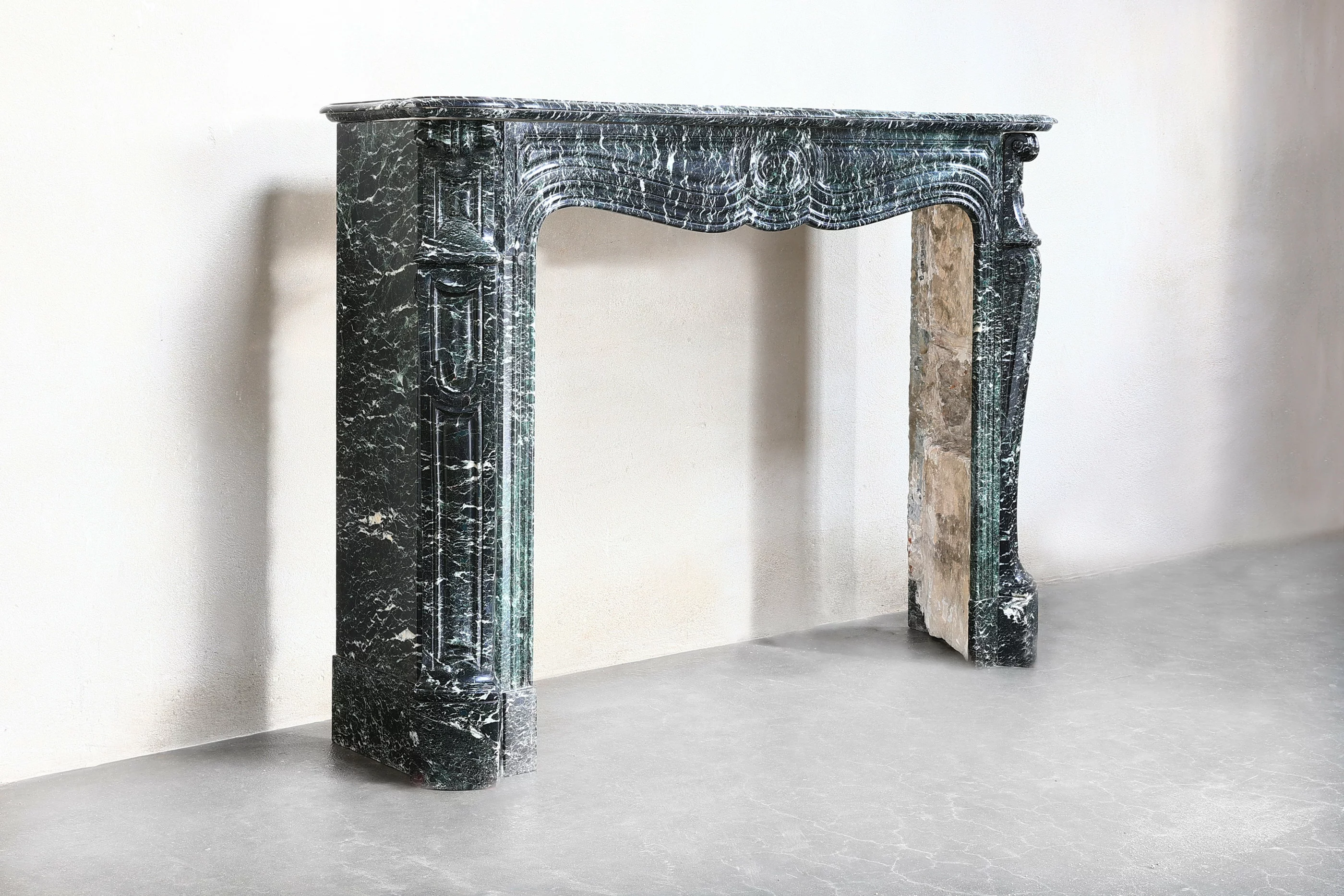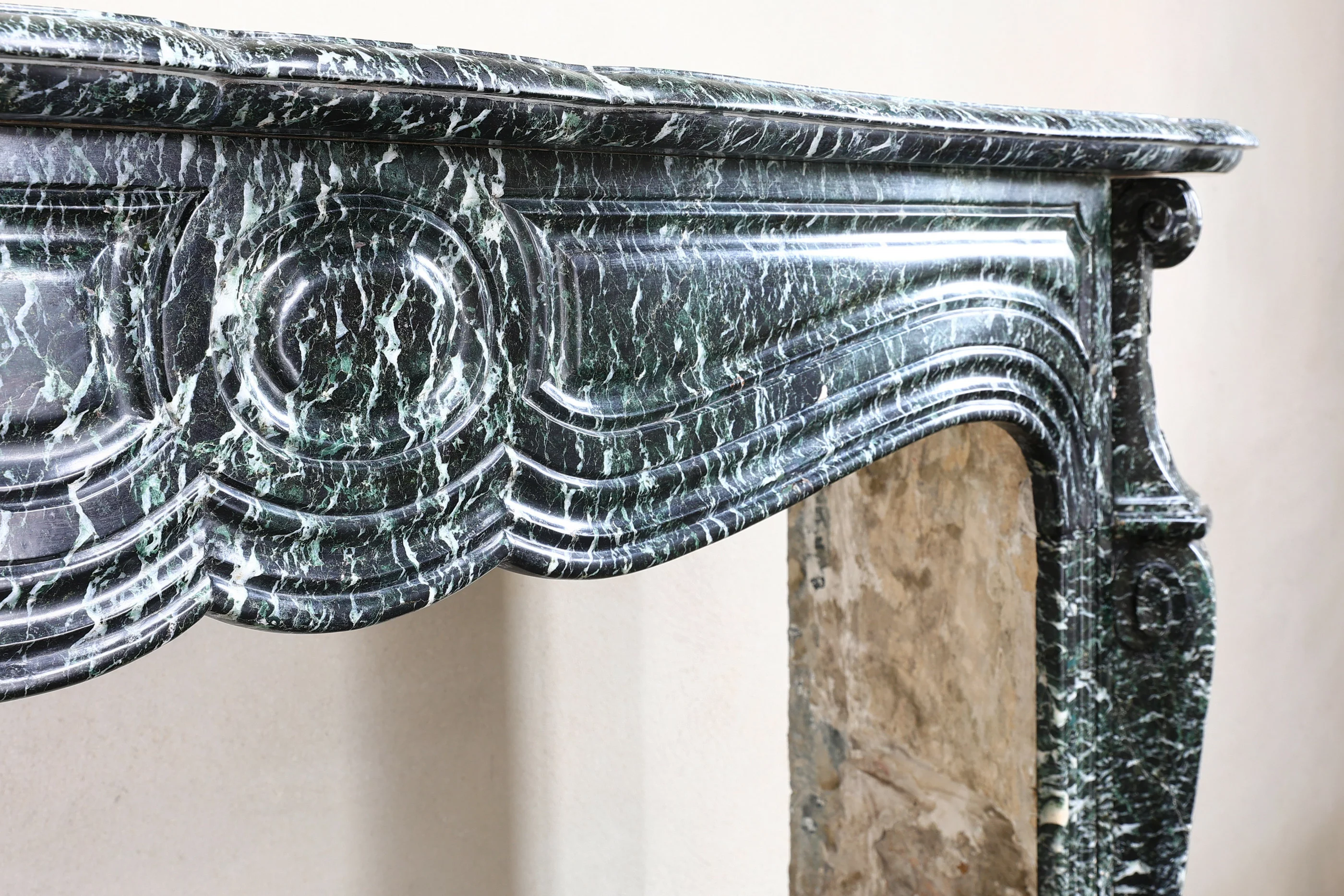 Schöner antiker Kamin aus Vert de Mer Marmor im Stil von Pompadour von 1850 - 1870. Pompadour Kamine sind an der Rundung in der Mitte zu erkennen. Dies ist ein sehr charmanter und stilvoller Mantel aus einer besonderen Art von Marmor.