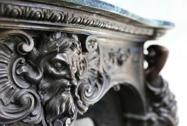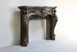 Sehr einzigartiger und seltener antiker Marmorkamin aus Gusseisen Bronzepatina und Vert de Gréce Marmor (Tinos) aus der Mitte des 19. Jahrhunderts! Die Gesichter stammen aus der griechischen Mythologie. In der Mitte sehen Sie Poseidon, den Gott des Meeres und die Statuen an den Seiten ist seine Frau Amphitrite. Ein ganz besonderer Kamin, der einen schönen Platz in einem Interieur verdient.