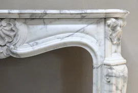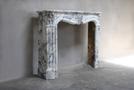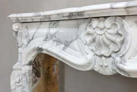 Schöner kompakter Kamin aus Arabescato-Marmor aus dem 19. Jahrhundert im stil von Louis XV. Dieser antike Kamin hat schöne helle Adern und schöne Ornamente wie 'trois scallops', eine Jakobsmuschel in der Mitte und an beiden Beinen! Ein schicker Kamin, der für viele Innenräume verwendet werden kann.