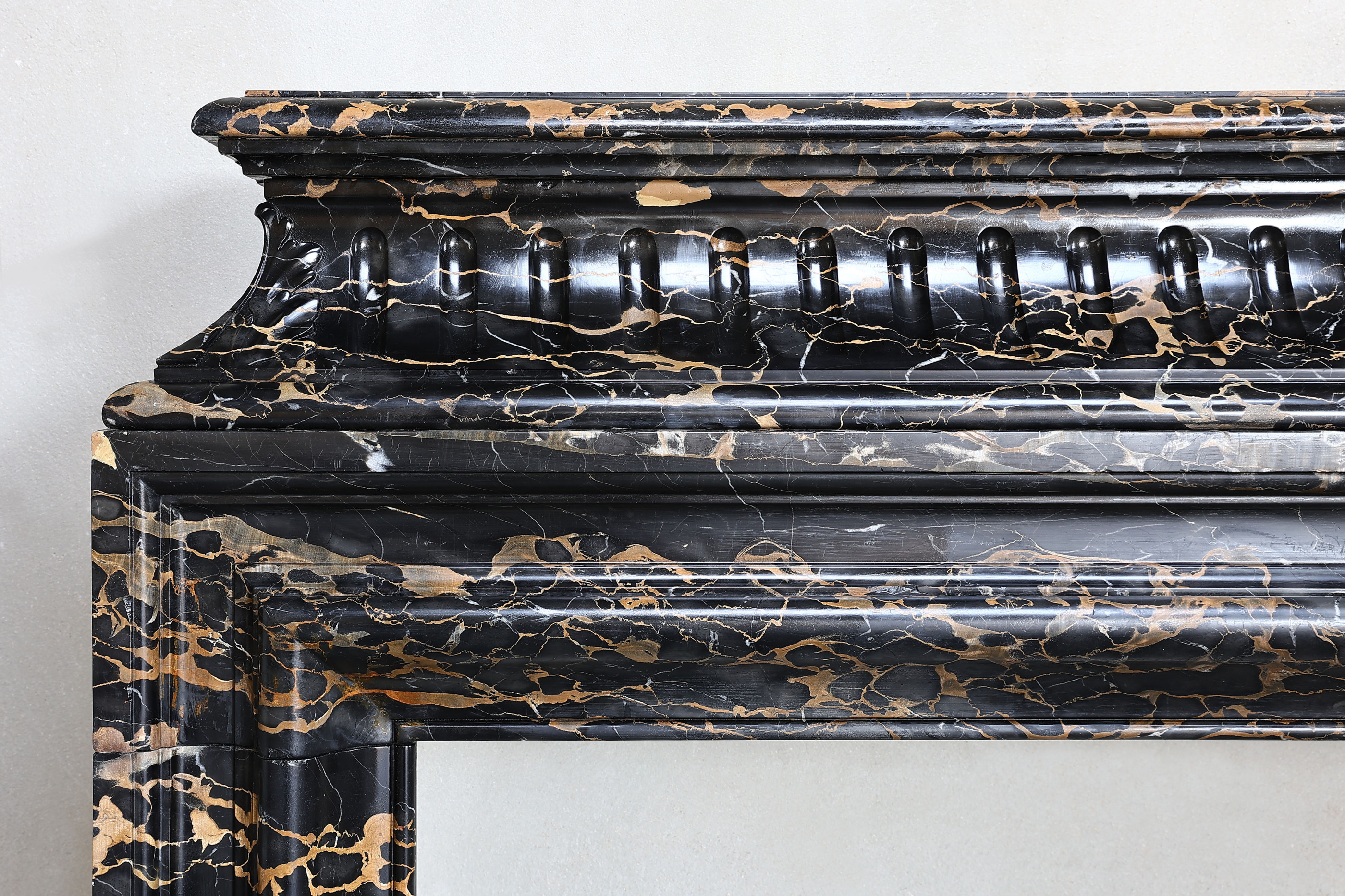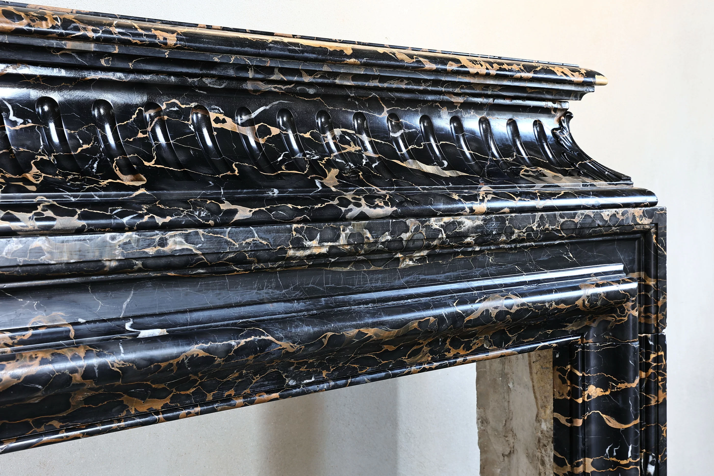 Schöner einzigartiger Kamin aus Portoro Marmor. Portoro Marmor hat seinen Ursprung in Italien und ist ein sehr schöner warmer Marmor in dunkelbraun/schwarz mit schönen geflammten Adern! Dieser antike Kamin stammt aus dem 19. Jahrhundert und ist im Stil von Louis XIII. Ein sehr schöner Kamin mit Riffelung im vorderen Teil und schönen Linien.