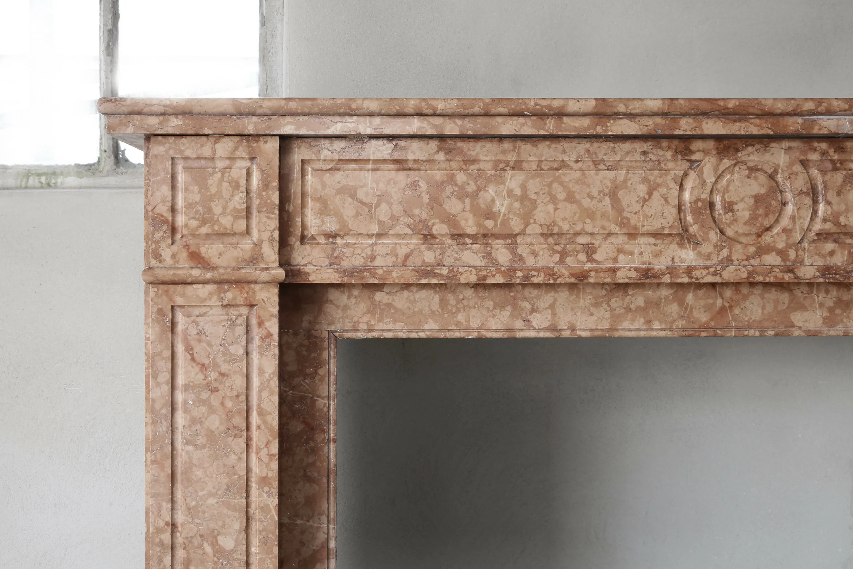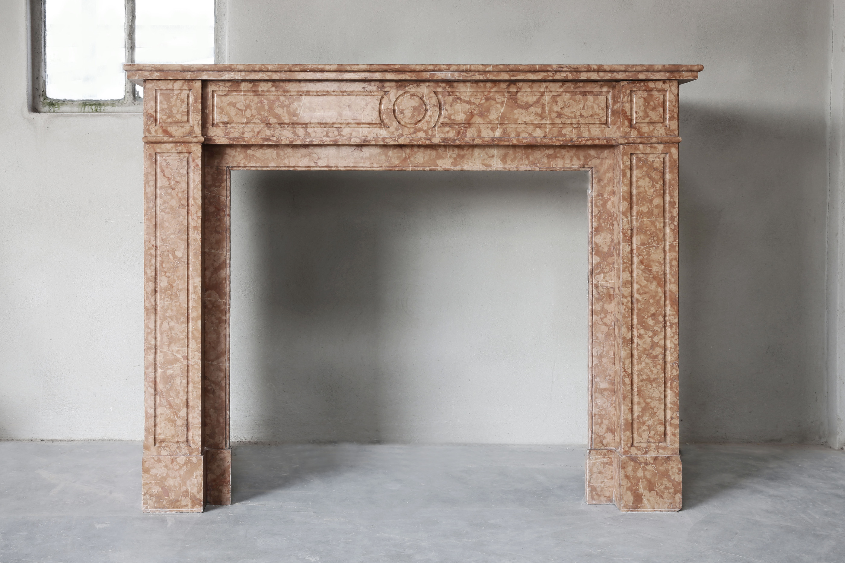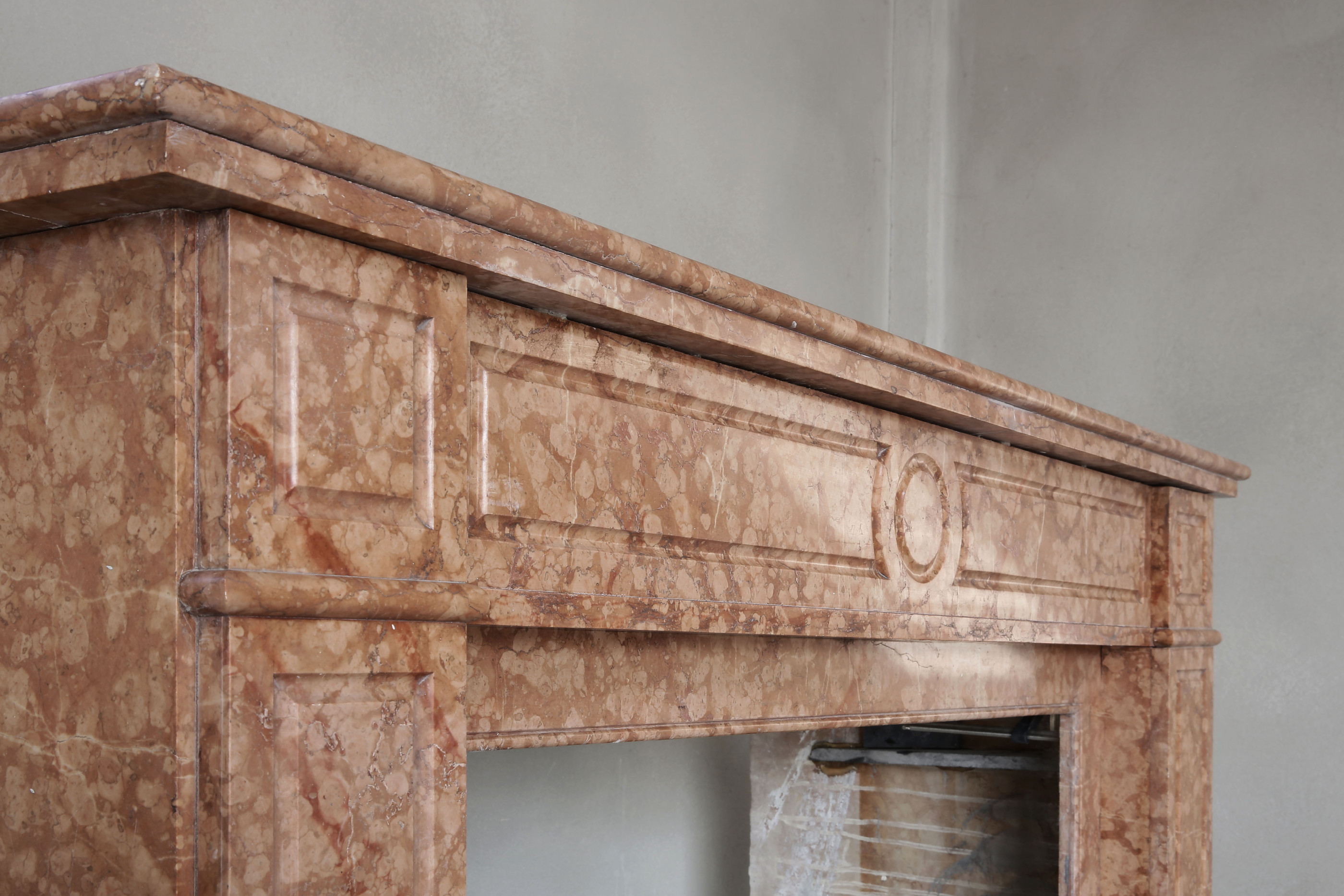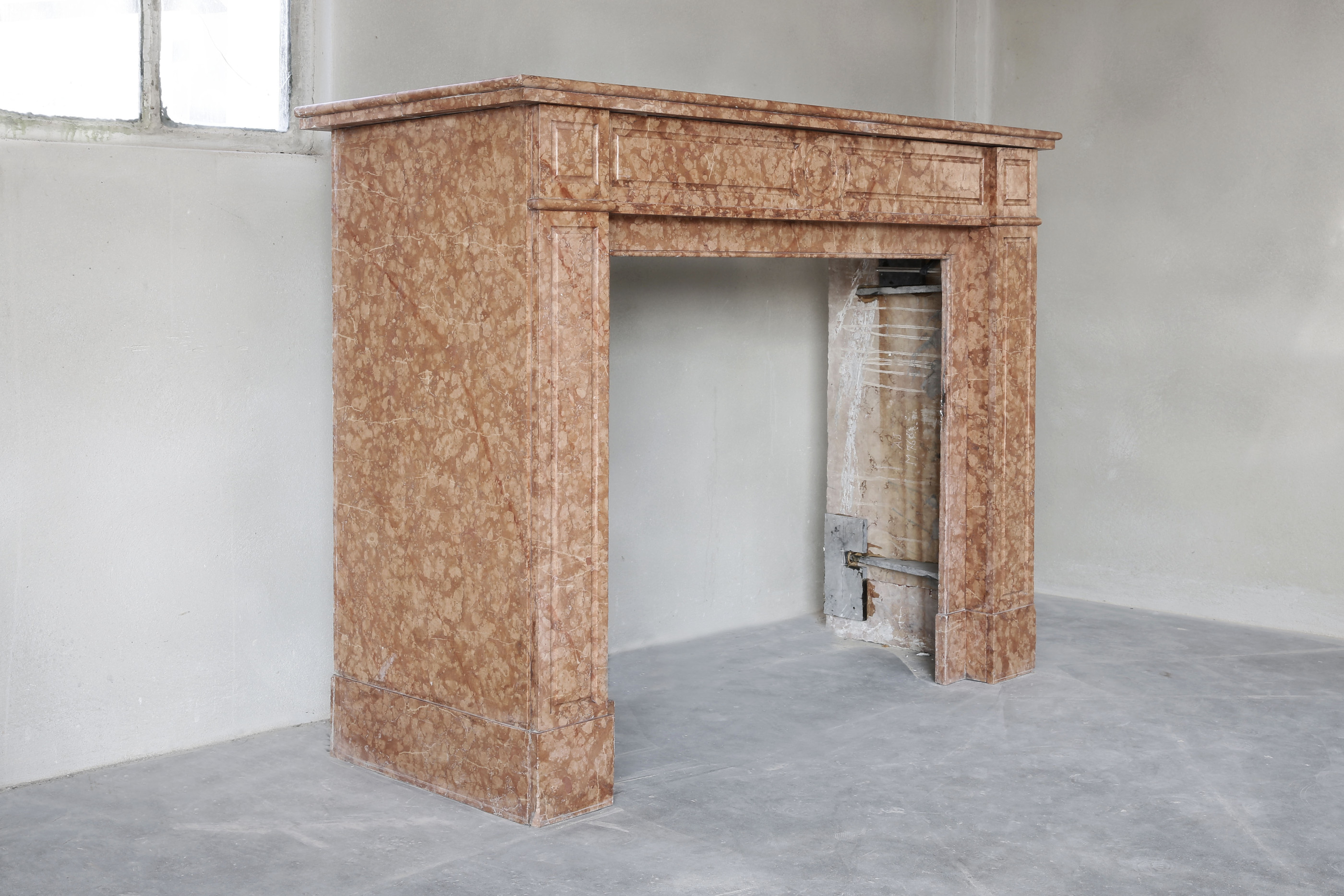 Schöner warmer antiker Marmorkamin vom Marmortyp Rouge de Verrona. Diese Art von Marmor kommt aus Italien und hat eine orange / braune Farbgebung. Der Kamin stammt aus dem 19. Jahrhundert und aus der Zeit Ludwigs XVI. Der antike Kamin hat schöne Linien und eine Verzierung in der Mitte des Vorderteils.