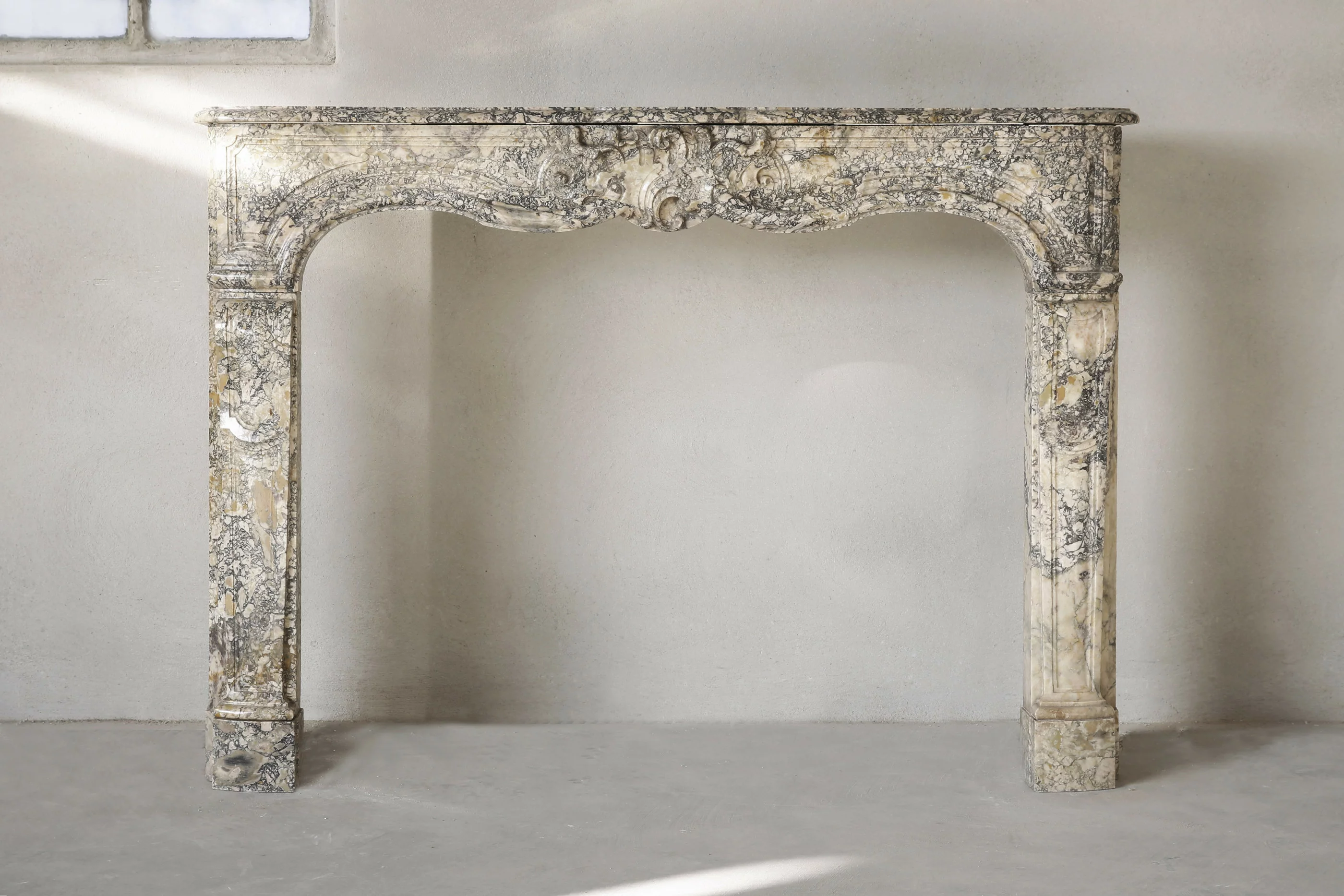 Exklusiver antiker Kamin aus Breche-Marmor. Breche Marmor stammt ursprünglich aus Italien. Die gelb/graue Farbgebung schafft eine warme Atmosphäre! Dieser Kamin stammt aus dem frühen 19. Jahrhundert und ist ganz im Stil von Louis XV. Der Stil von Louis XV ist an seiner anmutigen Form erkennbar und weist in der Mitte oft eine Jakobsmuschel auf. Marmor ist ein wunderschöner Naturstein, der jedes Mal einzigartig ist und für viele Anwendungen verwendet werden kann.