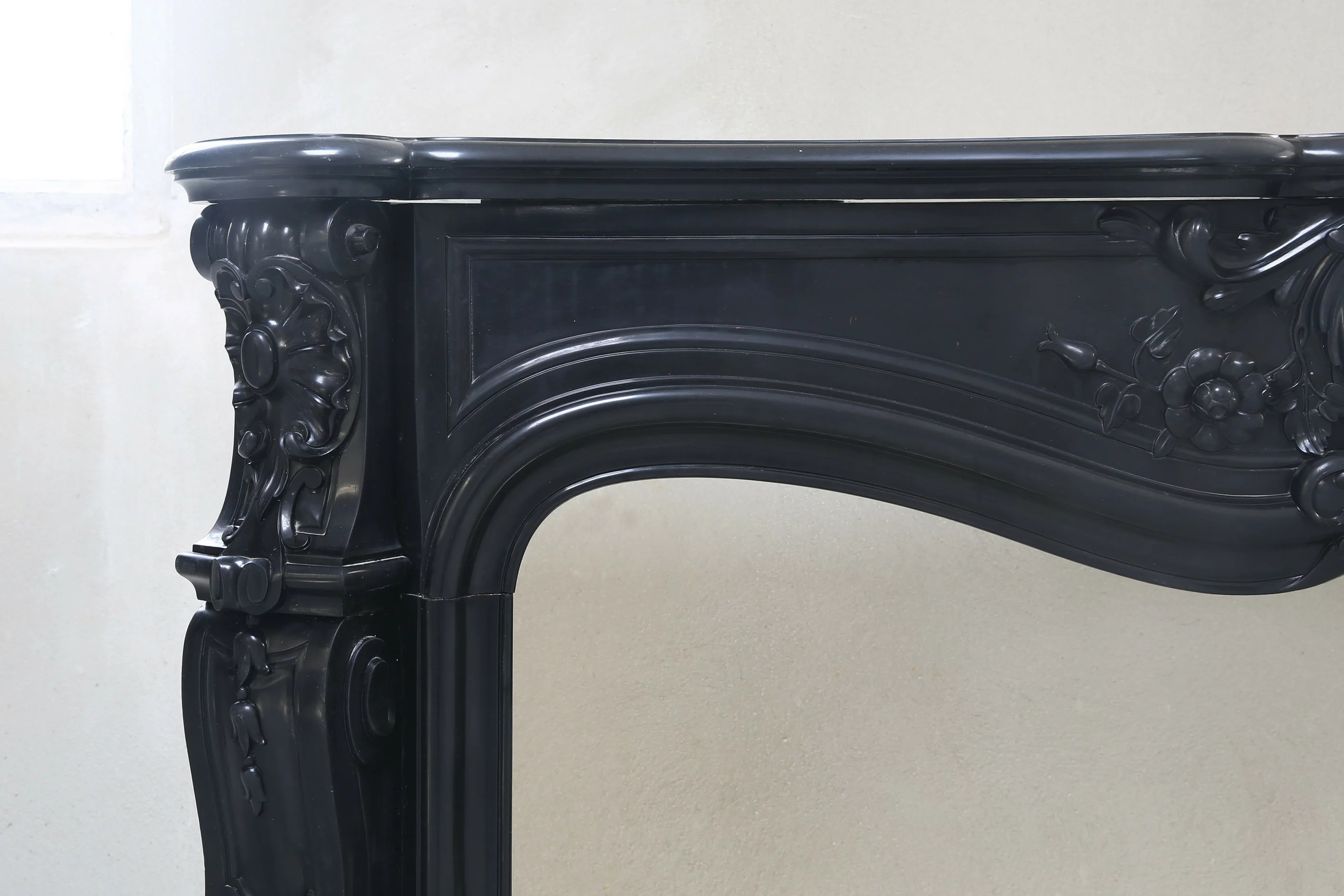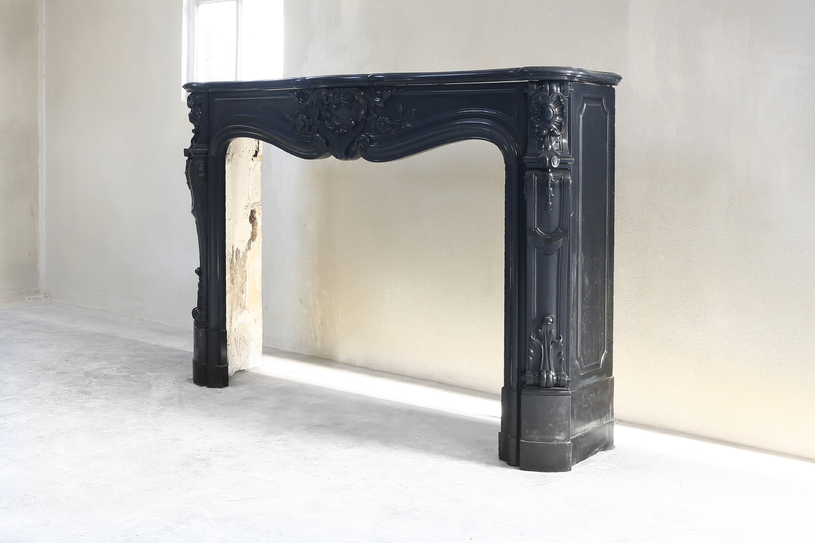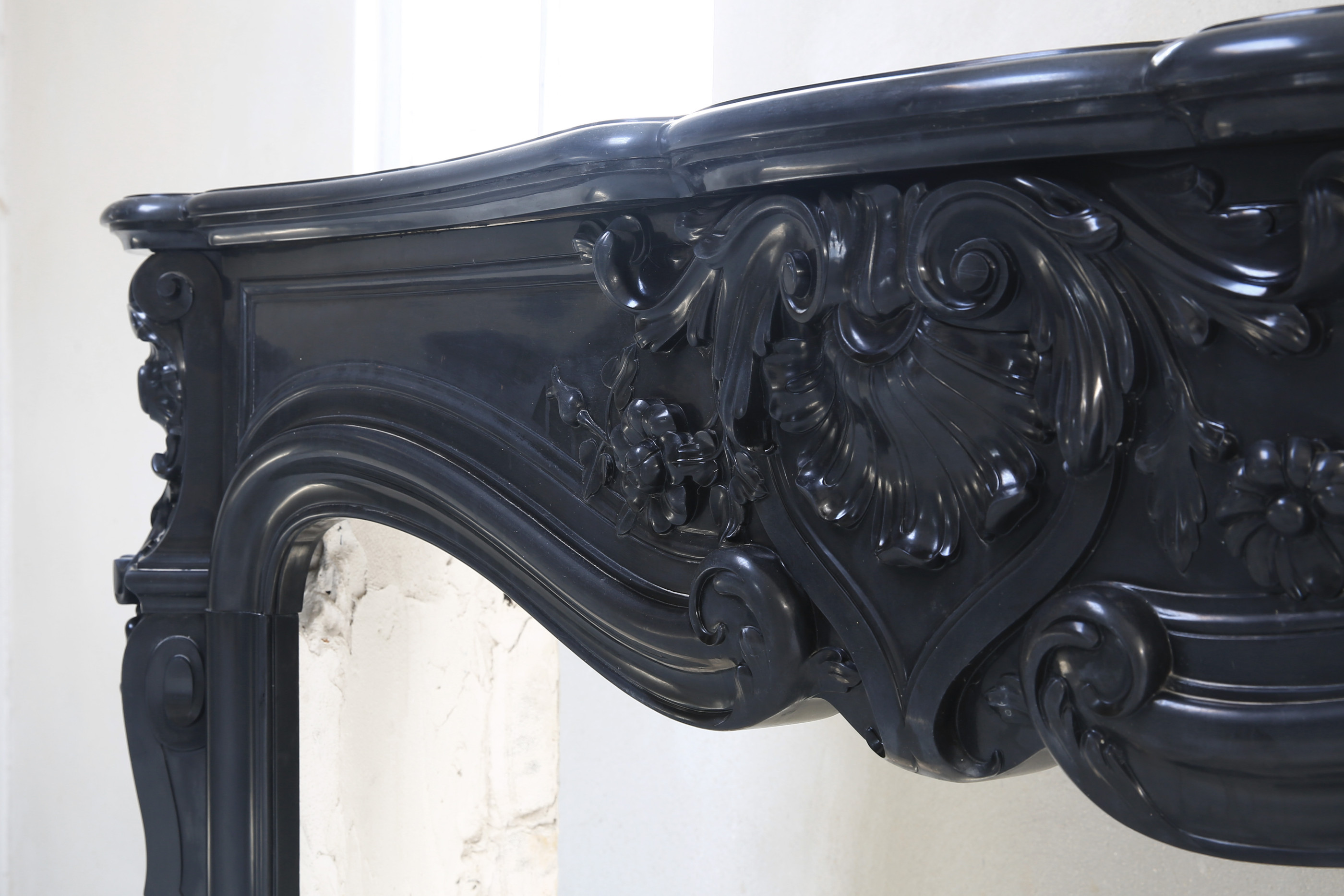 Ein wunderschöner 'Noir de Mazy' Kamin. Noir de Mazy ist eine schwarze Marmorsorte und stammt aus Belgien. Diese Art von Kamine wird immer seltener, weil die Steinbrüche in Belgien fast geschlossen sind. Dieser Kamin stammt aus dem 19. Jahrhundert und ist im Stil von Louis XV. Mit drei kunstvoll geschnitzten Jakobsmuscheln, eine in der Mitte der Kamin und zwei auf beiden Seiten der Beine. Diese Kamin ist in einem sehr guten Zustand und strahlt Wärme und Atmosphäre aus! Ein wunderschönes Exemplar für viele Häuser!
