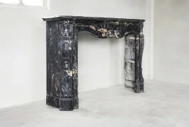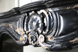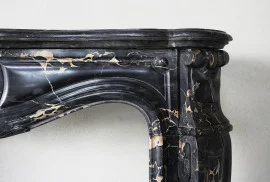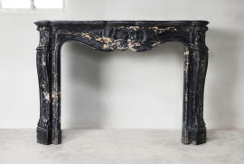 Ein seltener antiker Marmorkamin von alte Portoro Marmor aus der Toskana. Portoro Marmor ist einer der elegantesten italienischen Marmorgesteine. Der schwarze Hintergrund mit goldenen Adern sorgt für Luxus und Exklusivität. Der Kamin ist im Stil von Louis XV. Und stammt aus dem 19. Jahrhundert. Ausgestattet mit einer schönen Jakobsmuschel in der Blattmitte. Die Beine sind ebenfalls mit Ornamenten verziert. Ein schicker Kamin mit einer warmen Ausstrahlung, der perfekt in ein modisches, ländliches oder klassisches Zuhause passt!