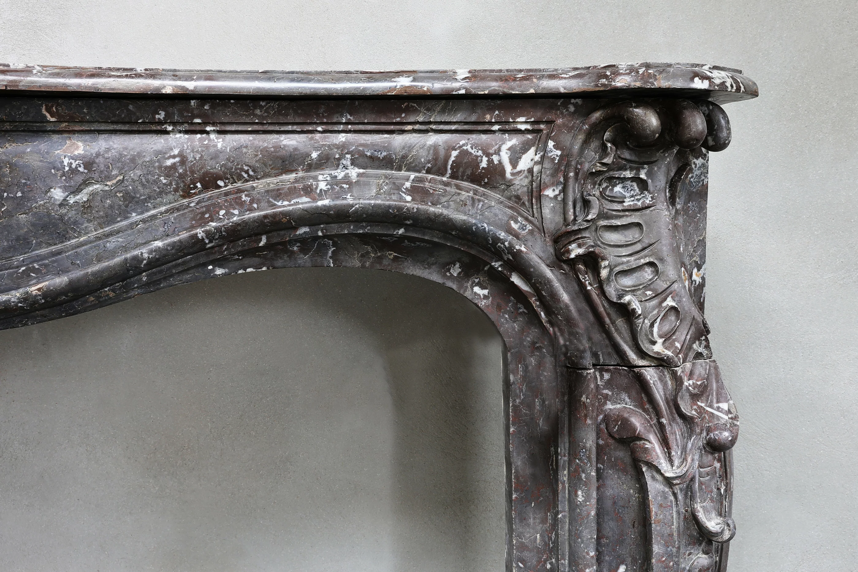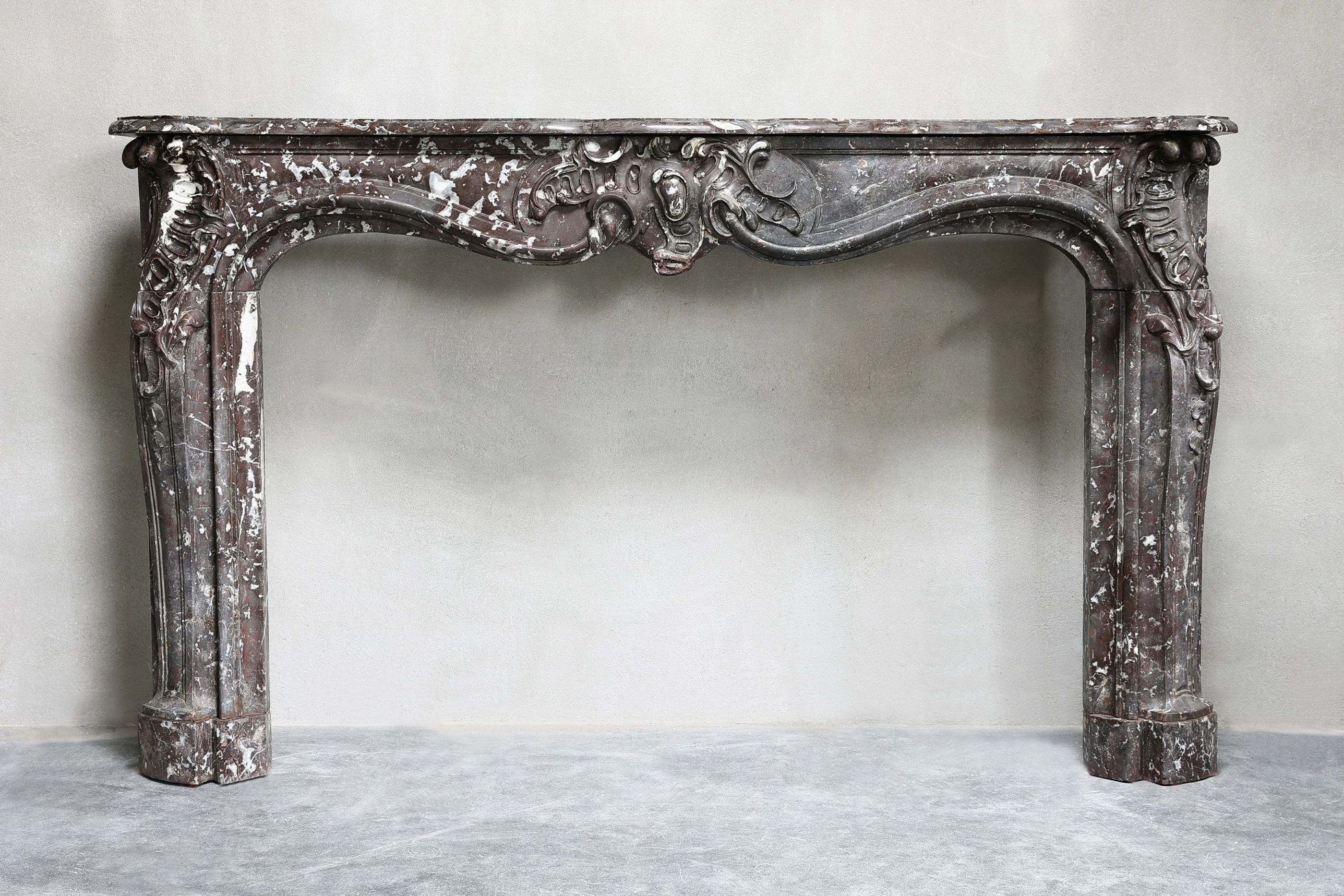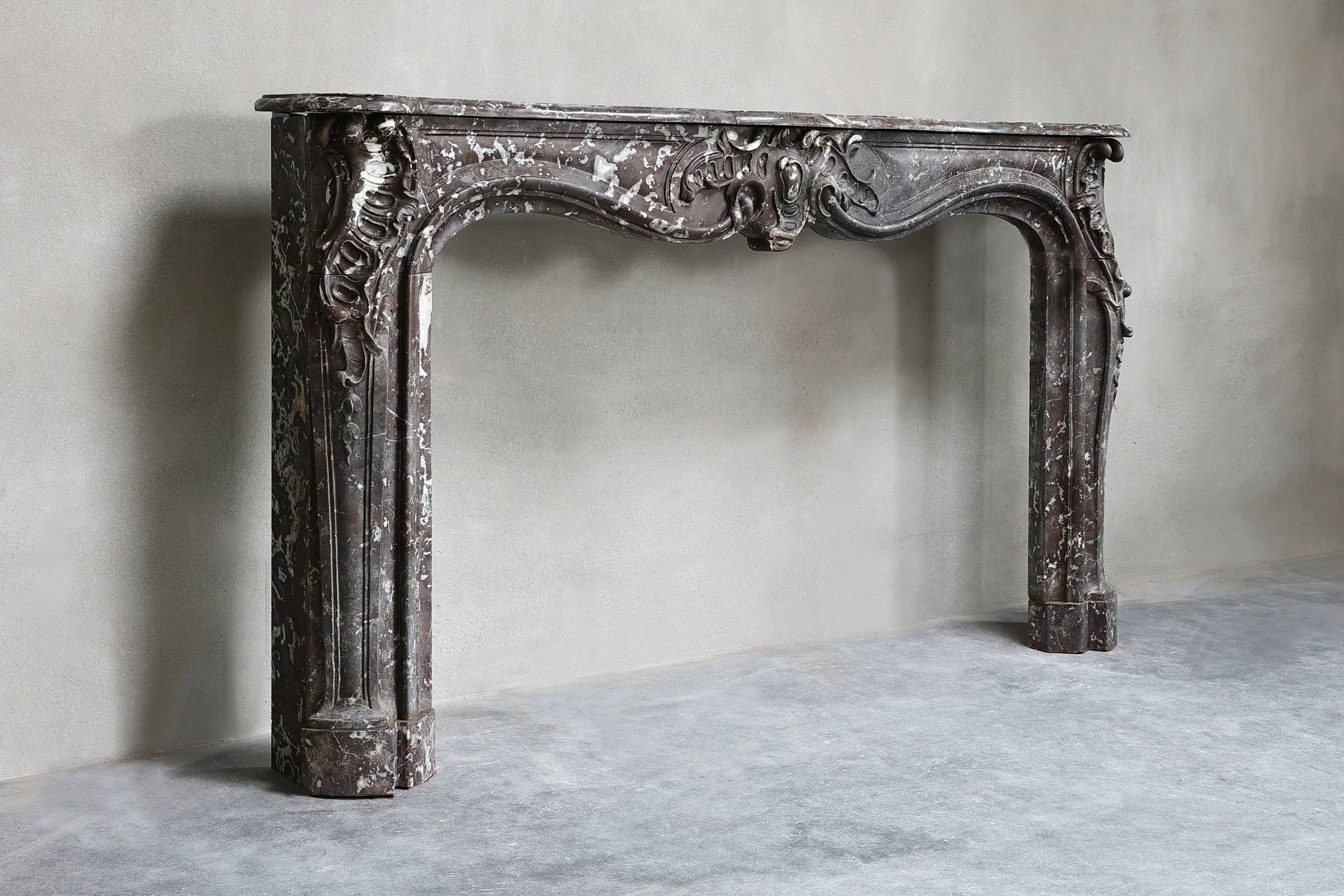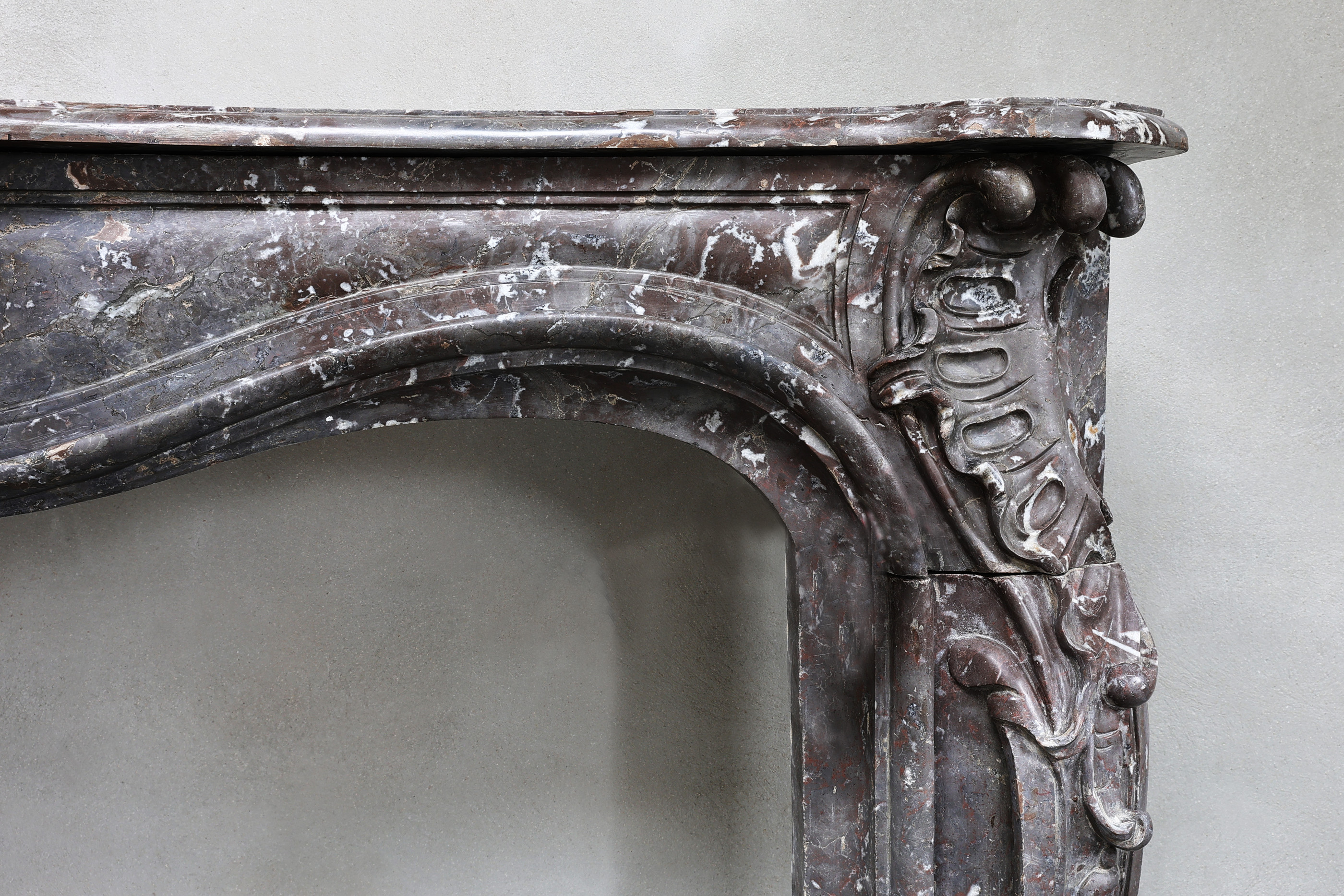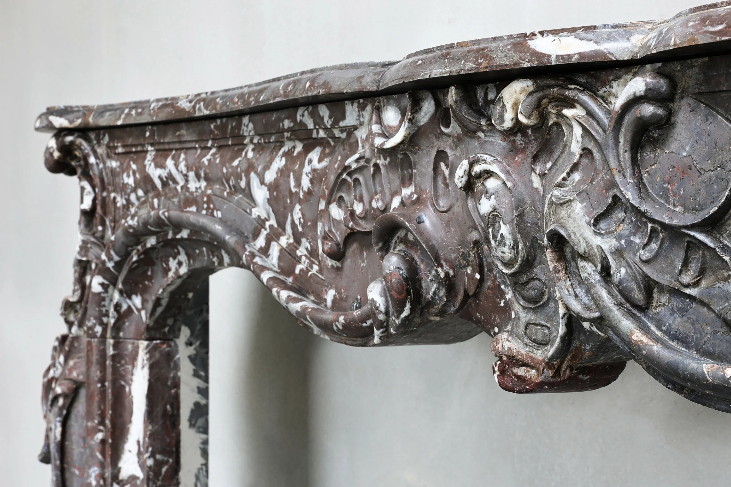 Sehr beeindruckender antiker Marmorkamin im Stil von Louis XV. Die Größe ist außergewöhnlich groß für einen Marmorkamin, 203 cm breit! Der Kamin hat eine schöne Jakobsmuschel in der Mitte und schöne Ornamente sind auch an den Enden des vorderen Teils sichtbar! Diese hellen Adern passen gut zu der warmen braunen Farbnuance.