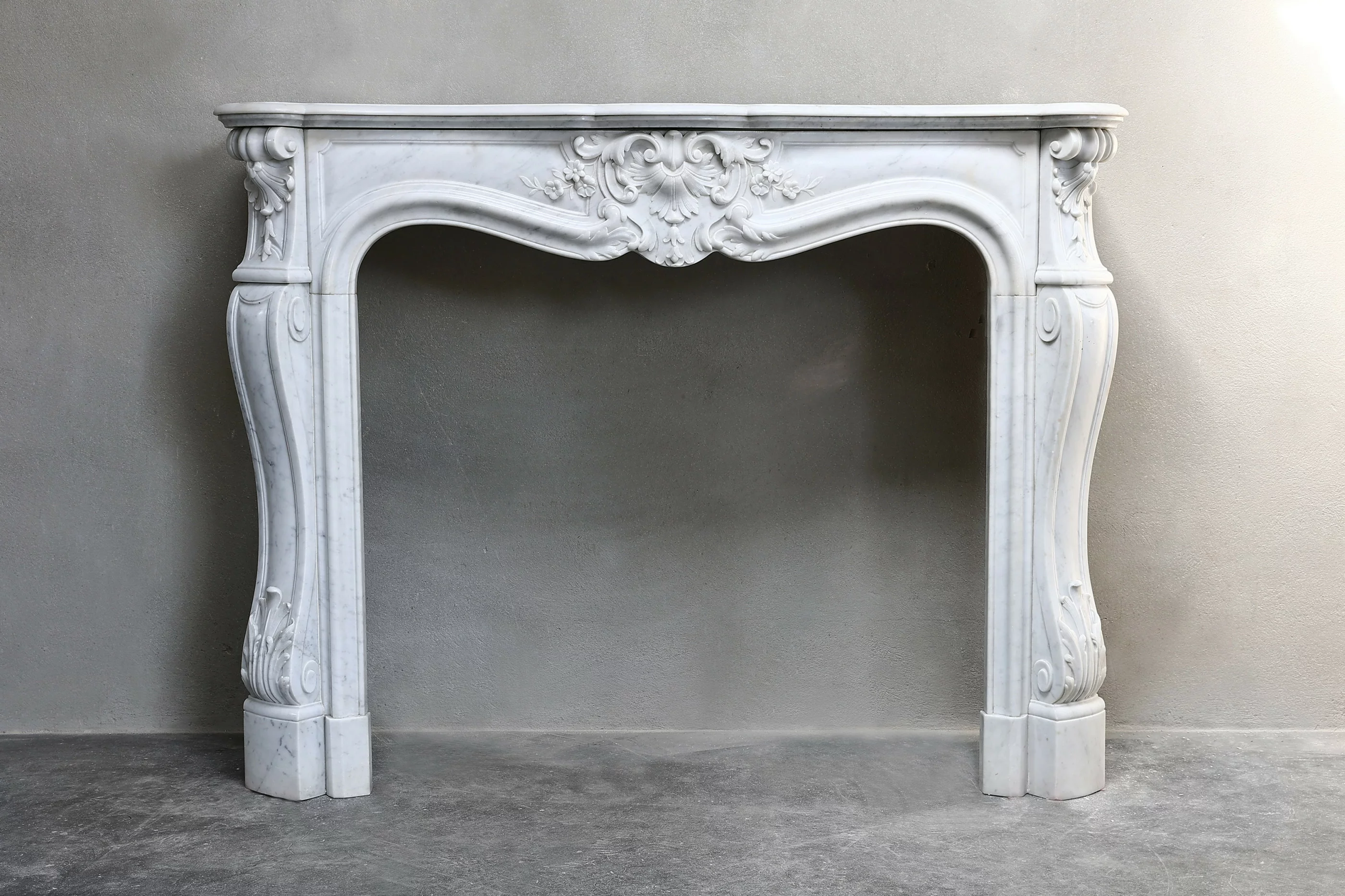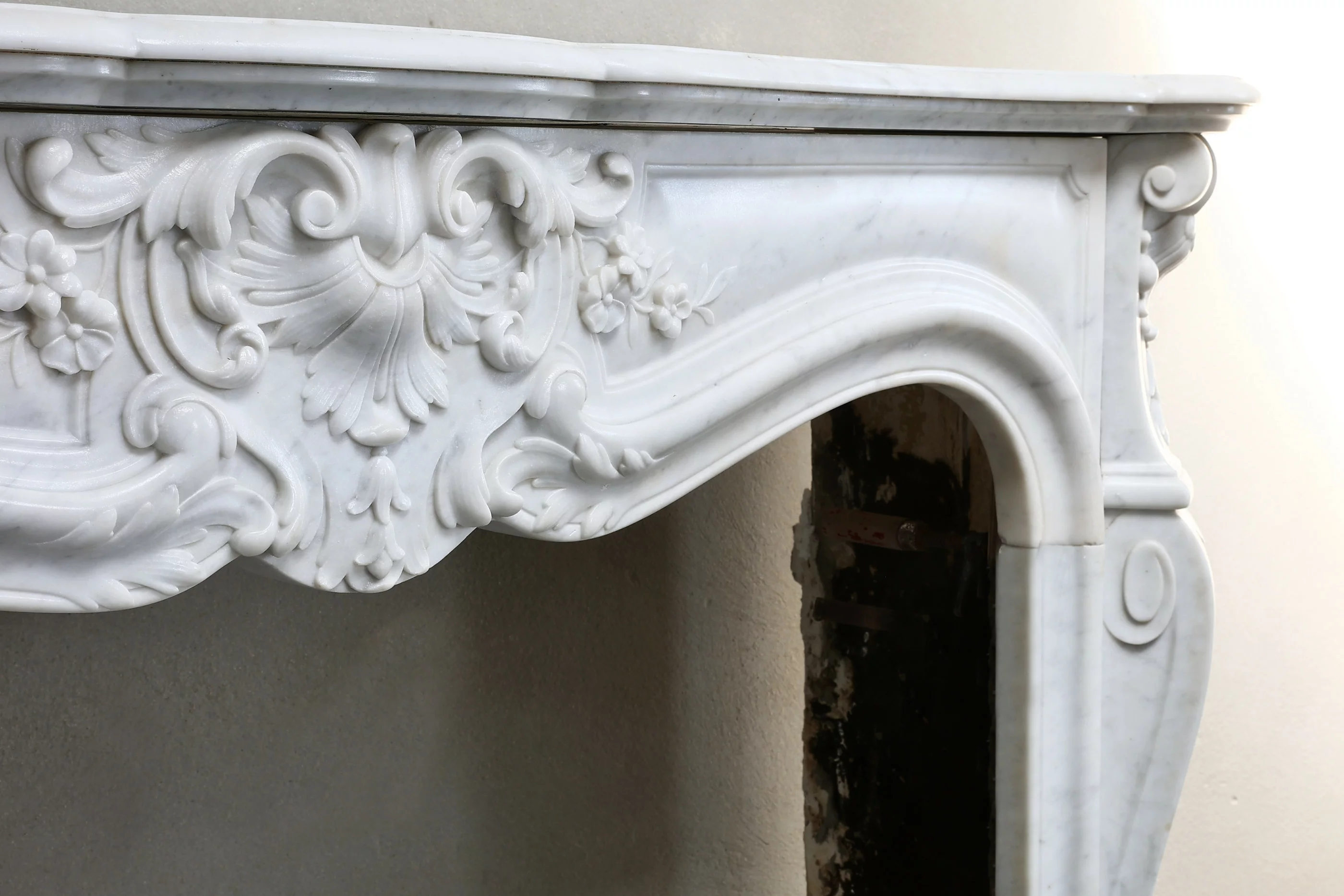 Antiker Kamin aus Carrara-Marmor im Stil Louis XV aus dem 19. Jahrhundert. Dieser elegante Kamin ist mit einer Jakobsmuschel in der Mitte des Vorderteils verziert und an den Beinen verziert. Ein schicker Kamin mit originalen Gittern an den Seiten.