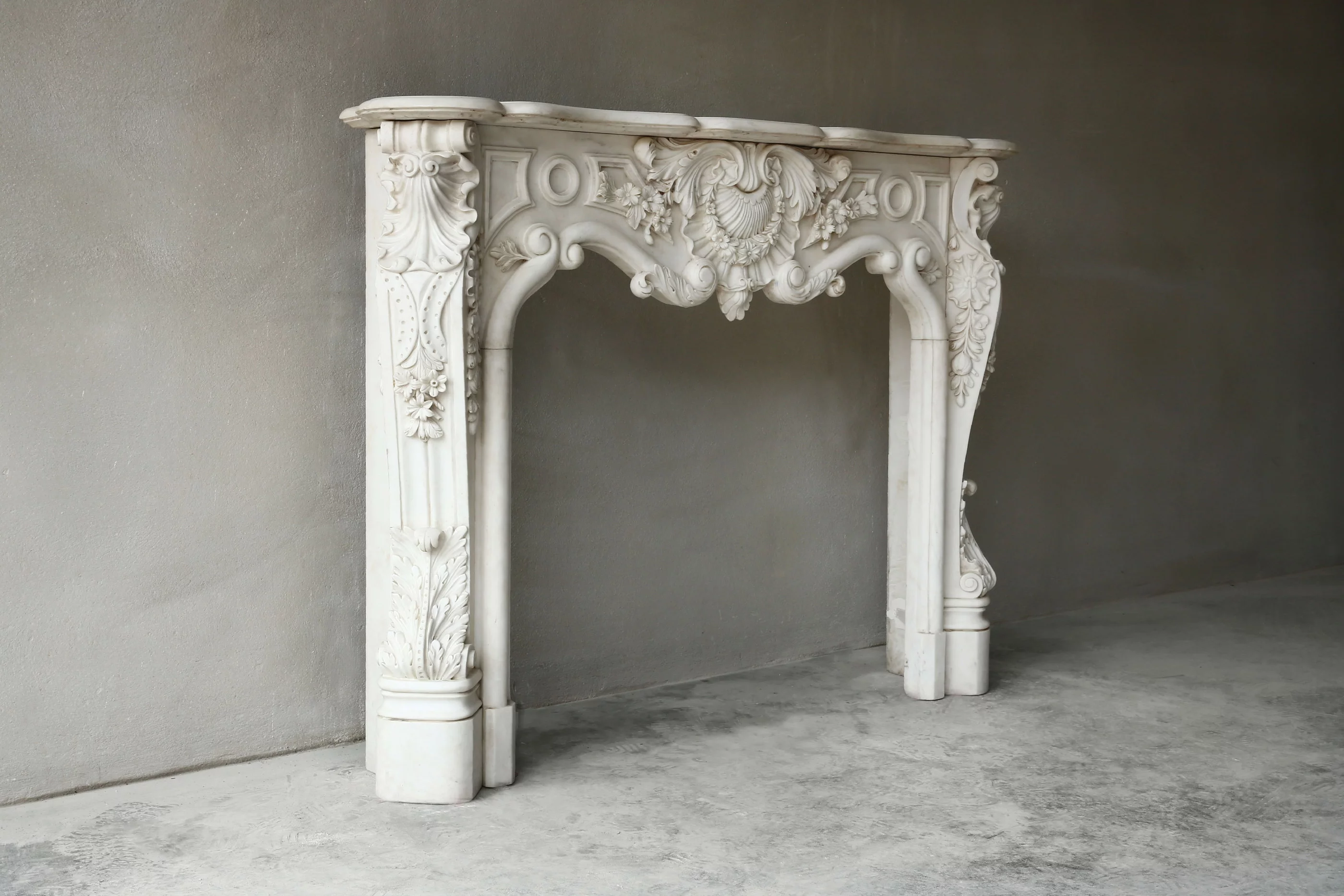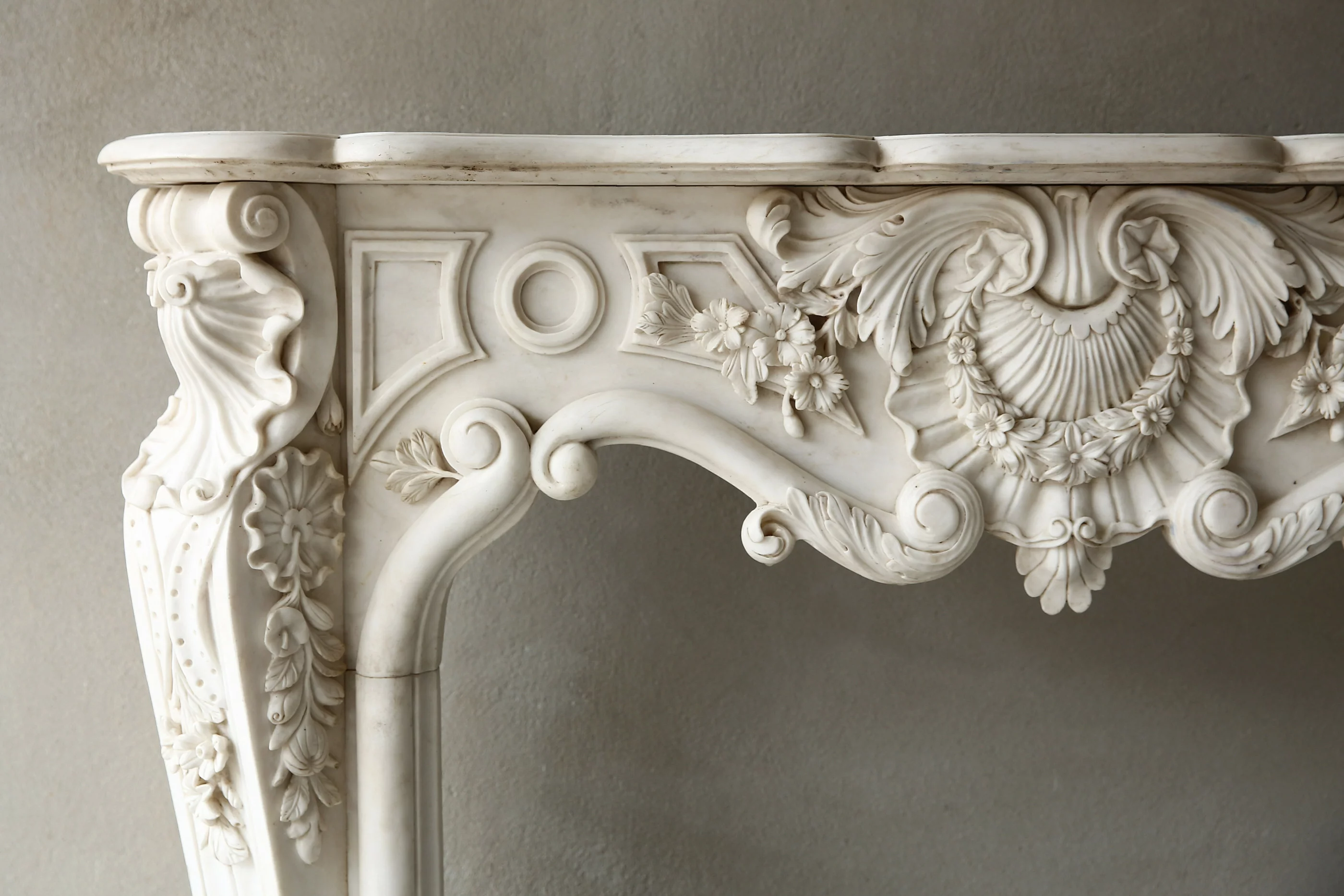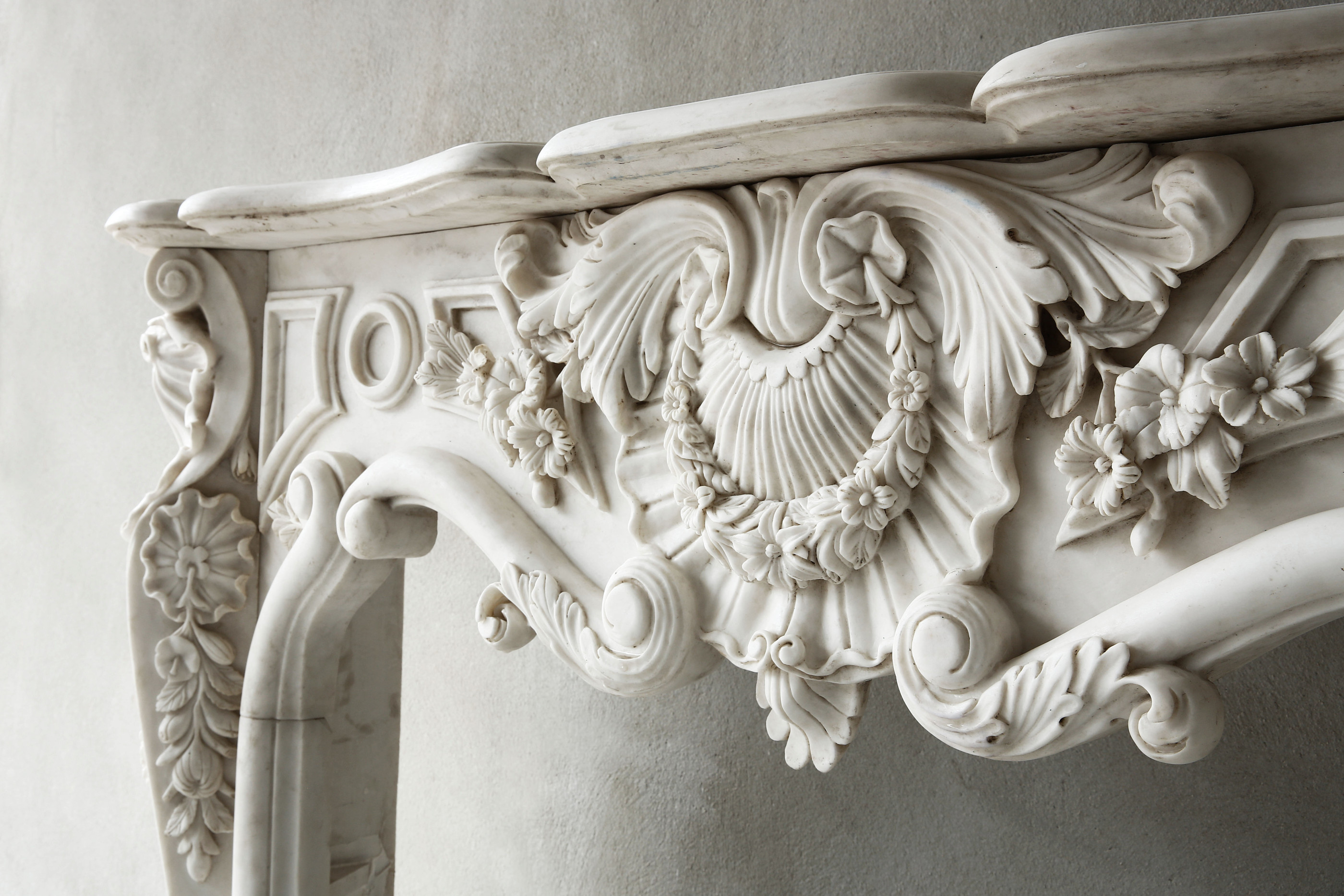Dieser wunderschön gestaltete antike Marmorkamin stammt aus der Barockzeit. Die Barockzeit ist geprägt von einer Fülle von Formen und Dekorationen, wie Sie sehen. Besonders Dekorationen wie Locken, Muscheln, Akanthusblätter und Rosetten werden oft bei dieser Art von Feuer gesehen! Ein Unikat für uns, zum Teil wegen des exklusiven Marmortyps Statuario, einem weißen Marmor aus Italien.