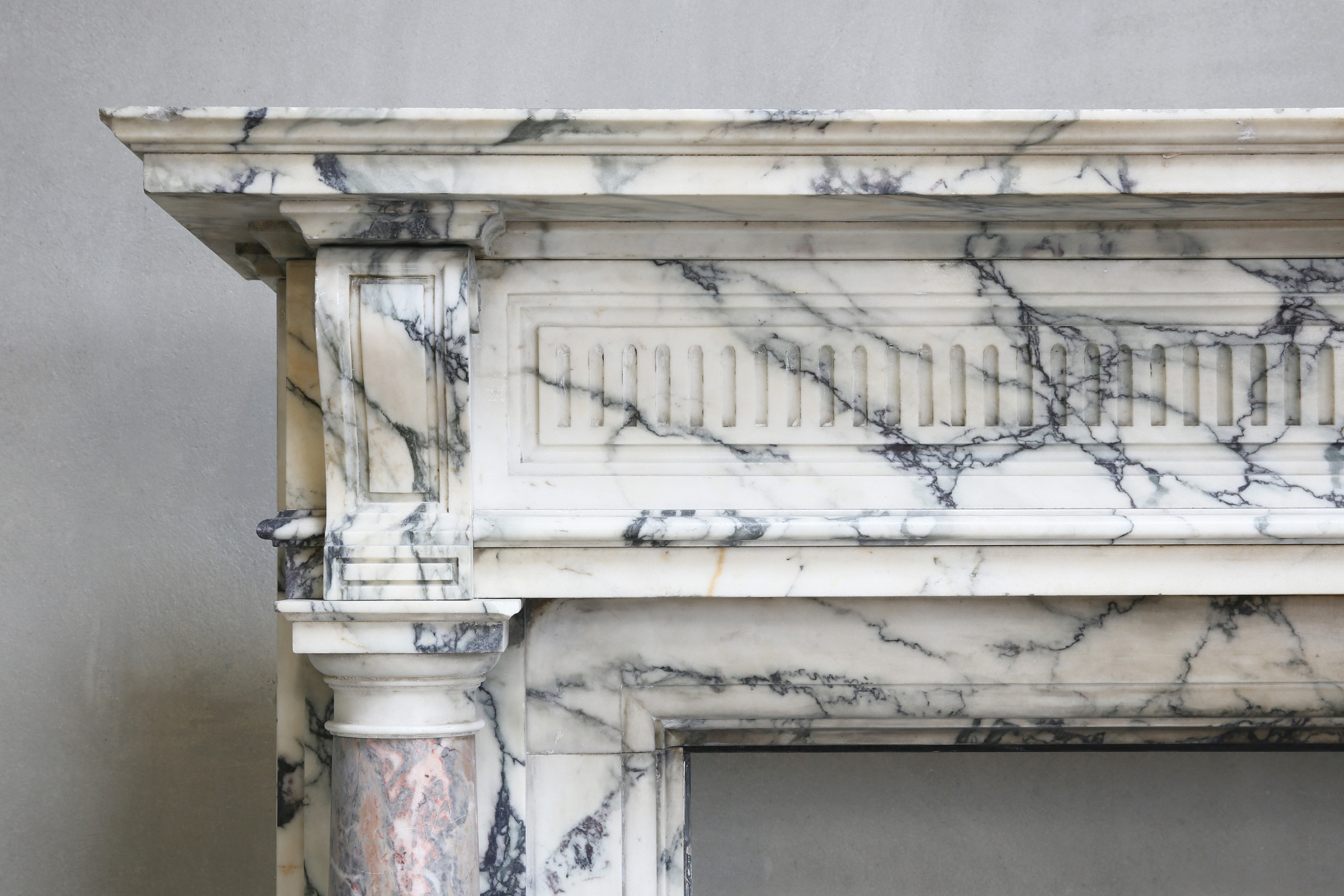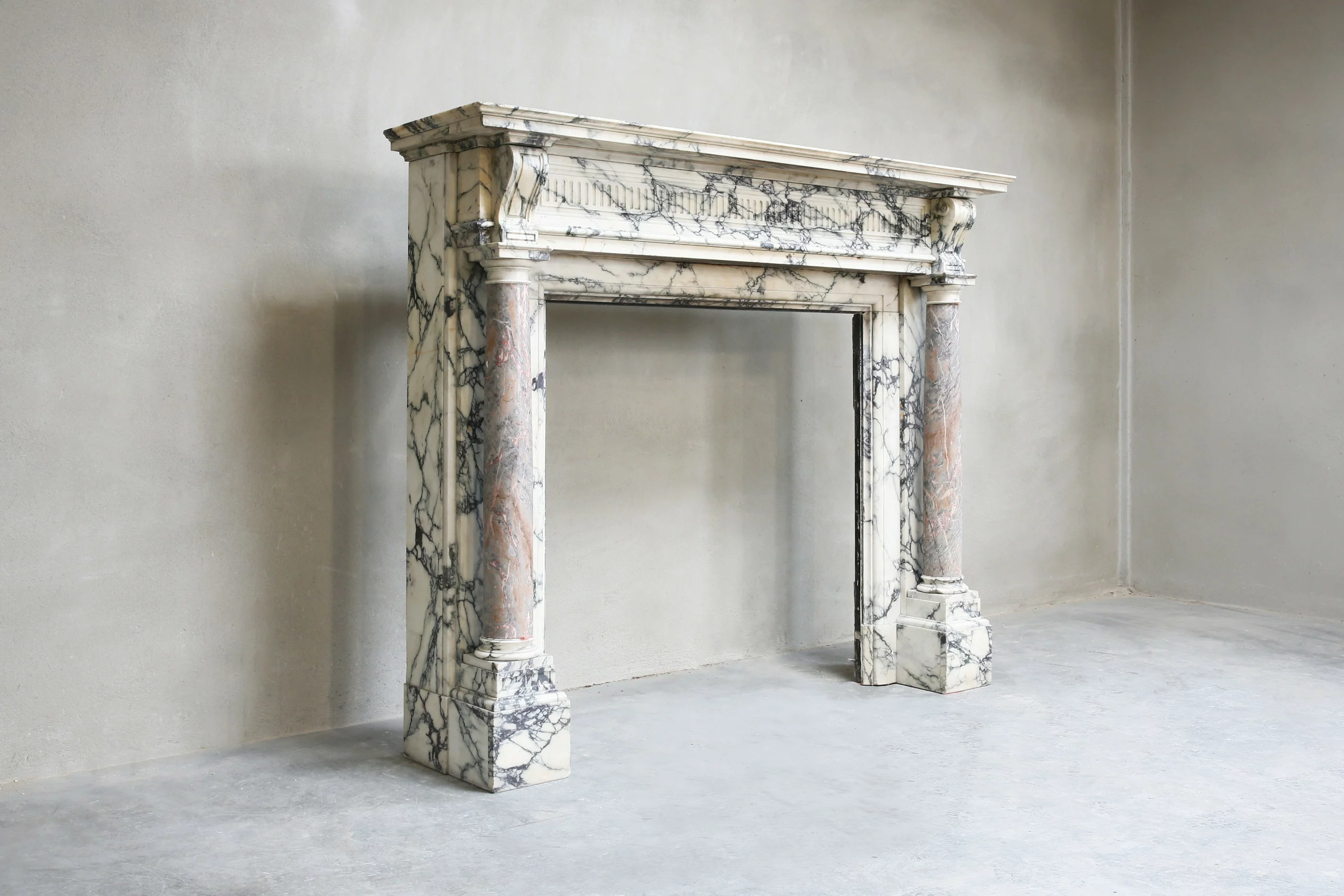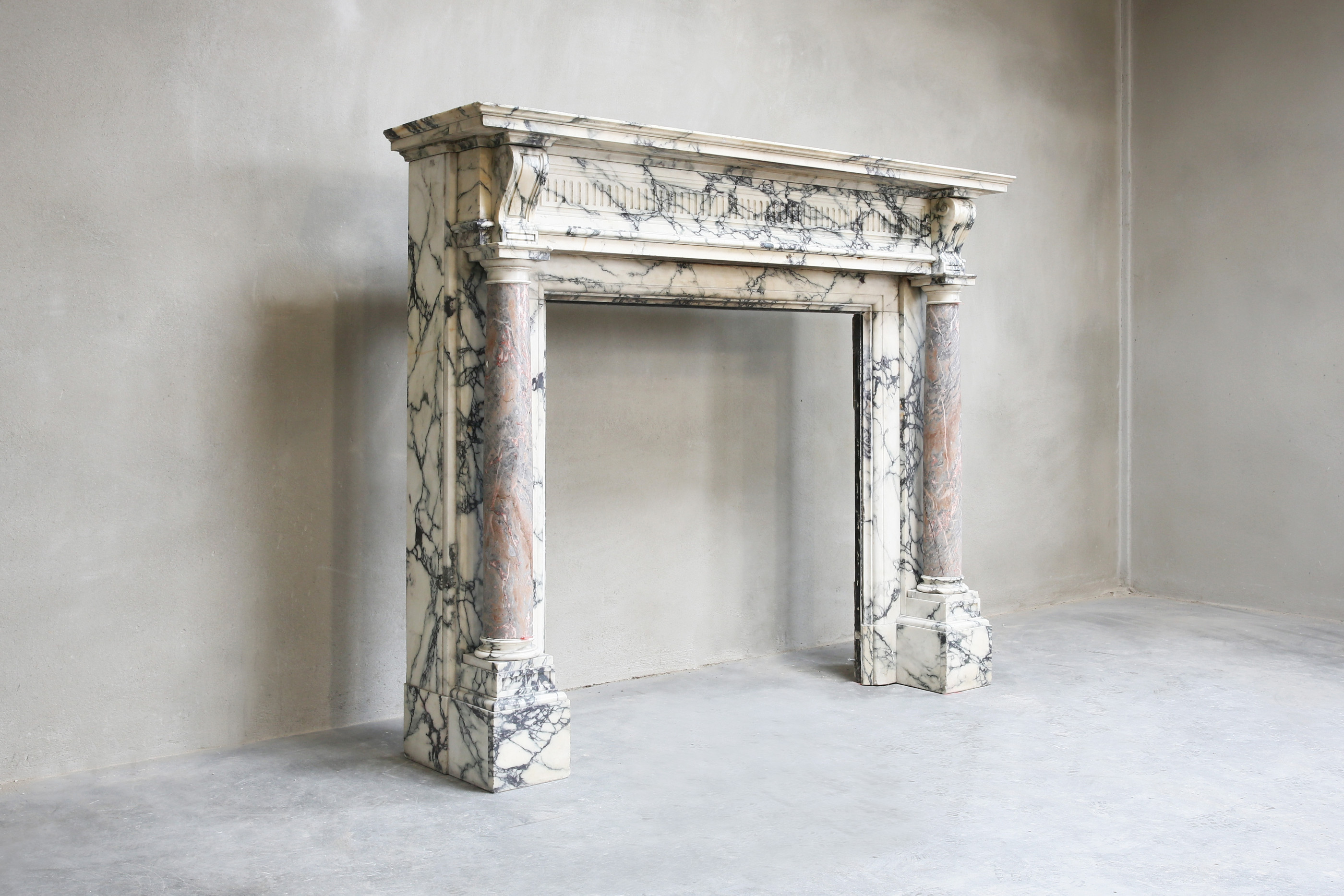 Wir sind stolz darauf, diesen wunderschönen antiken Marmorkamin zu präsentieren! Ein Juwel in unserer Sammlung. Dieser Kamin besteht aus zwei exklusiven Marmorsorten: Der größte Teil besteht aus Paonazzo-Marmor und die beiden Säulen an den Beinen sind mit Sarrancolin-Marmor ausgestattet. Ein reich verzierter Kamin mit einer charismatischen Erscheinung. Dieser Kamin stammt aus dem Jahr 1880 und ist im Stil von Ludwig XVI.