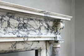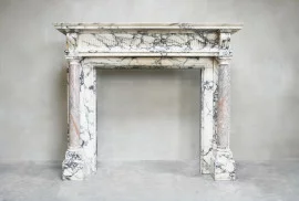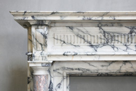 Wir sind stolz darauf, diesen wunderschönen antiken Marmorkamin zu präsentieren! Ein Juwel in unserer Sammlung. Dieser Kamin besteht aus zwei exklusiven Marmorsorten: Der größte Teil besteht aus Paonazzo-Marmor und die beiden Säulen an den Beinen sind mit Sarrancolin-Marmor ausgestattet. Ein reich verzierter Kamin mit einer charismatischen Erscheinung. Dieser Kamin stammt aus dem Jahr 1880 und ist im Stil von Ludwig XVI.