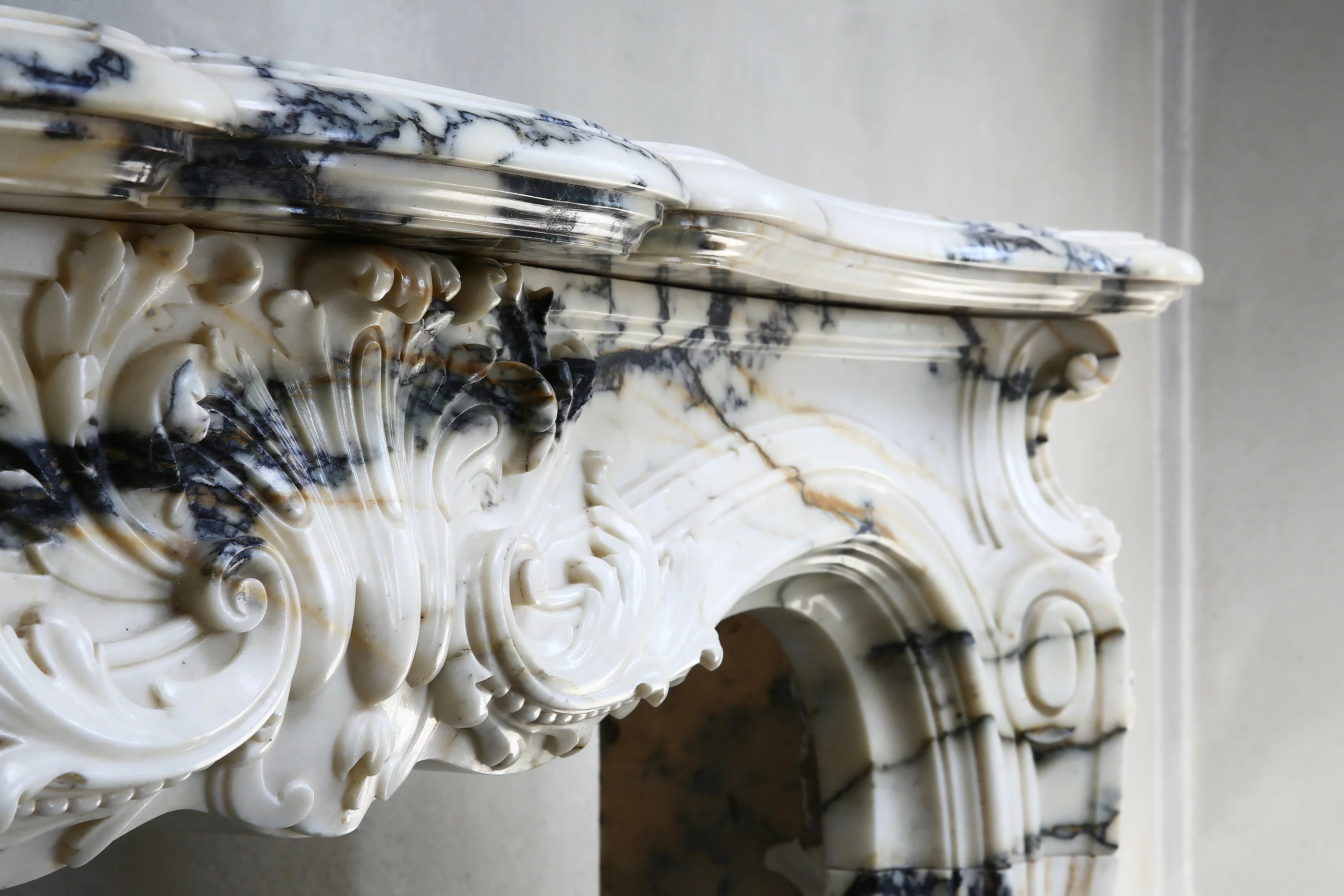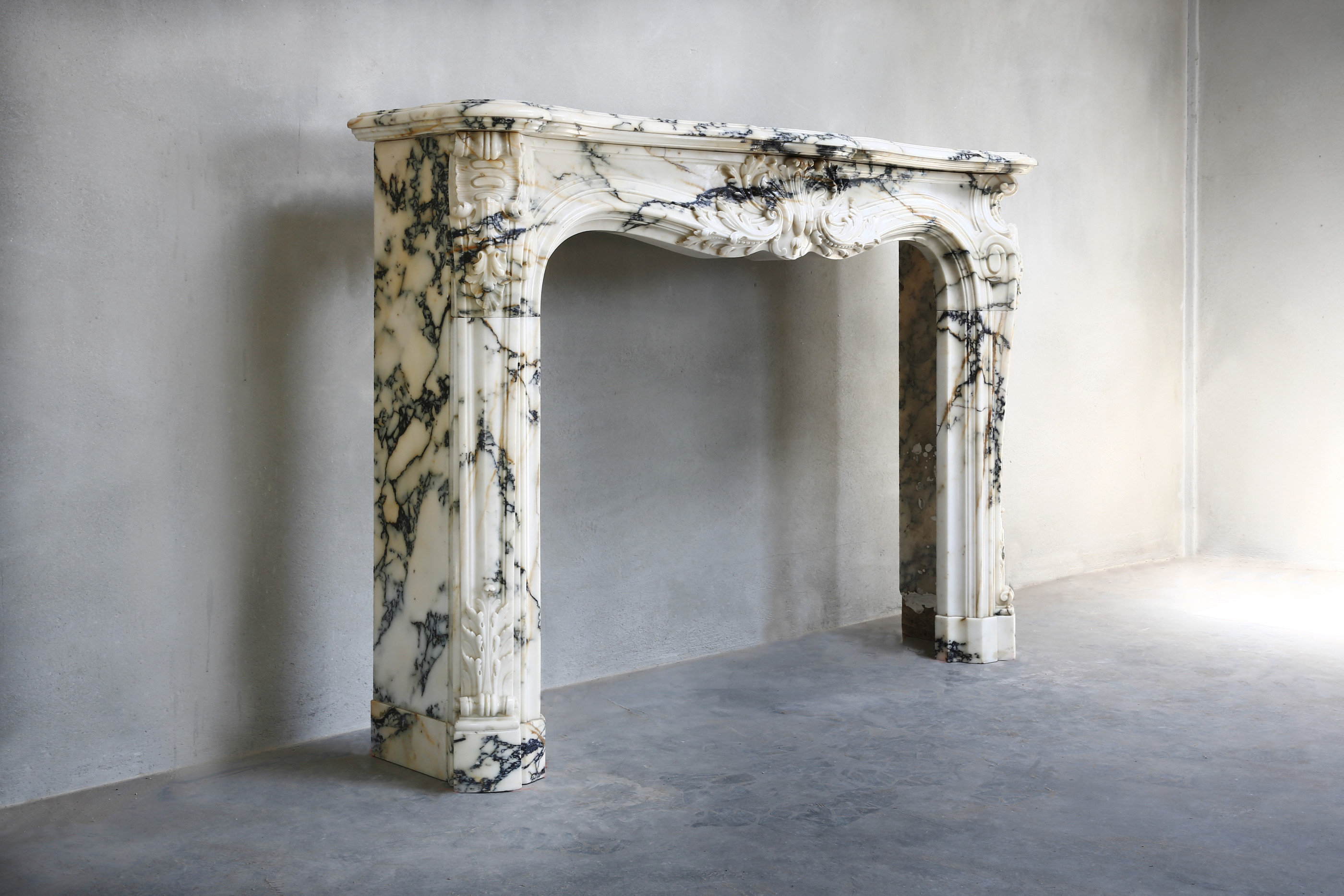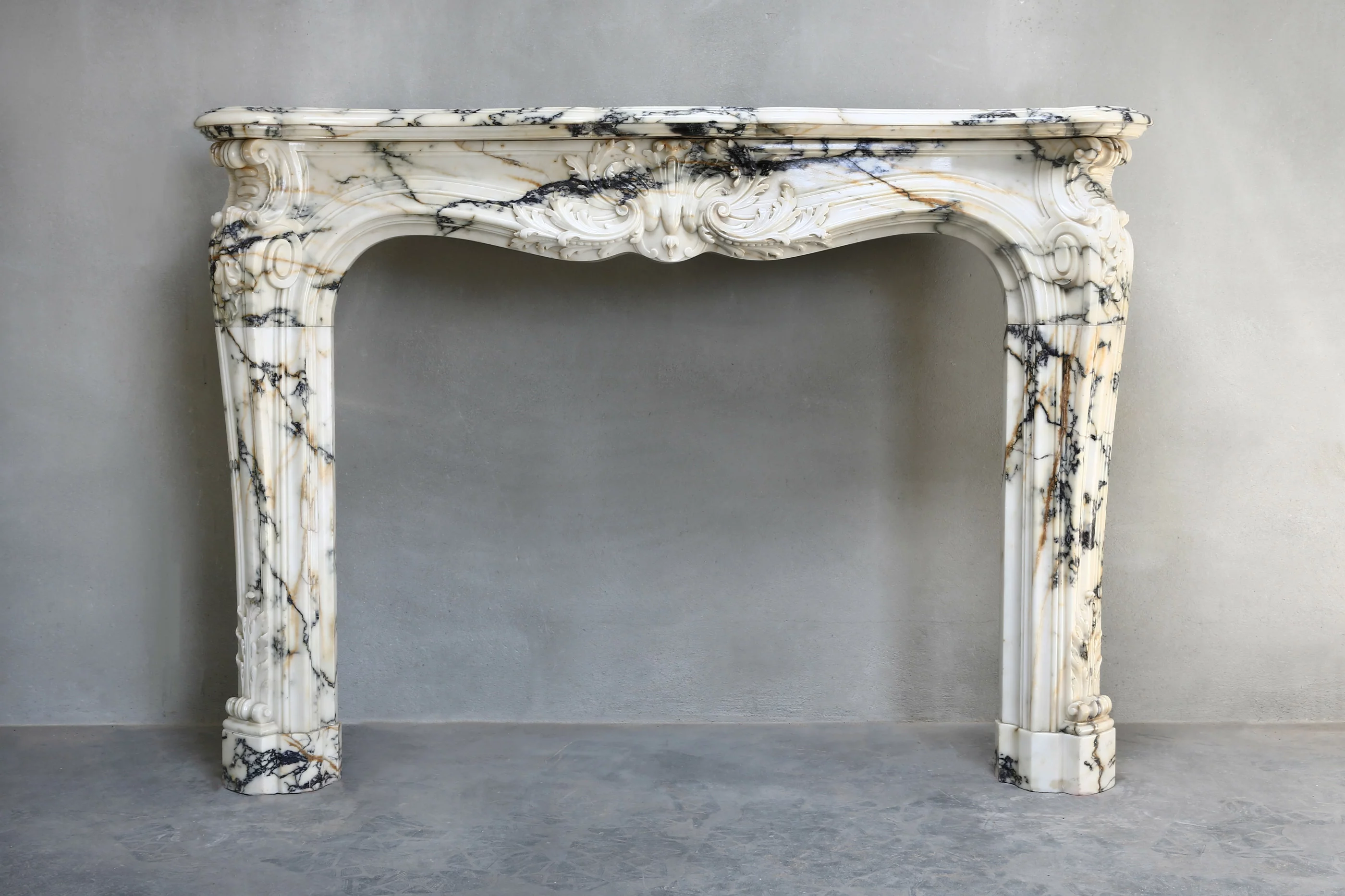 Sehr exklusiver antiker Marmorkamin aus dem Jahr 1820! Der Marmortyp dieses schönen Kamins ist Paonazzo-Marmor aus der Toskana. Die Merkmale von Paonazzo-Marmor sind die Vielfalt der Farben und der Zusammensetzung. Die hohe Dosis Eisenoxid erzeugt einen warmen orange / gelben Farbe, der durch die Venen fließt. Dieser beeindruckende Mantel ist im Stil von Louis XV aus der Rococco Regence-Zeit! Wir haben diesen Kamin vom Hotel de Paris aus Paris zerlegt. Die Jakobsmuschel in der Mitte des Vorderteils mit durchgehenden Verzierungen an den Beinen bildet ein anmutiges Ganzes. Ein sehr schöner Kamin, der für jedes Interieur wertvoll ist!